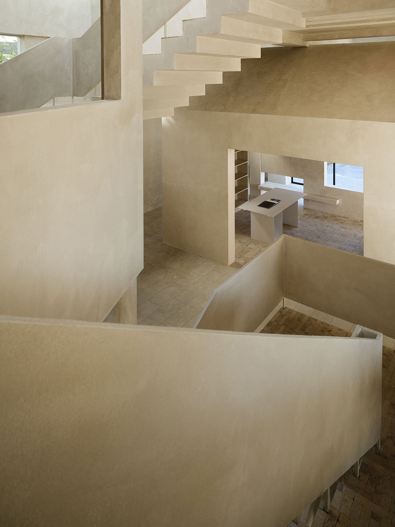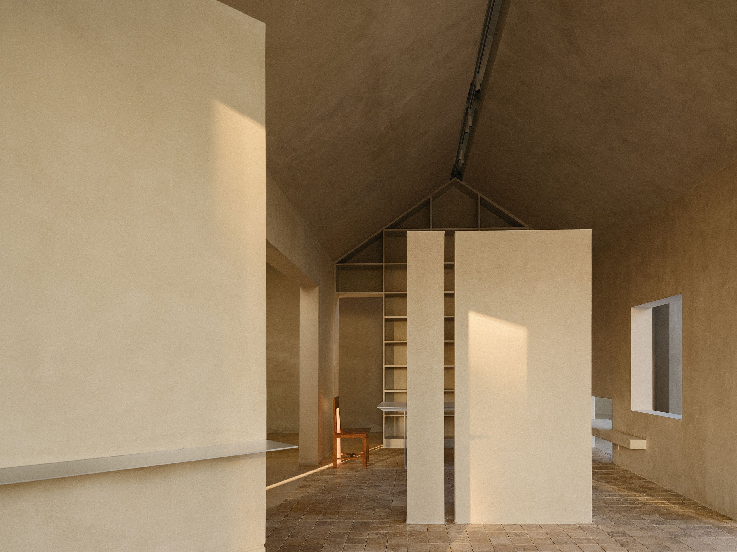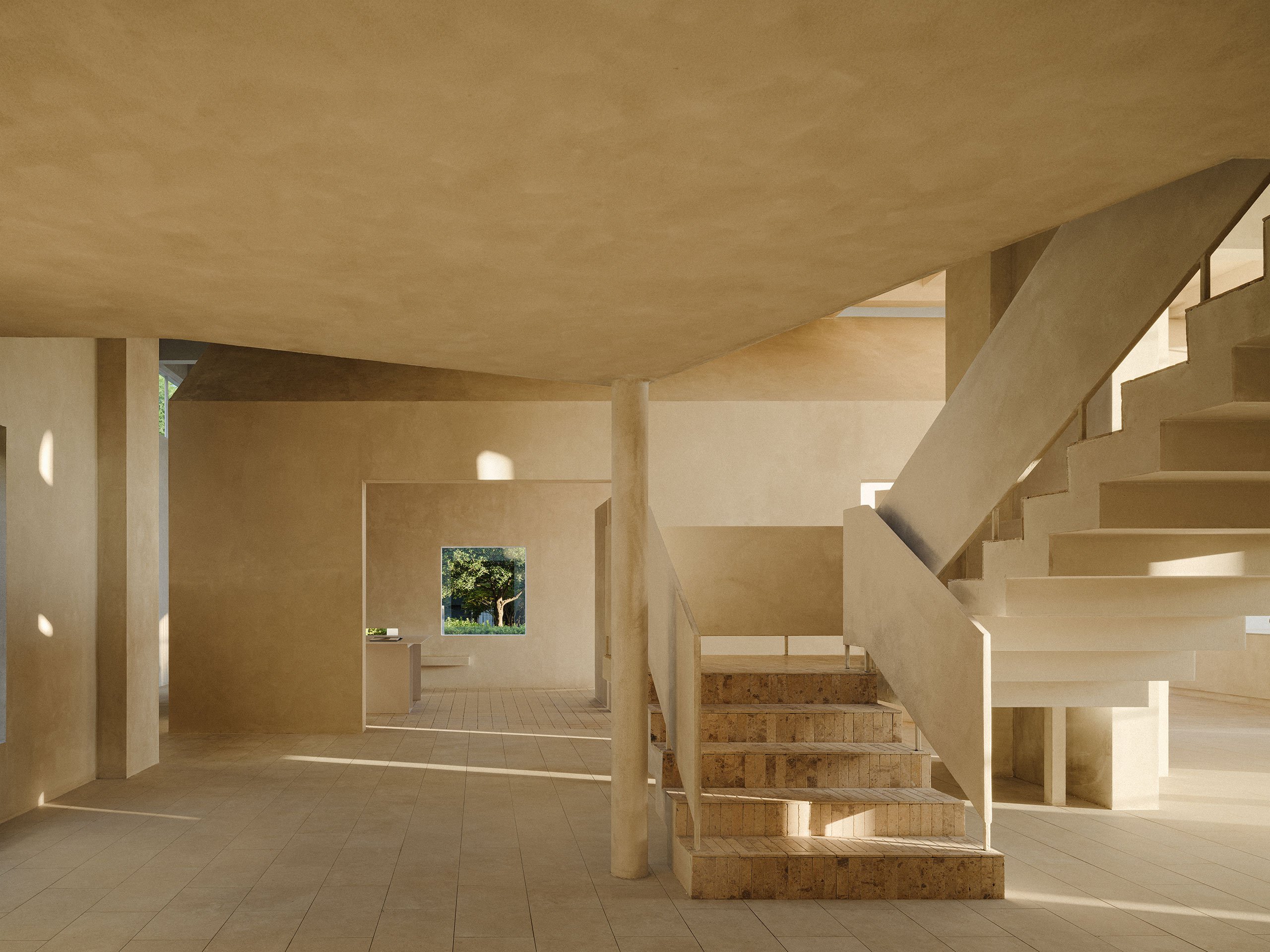 The lime plastered walls serve as an understated yet versatile backdrop for exhibitions, providing a neutral canvas that highlights the displayed works without distraction. At the same time, they poetically enhance the changing hues of daylight, reflecting warm tones at sunrise and cooler shades as the sun sets, further connecting the interiors to the natural world outside.