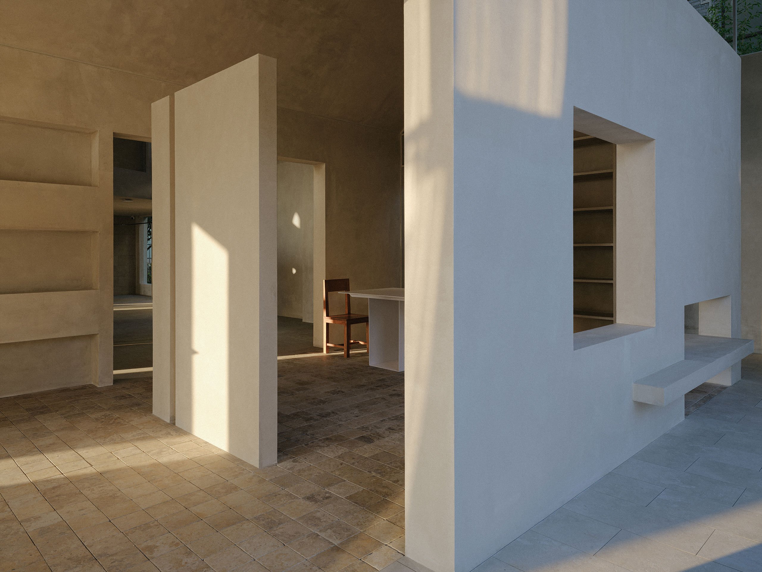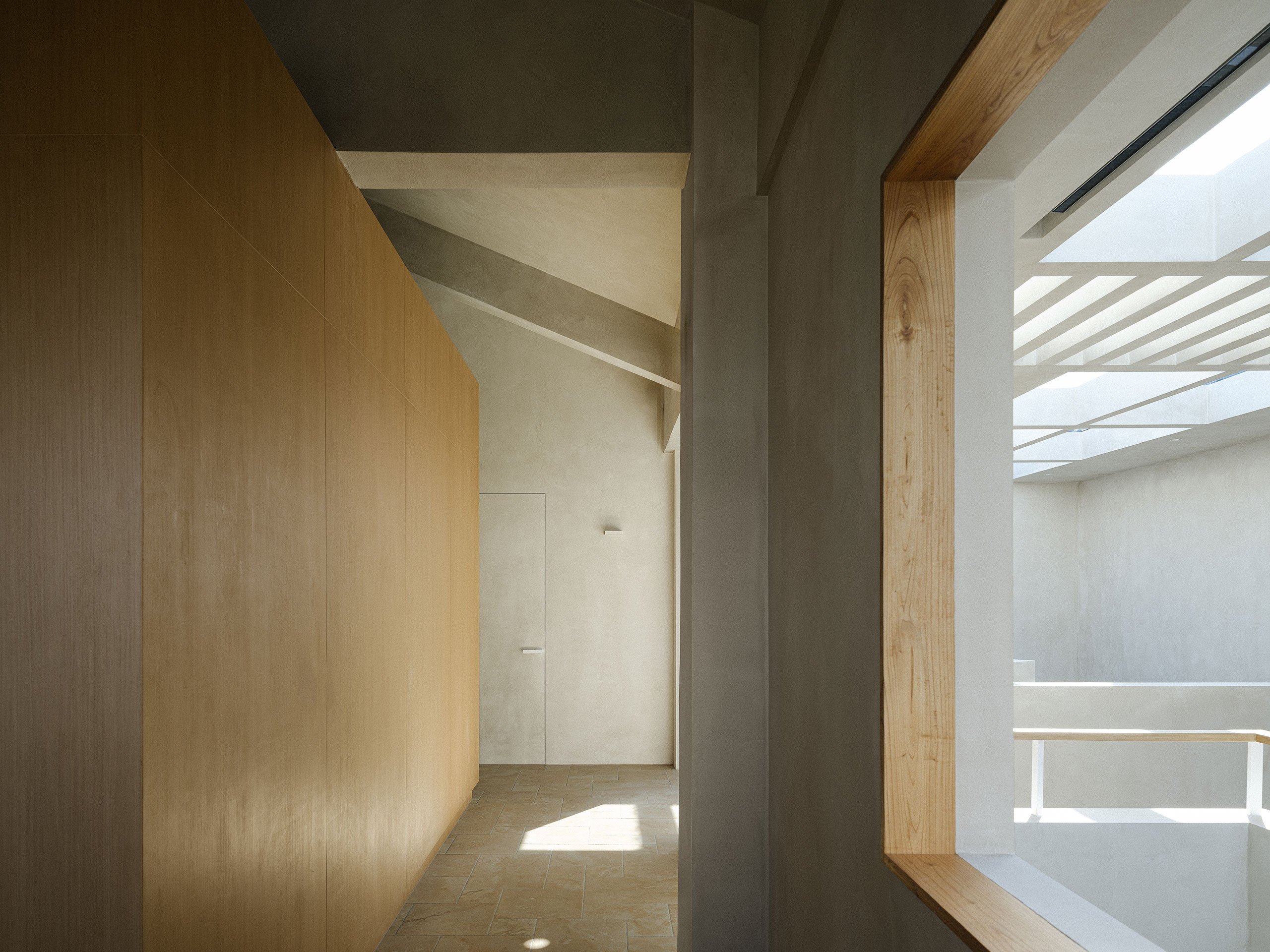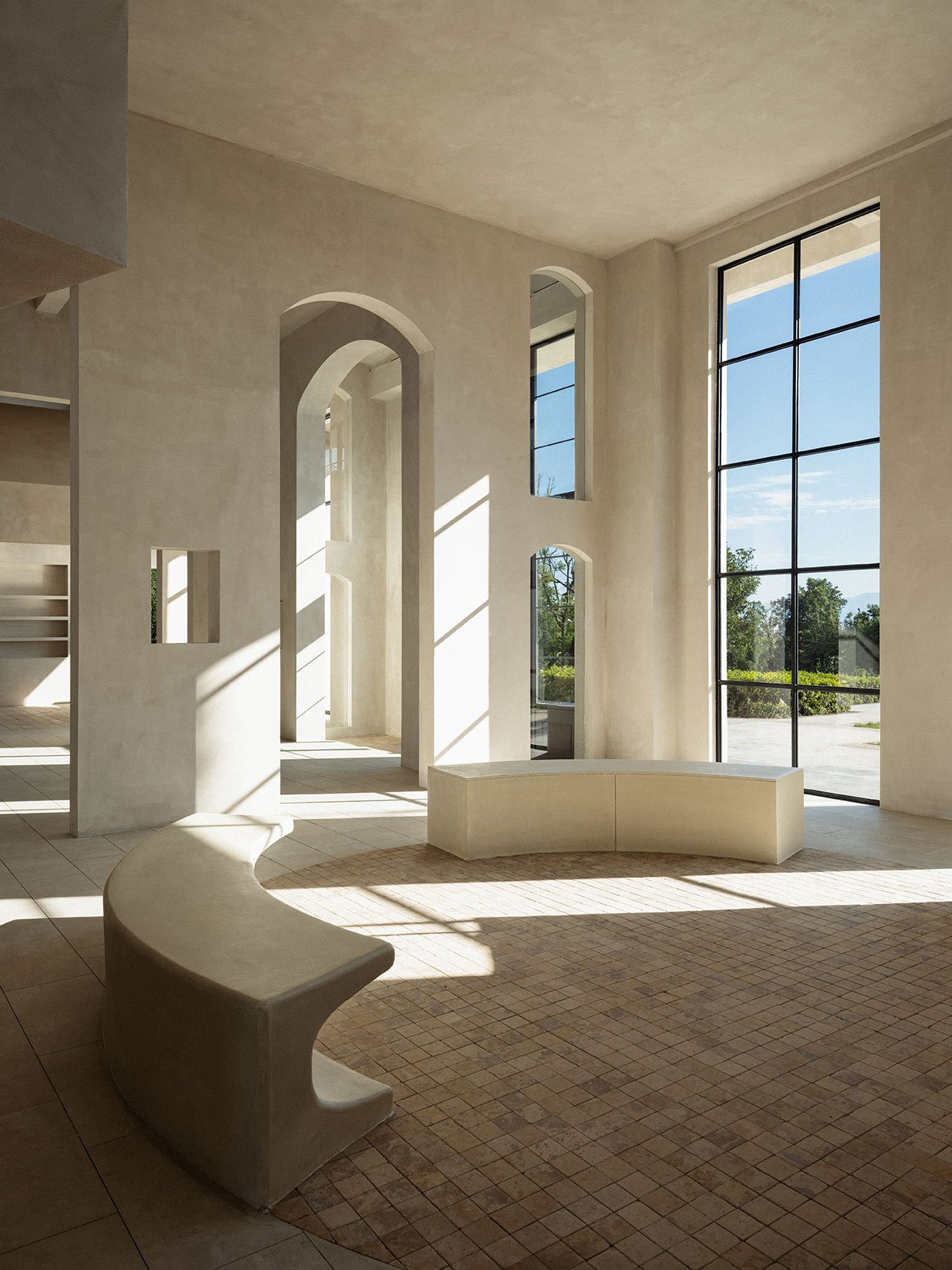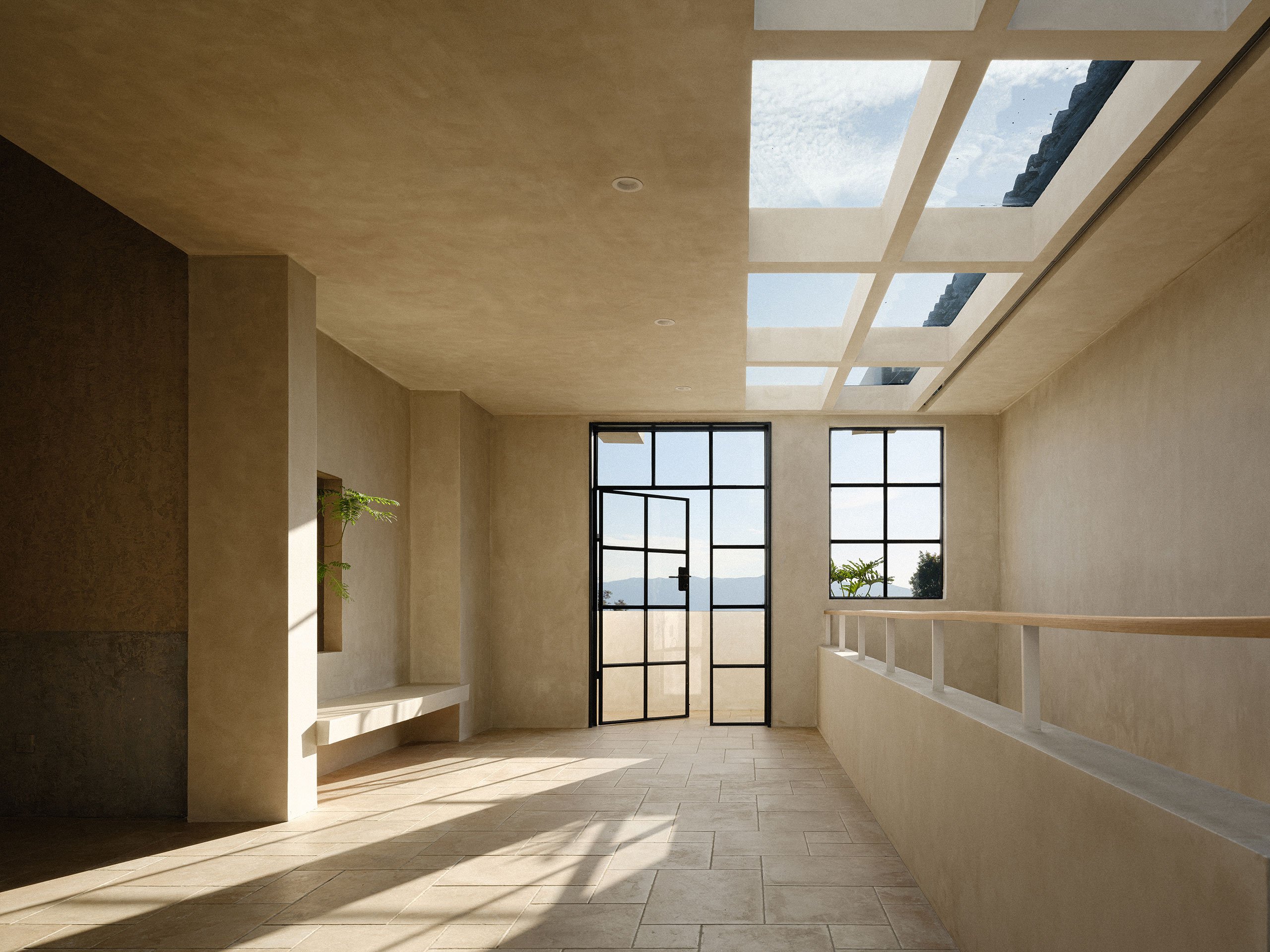The lime plastered walls serve as an understated yet versatile backdrop for exhibitions, providing a neutral canvas that highlights the displayed works without distraction. At the same time, they poetically enhance the changing hues of daylight, reflecting warm tones at sunrise and cooler shades as the sun sets, further connecting the interiors to the natural world outside.