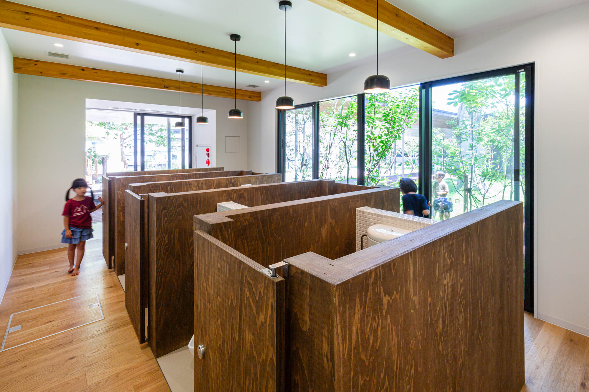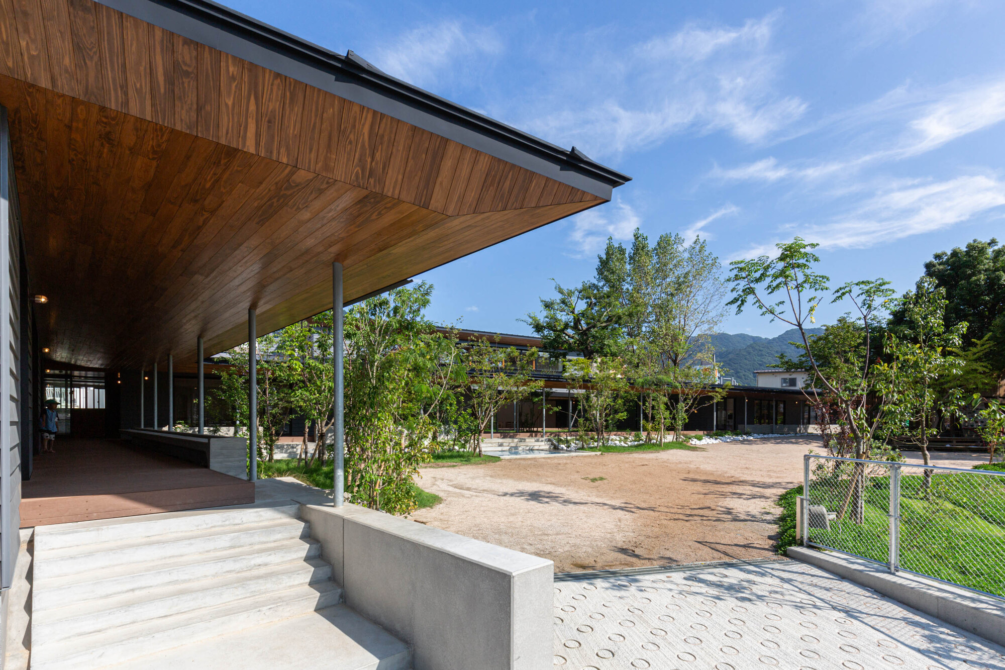 All the classrooms are arranged on the ground floor, facing the playground in an L shaped configuration, allowing children to spend their time while cherishing interaction with nature. The external corridor that connects the playground and classrooms resembles the veranda of a Japanese house, bringing the daily flow of movement semi-outdoors, enabling the children to constantly experience the changes in nature and weather. They can feel the rain falling from the roof and perceive the seasonal transitions brought by the wind. Through such daily experiences, children's sensibilities are refined, and they develop the ability to think and act on their own.