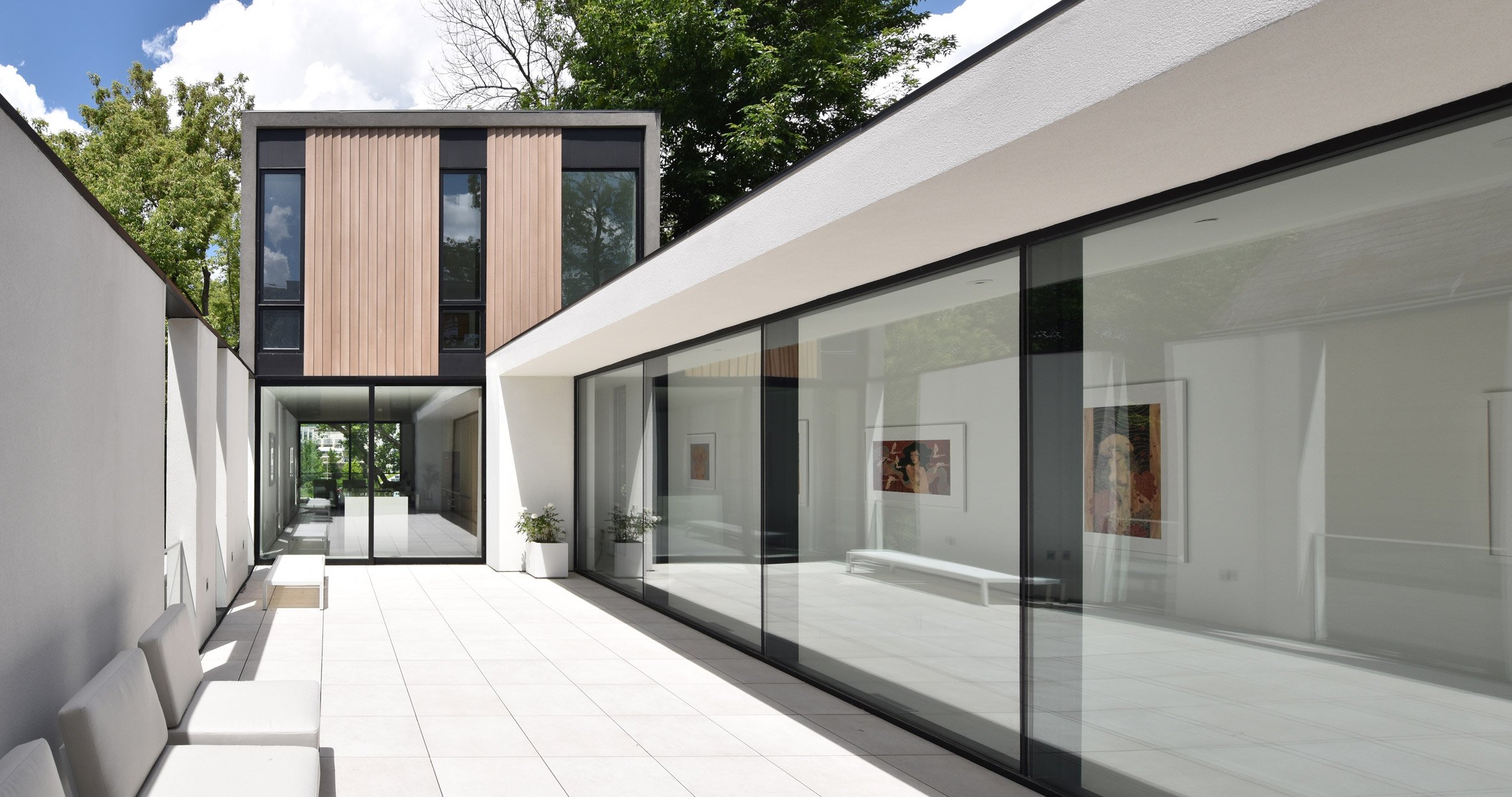 Atop this base level are a pair of two storey volumes organised around the internal courtyard and connected by a glazed corridor that doubles as a gallery.