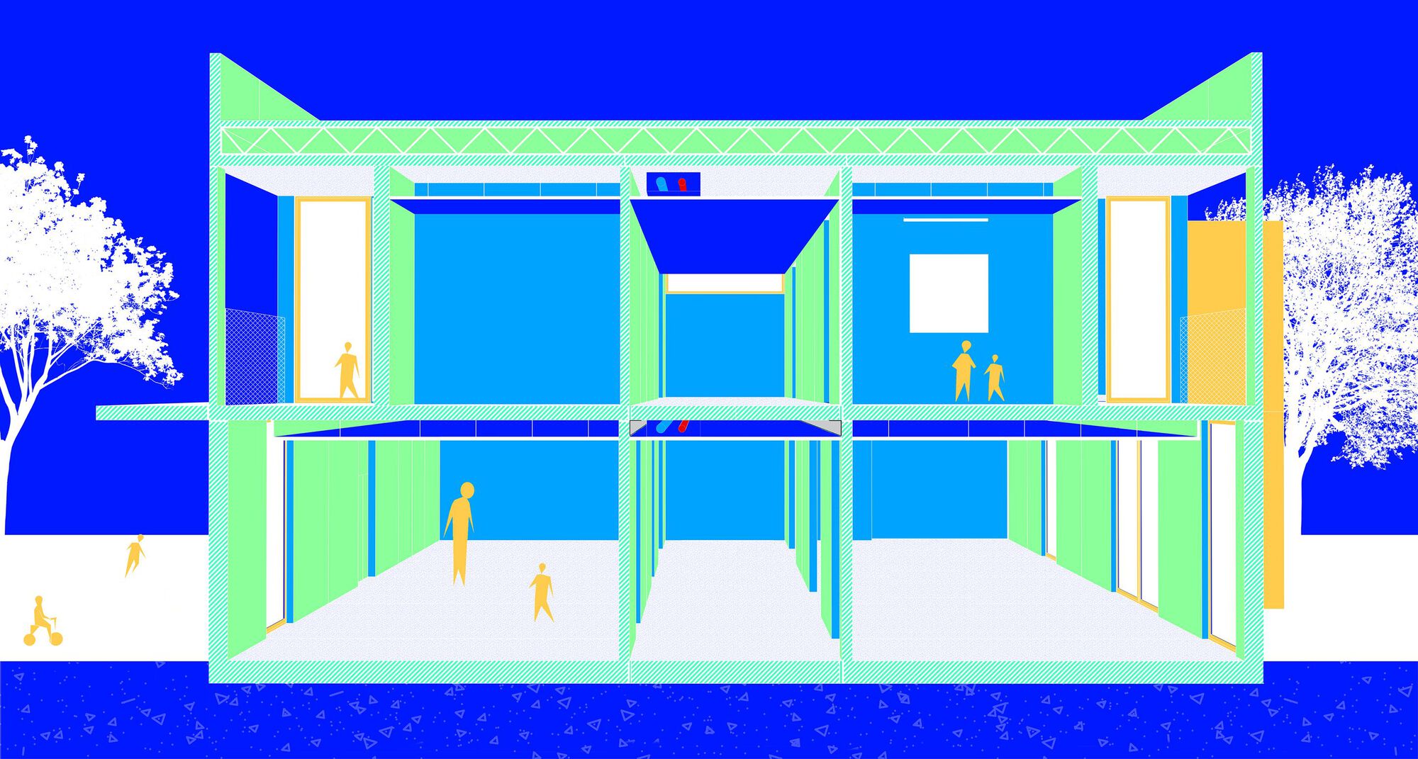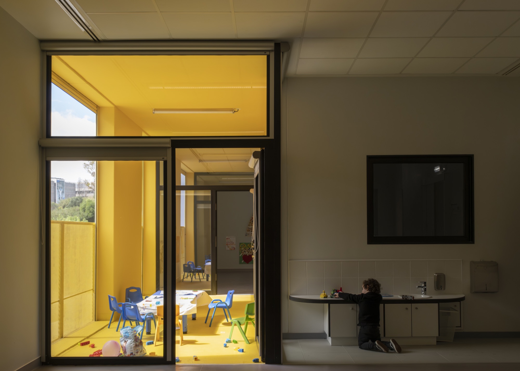 The nurseries are distributed across two floors, making them more compact in terms of footprint to address the limited space of the plots (all located in consolidated urban areas) and to maximize external space for recreational areas. The essential service areas (kitchen, administrative zone, laundry, etc.) are situated on the ground floor, while the various activity rooms for children are spread across both floors. All these rooms have direct access to the outside on the ground floor, to the playground; and on the upper floor, through terraces.