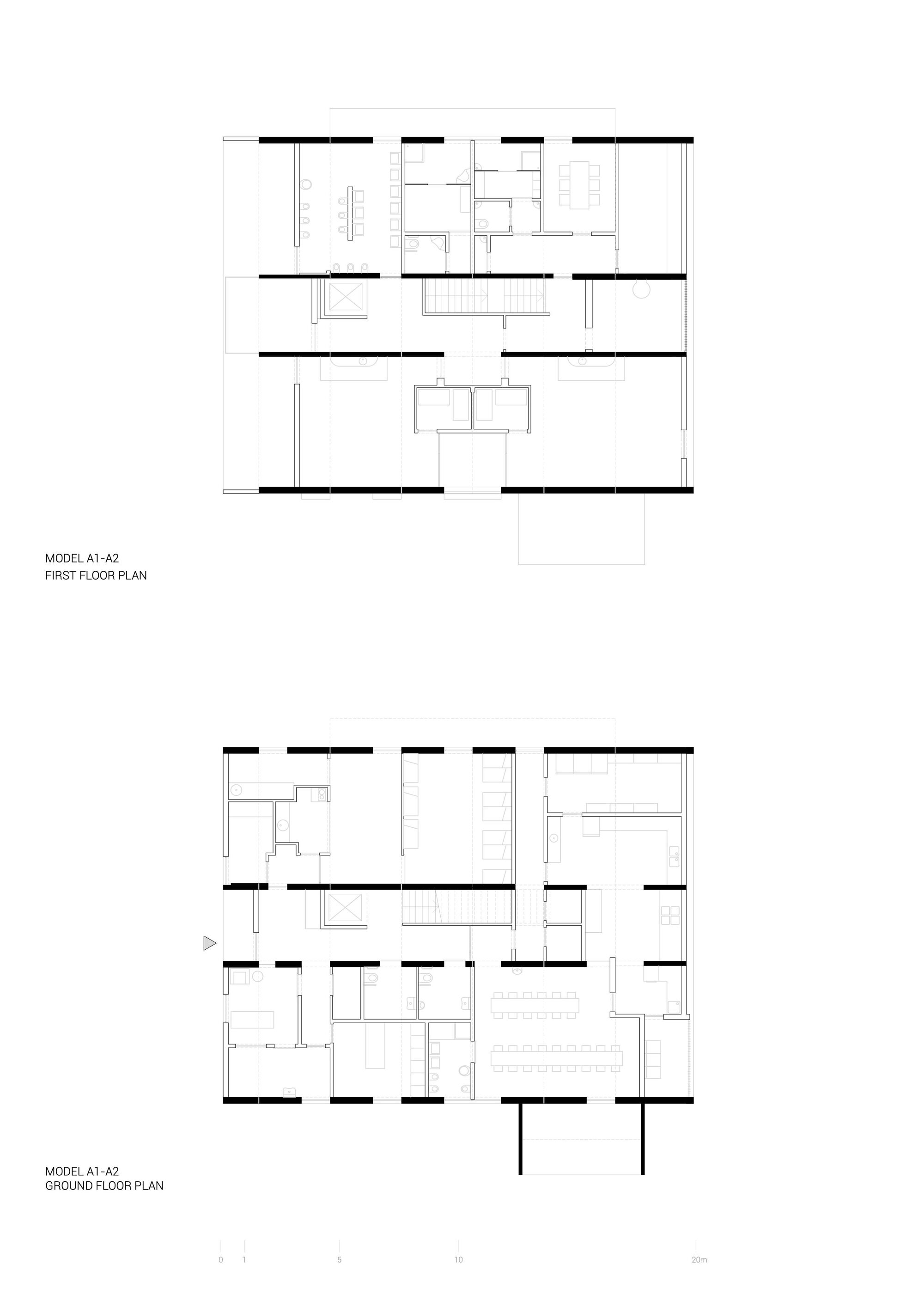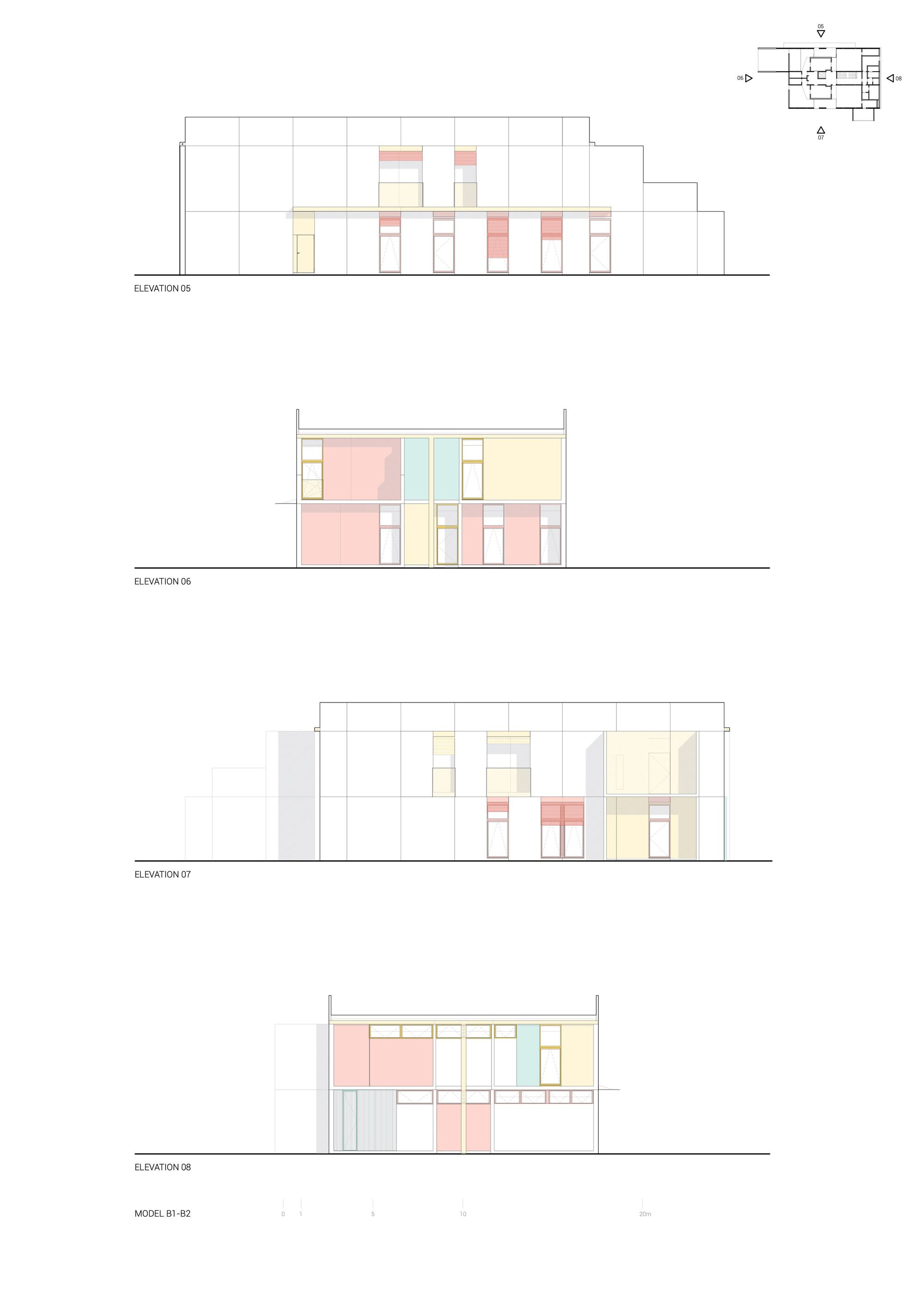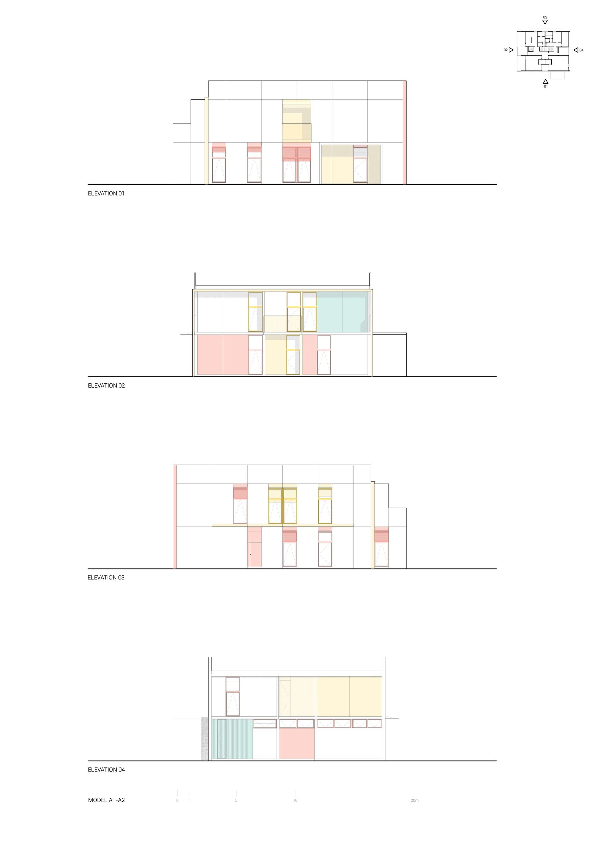The standardization of solutions naturally implies a formal analogy among the four kindergartens. The image of the buildings arises from the potentialities and limitations imposed by the modular construction system. From the exterior, a clear tectonic reading of the buildings is possible the joints are visible, and one can discern each of the modules and the way they are arranged and supported. These 4 nurseries feature a similar organic and functional distribution: two groups of overlapping “U-shaped” modules, housing various compartments, and a central corridor between them where all horizontal and vertical circulation takes place (corridors, stairwells, and elevators). It is also within these central corridor lines that the main sections of the heating, ventilation, and air conditioning infrastructure are located, reaching the compartments through the adjacent side walls.
