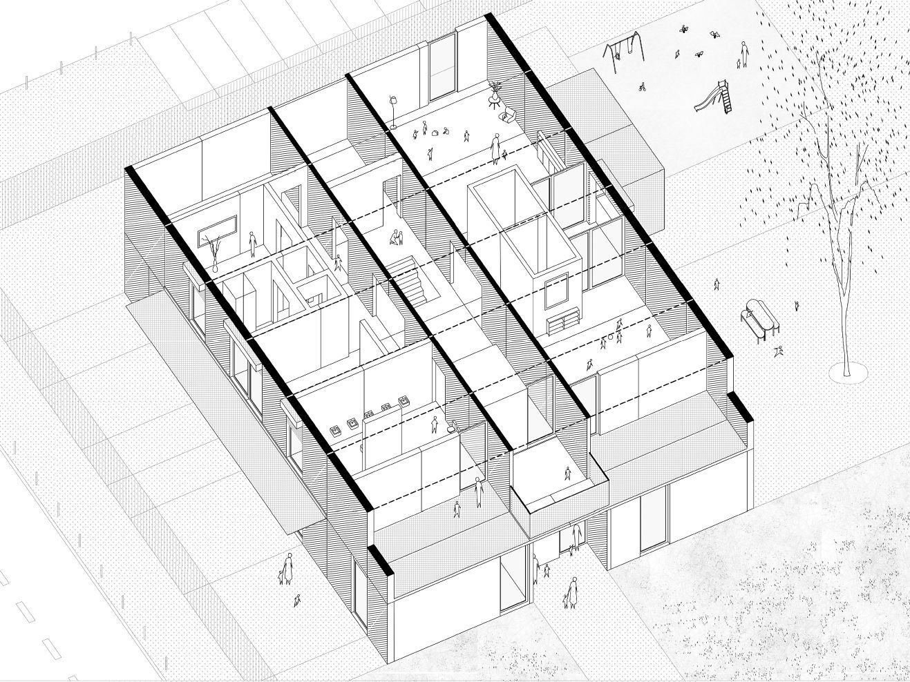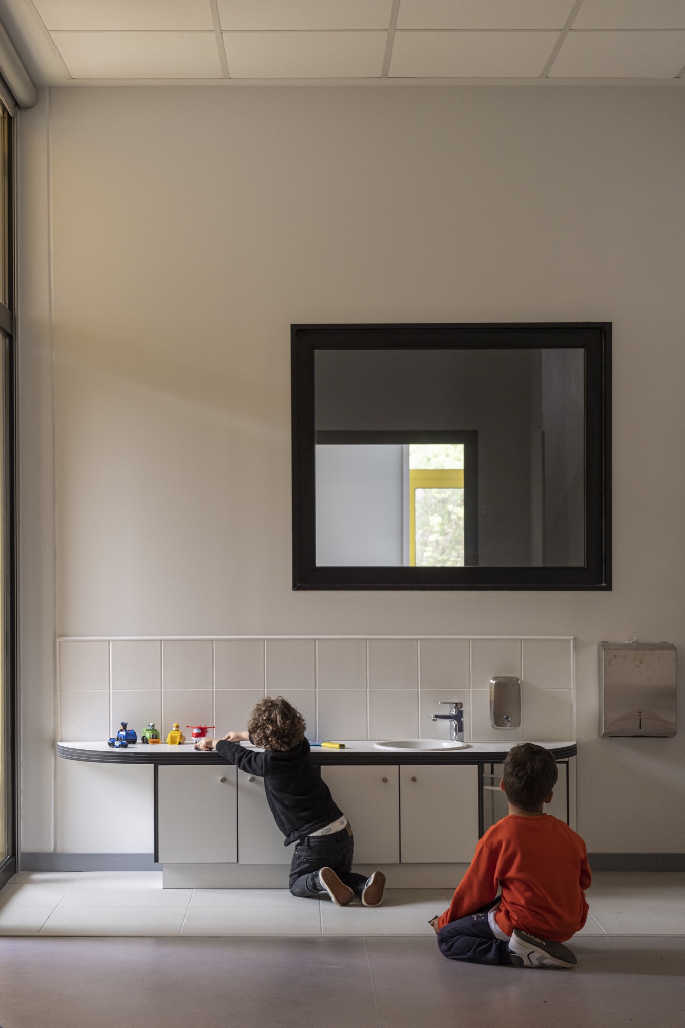 이 유치원은 두 층으로 구성되어 있으며, 지상층에는 주방, 관리실, 세탁실 등 필수 서비스 공간이, 위층에는 놀이와 학습을 위한 활동 공간이 배치되었습니다. 모든 활동실은 외부와 직접 연결되어 있어 1층은 놀이터로, 2층은 테라스로 이어집니다. 곡선형 유리 벽은 내부 학습 공간과 외부 놀이 공간을 부드럽게 분리하여 자연과의 연계를 강화합니다. 이러한 공간 배치는 아이들이 자유롭게 활동하며, 안전하게 탐험할 수 있도록 돕습니다.