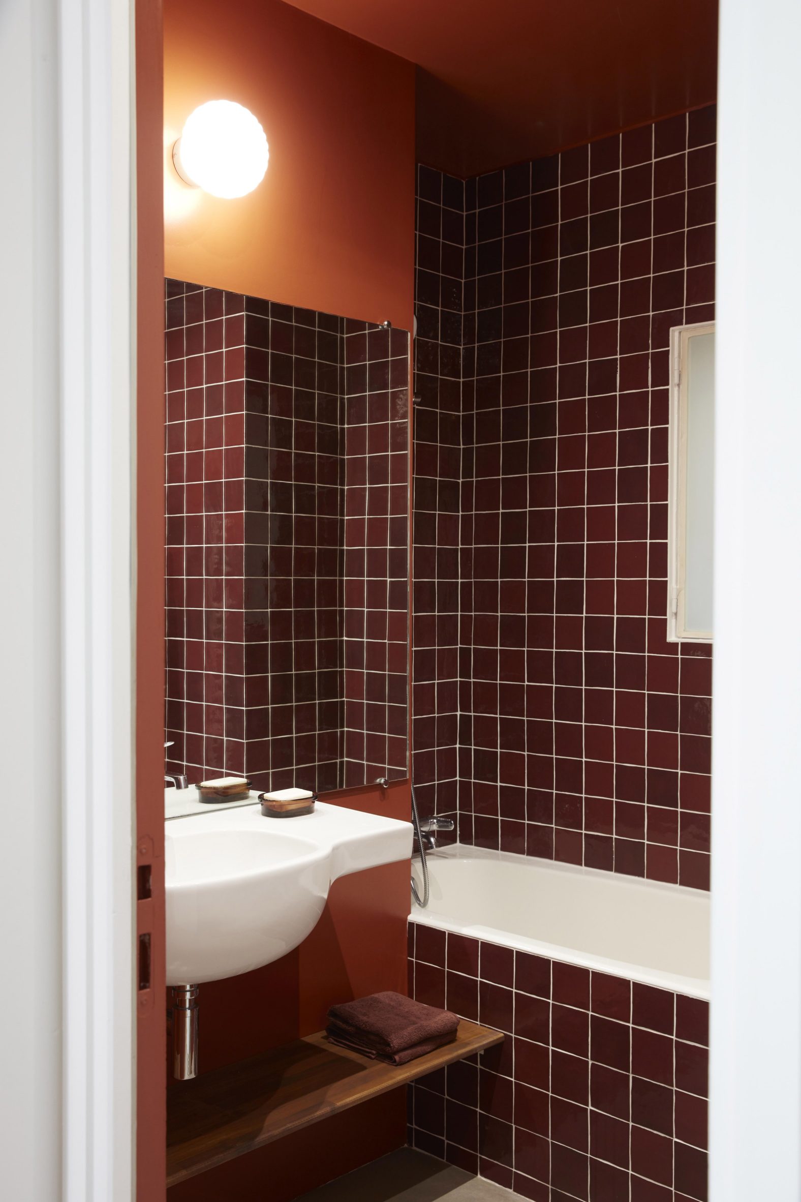 A burgundy tile was selected for the bathroom, lining the walls and side of the built-in bath.