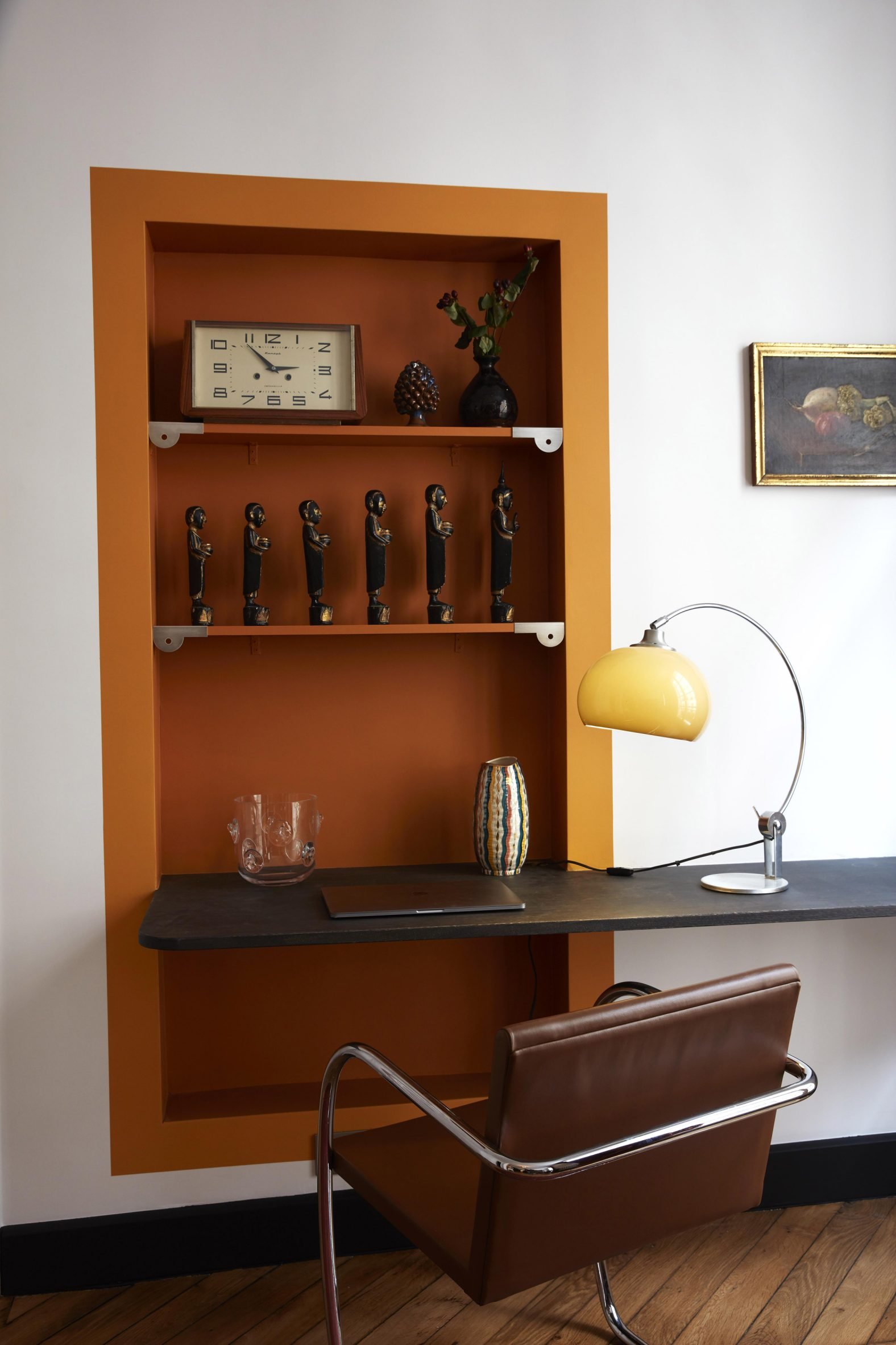 The desk was built into an existing wall recess, with bespoke stainless-steel details adding extra character.