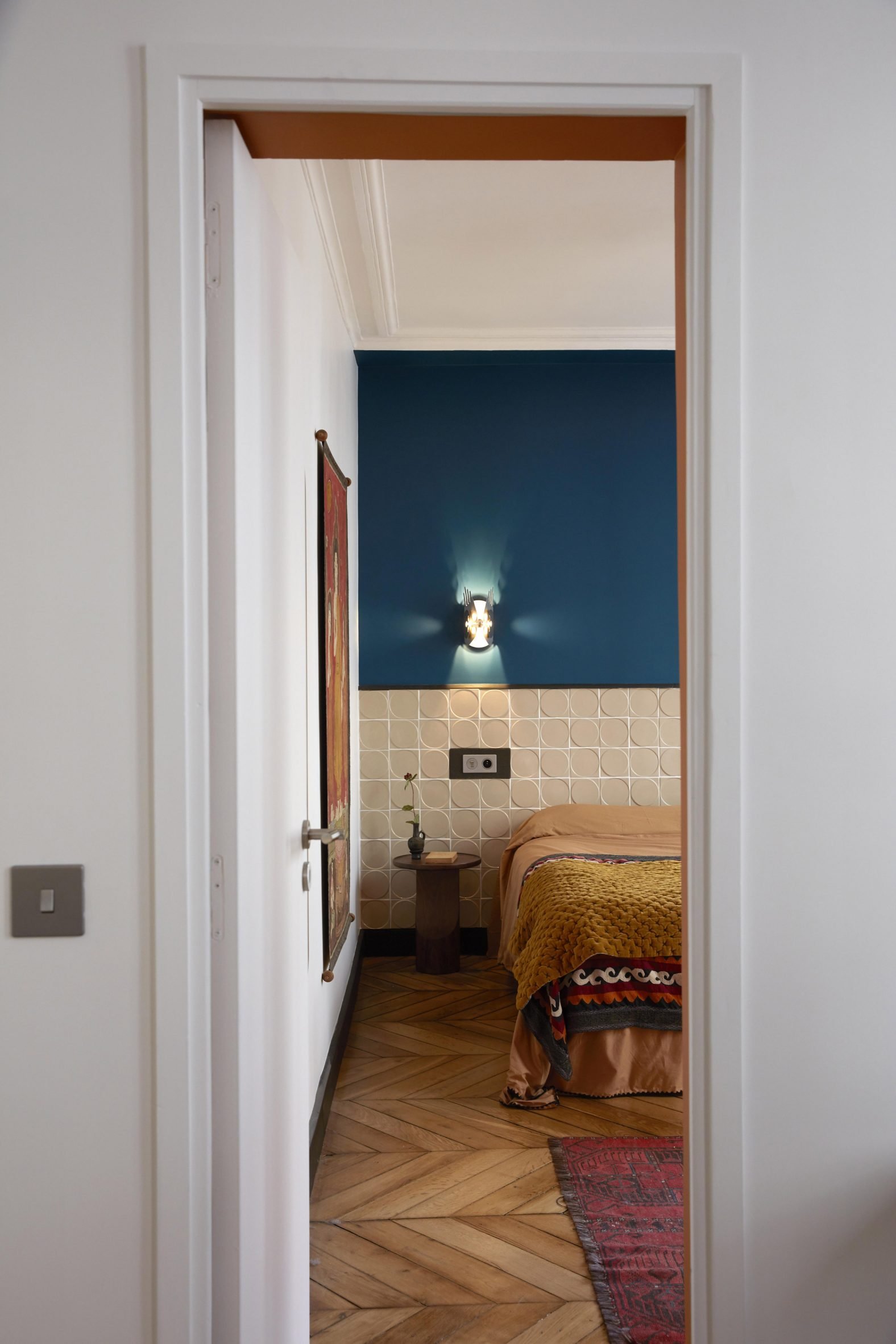 침실은 포르투갈 브랜드 Barro의 베이지 타일을 사용해 침대 헤드보드를 구성했습니다. 원형 패턴 타일은 블루 페인트 벽과 어우러져 시각적 흐름을 형성하며, 맞춤형 알루미늄 조명이 야간의 포근한 느낌을 강조합니다. 이 조명은 기술적 혁신과 미학적 요소를 결합한 대표적 사례입니다. 침실은 또한 클라이언트의 휴식 공간으로 설계되었으며, 색상 대비와 소재 조화로 심리적 안정을 제공하는 데 중점을 두었습니다.