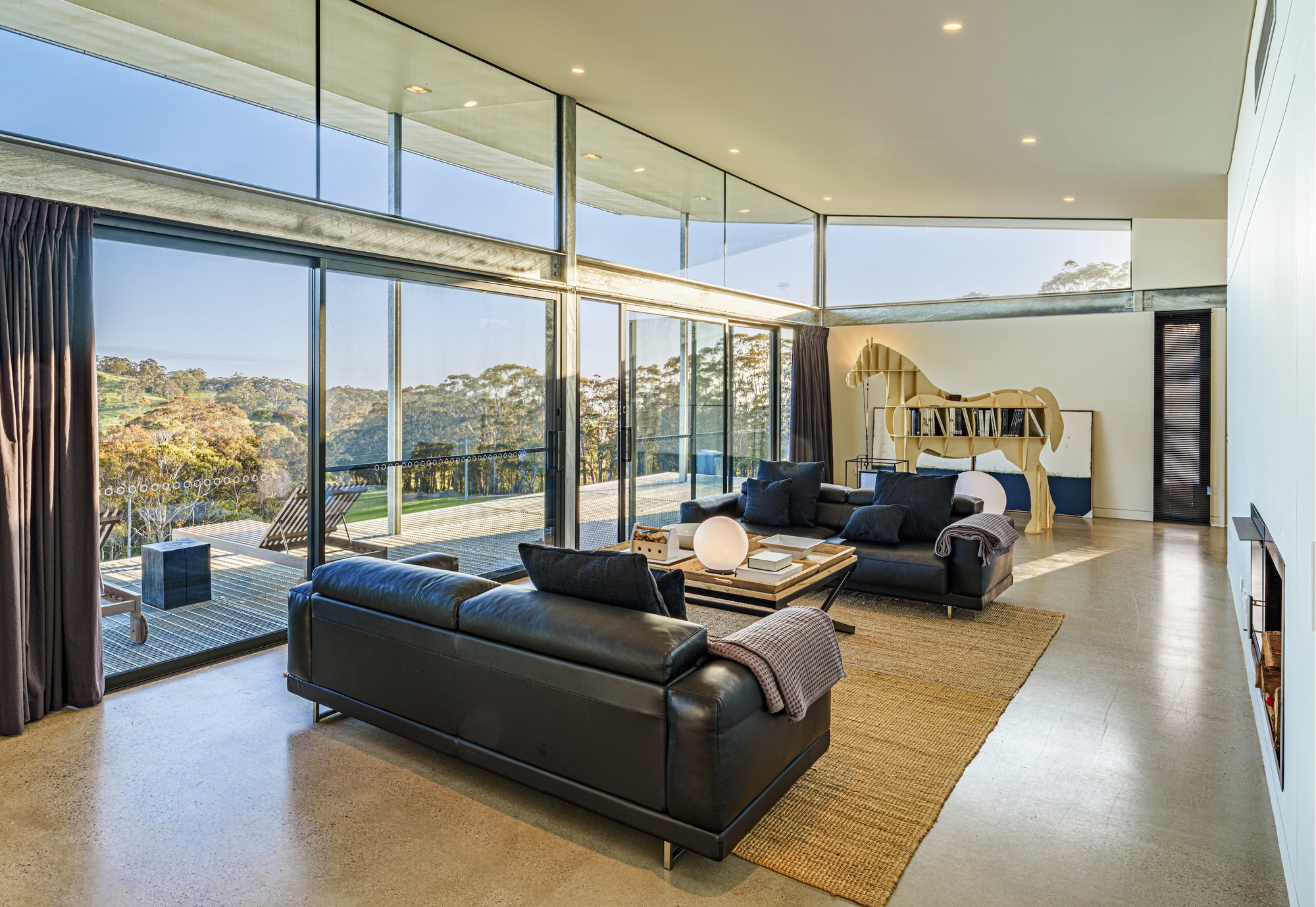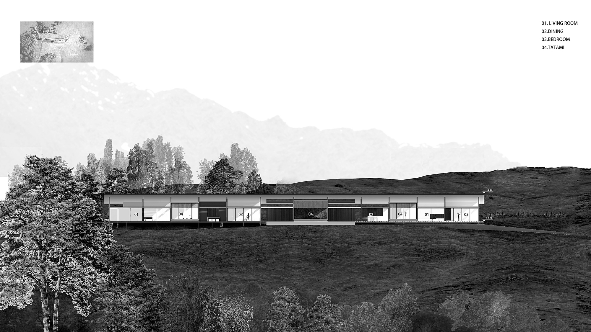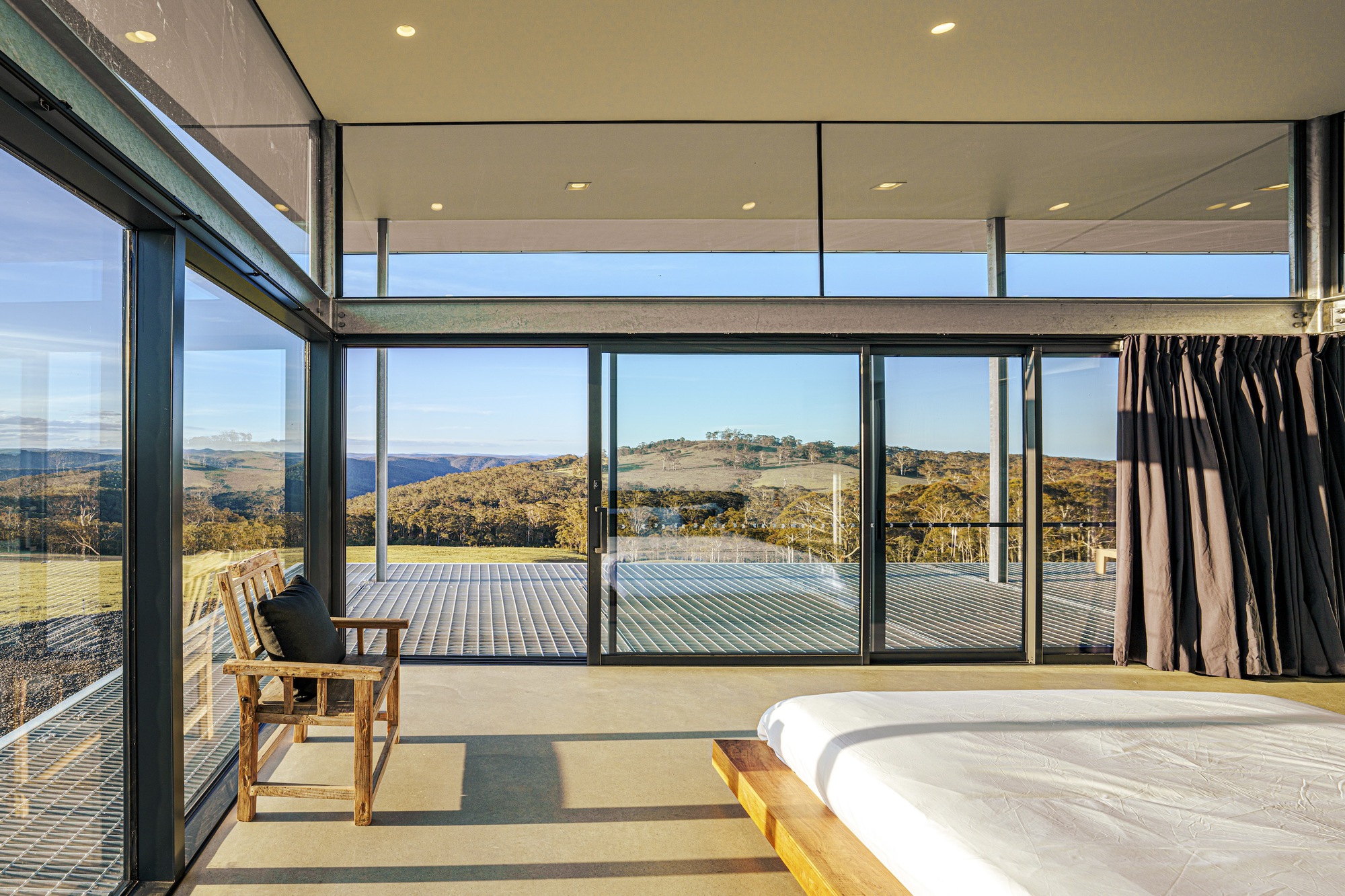 Interior Design The interiors combine refined simplicity with Eastern influences, blending natural materials and earthy tones. Floor-to-ceiling windows flood the spaces with light, offering panoramic views. Living areas, bedrooms, and tatami spaces feature soft white and charcoal linens, while kitchens and bathrooms showcase pristine white stone finishes. Modern amenities, including air conditioning, underfloor heating, and premium appliances, ensure comfort. Outdoor bathtubs with mountain views provide a perfect setting for relaxation. The exterior walls, clad in Colorbond Monument, blend with the natural surroundings, while Corten steel cladding on the tatami pods adds a striking contrast. A featured pool mirrors the sky and landscape, creating a serene visual experience, especially at dawn and dusk.