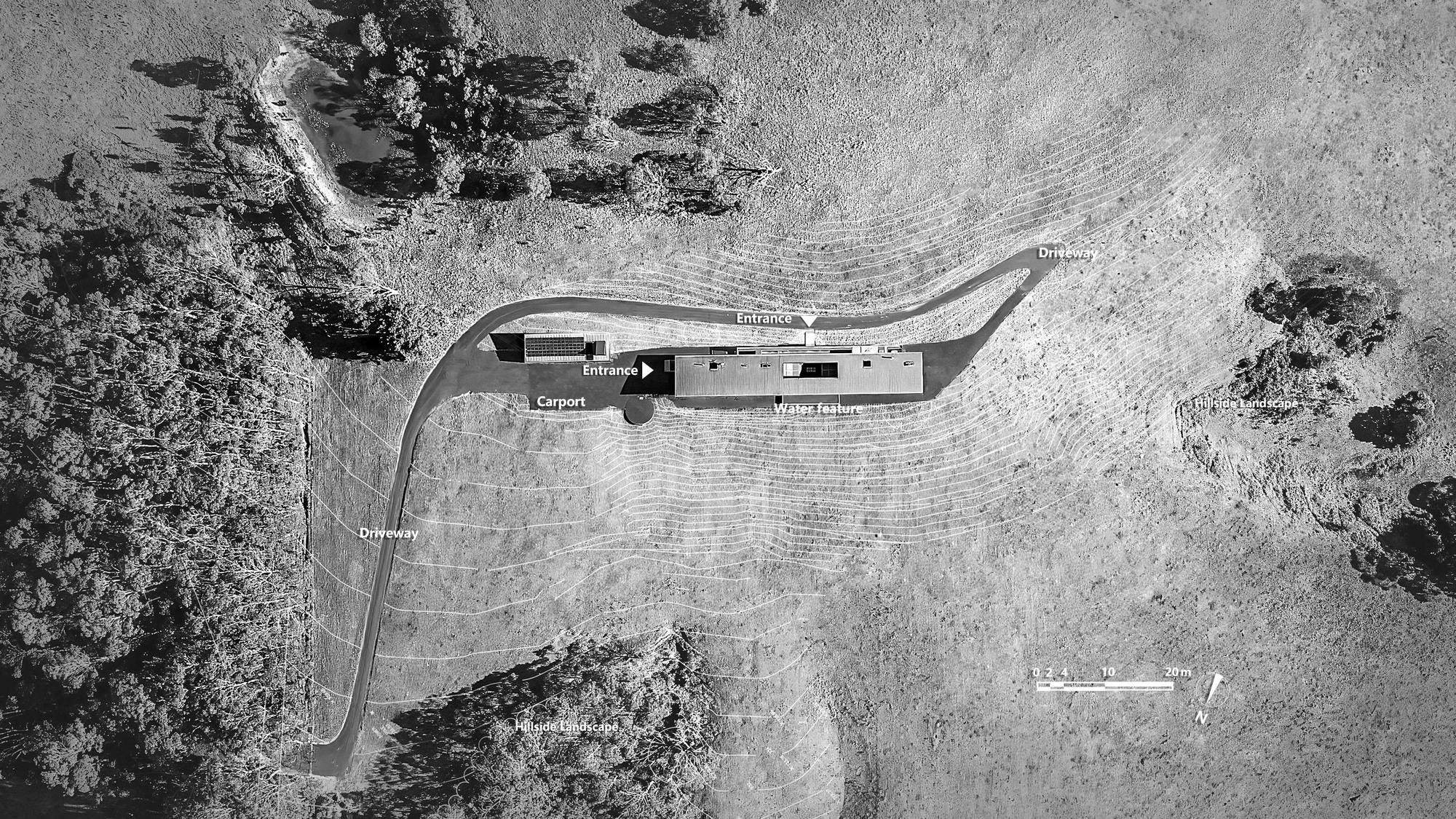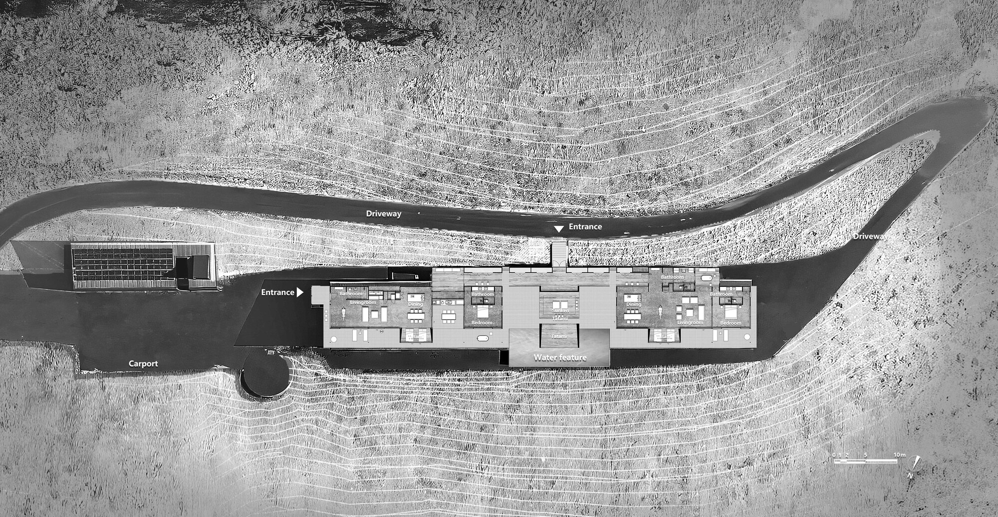 Mountaintop Bilpin Resort는 70미터 능선을 따라 두 개의 독립적인 캐빈으로 구성되어 있으며, 각 캐빈은 170제곱미터로 8~12명의 인원을 수용할 수 있습니다. 리조트 중심에는 300제곱미터 규모의 안뜰이 위치하며, 이 공간은 요가, 웰니스 세션, 웨딩, 기업 이벤트와 같은 다목적 활동을 지원합니다. 안뜰 중앙에 배치된 물 요소는 공간의 시각적 중심을 강조하며, 주변 구조물과 균형 잡힌 배치를 통해 전체 공간에 조화로운 흐름을 제공합니다. 건축물은 산의 윤곽선을 따라 설계되어 자연 환경과 완벽히 조화를 이루며, 내진 설계와 같은 기술적 혁신을 통해 구조적 안정성을 확보하였습니다.
