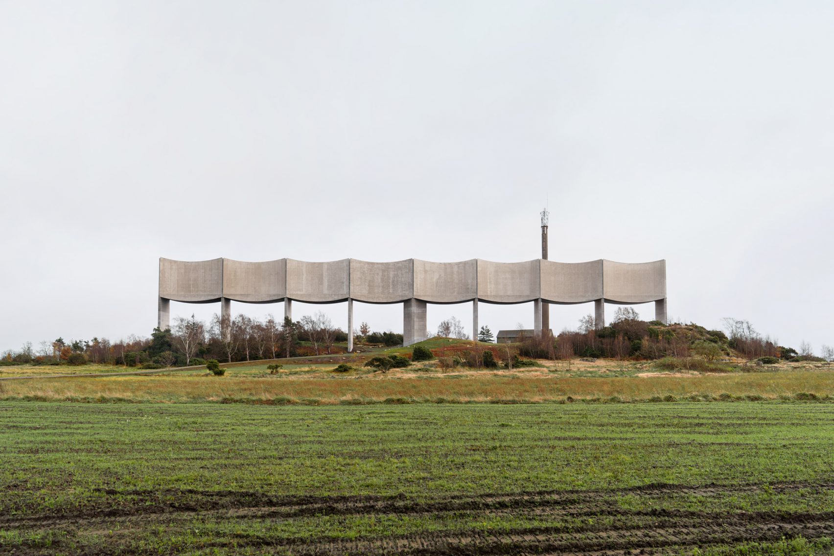 Våga Water Tower's undulating, concrete reservoir is supported by nine slender columns, with the central one slightly widened to house an elevator and staircase.