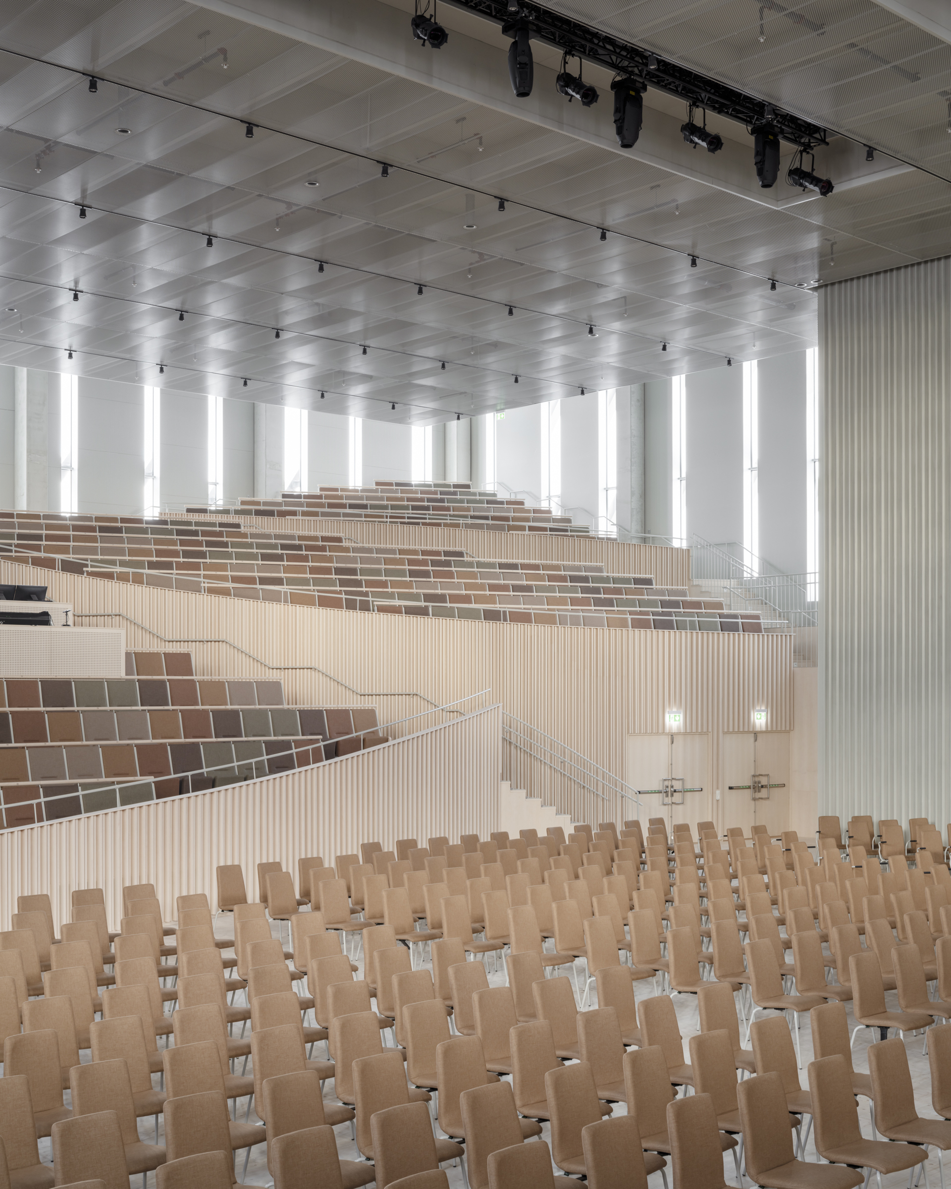 The extensive social agenda needs an extrovert architecture; the largest church hall of 1100 seats was allowed to dictate the building's footprint, a huge sacral space, column free 40x40 meters, wrapped by exterior facades all around. Open to the city and with daylight from all sides, the room feels half outdoor; a gesture as profane as it is sacral. Free-form terraces, the scale of the space, and its natural light make it equally landscape and architecture, alluding to past gatherings outdoors, before churches. The facades' undulating border is given by the interior landscape, sawed wood below the rake, an abstract representation of a comb of wheat above.