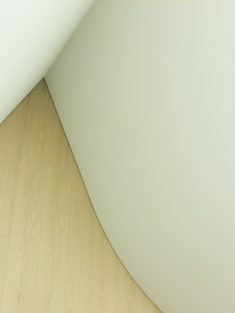곡선형 흰 천장은 자연광을 실내에 부드럽게 확산시키며, 공간을 밝고 개방적으로 보이게 한다. 대형 창문은 숲의 풍경을 실내로 끌어들여 내부와 외부의 경계를 흐릿하게 만들고, 북쪽과 남쪽 창문의 크기와 위치는 계절별 일조량과 열 손실을 최적화하도록 설계되었다. 내부의 밝은 색조는 자연광과 조화를 이루며, 사용자에게 시각적 편안함과 심리적 안정감을 제공한다.