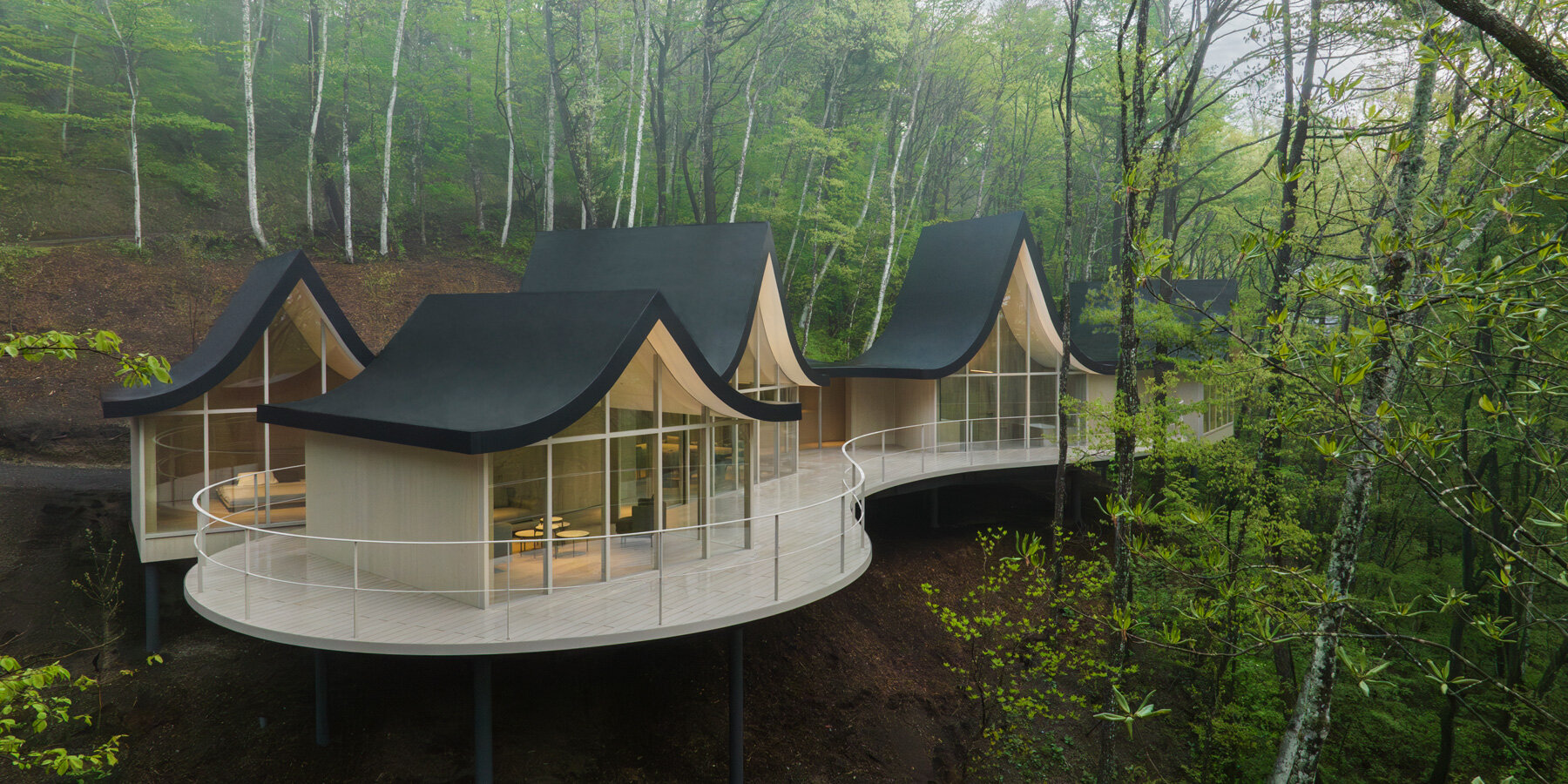 nendo weaves six cottages together with ‘hand-holding’ roofs in japanese forest house