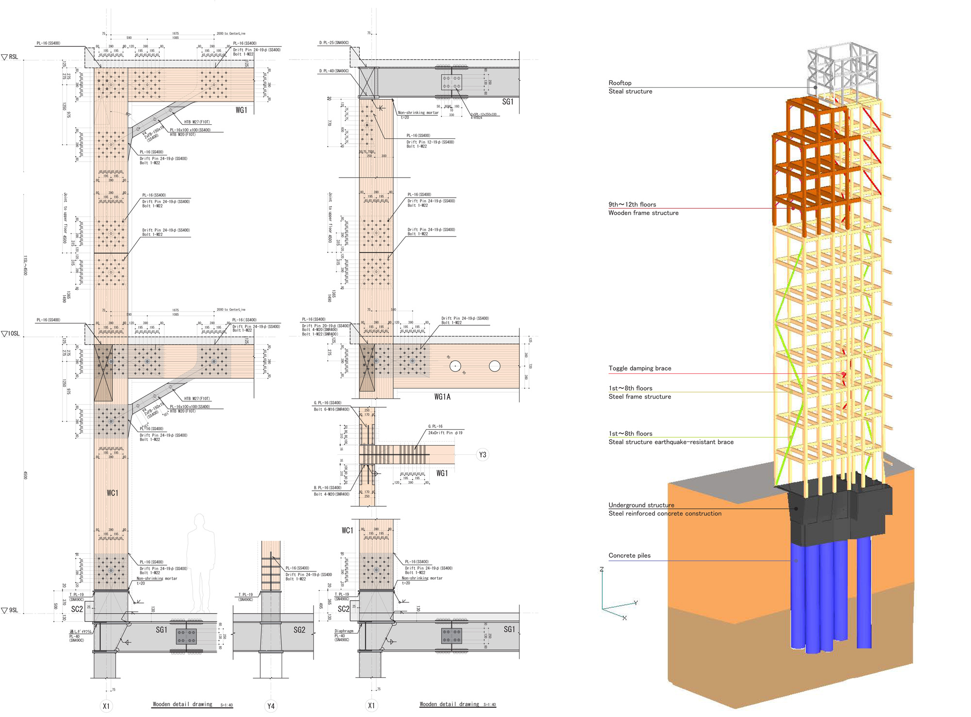 The important part of the construction of a wooden fireproof building is the joints of the wooden fireproof structure. In principle, wooden fire resistant members with a flame retardant layer should be installed in such a way that the cladding material is continuous. Therefore, drift-pin joints with insert-type steel plates were used. This mixed wood structure can be designed without using the approved construction method issued by general contractors.