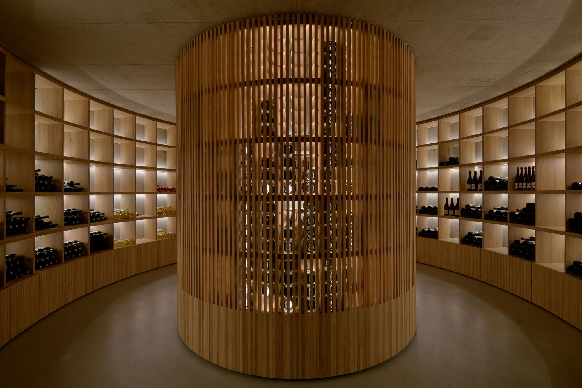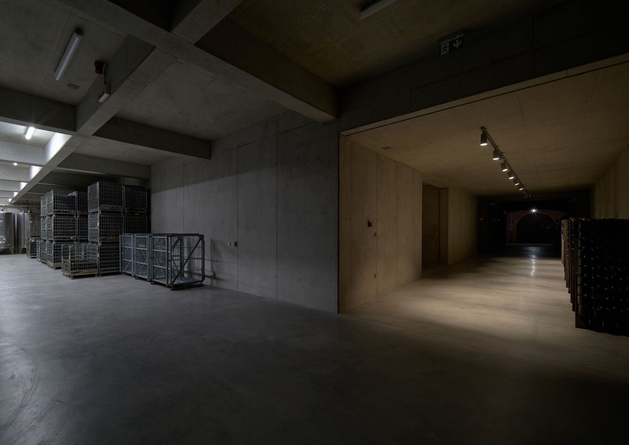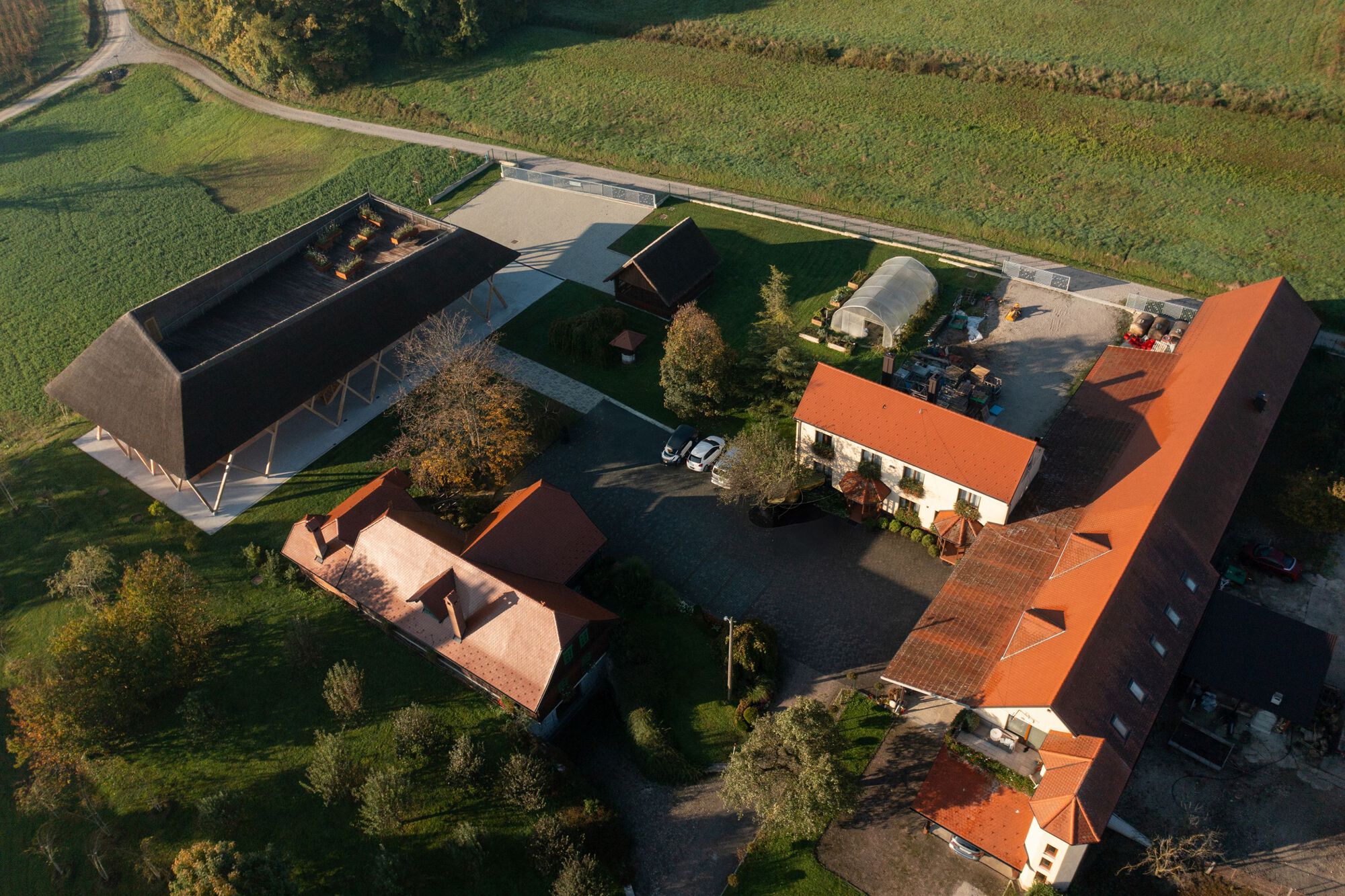 The winery is functionally and spatially organized by the vertical axis: cellar – reinforced concrete, ground floor – brick walls, attic – timber construction, roof – straw. The L shaped layout of the underground floor is completely built out of raw concrete. Large wooden barrels are placed in the simple volume (box) of the ground floor with a rectangular floor plan. The reinforced concrete is visible only in the interior because it is covered with brick walls on the outside, so it becomes a prominent element of the ground floor. Above the box on the ground floor, a wooden structure forms an attic space, which is primarily intended for drying agricultural crops. The elements of the wooden laminated construction and the wooden massif fence are reminiscent of the traditional barn and its authentic ambiance.