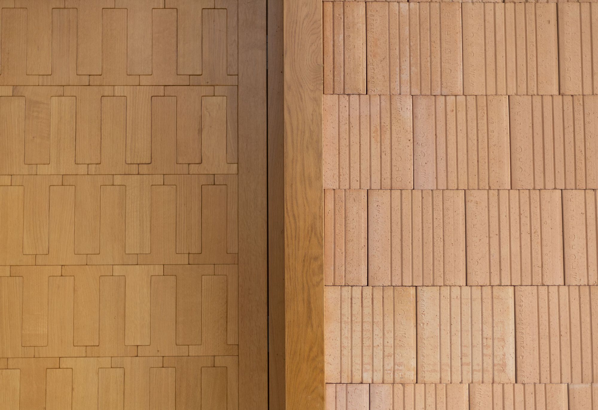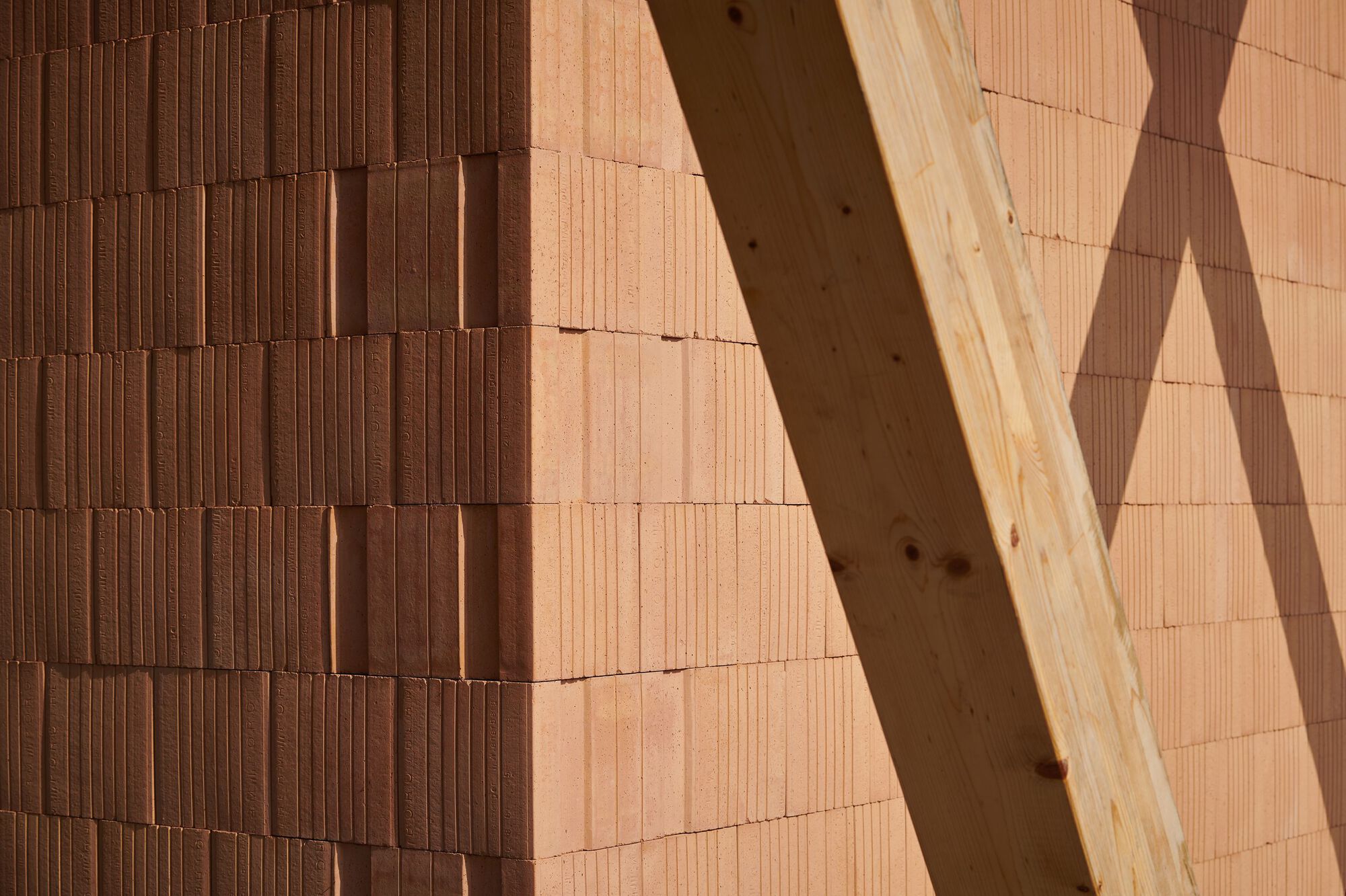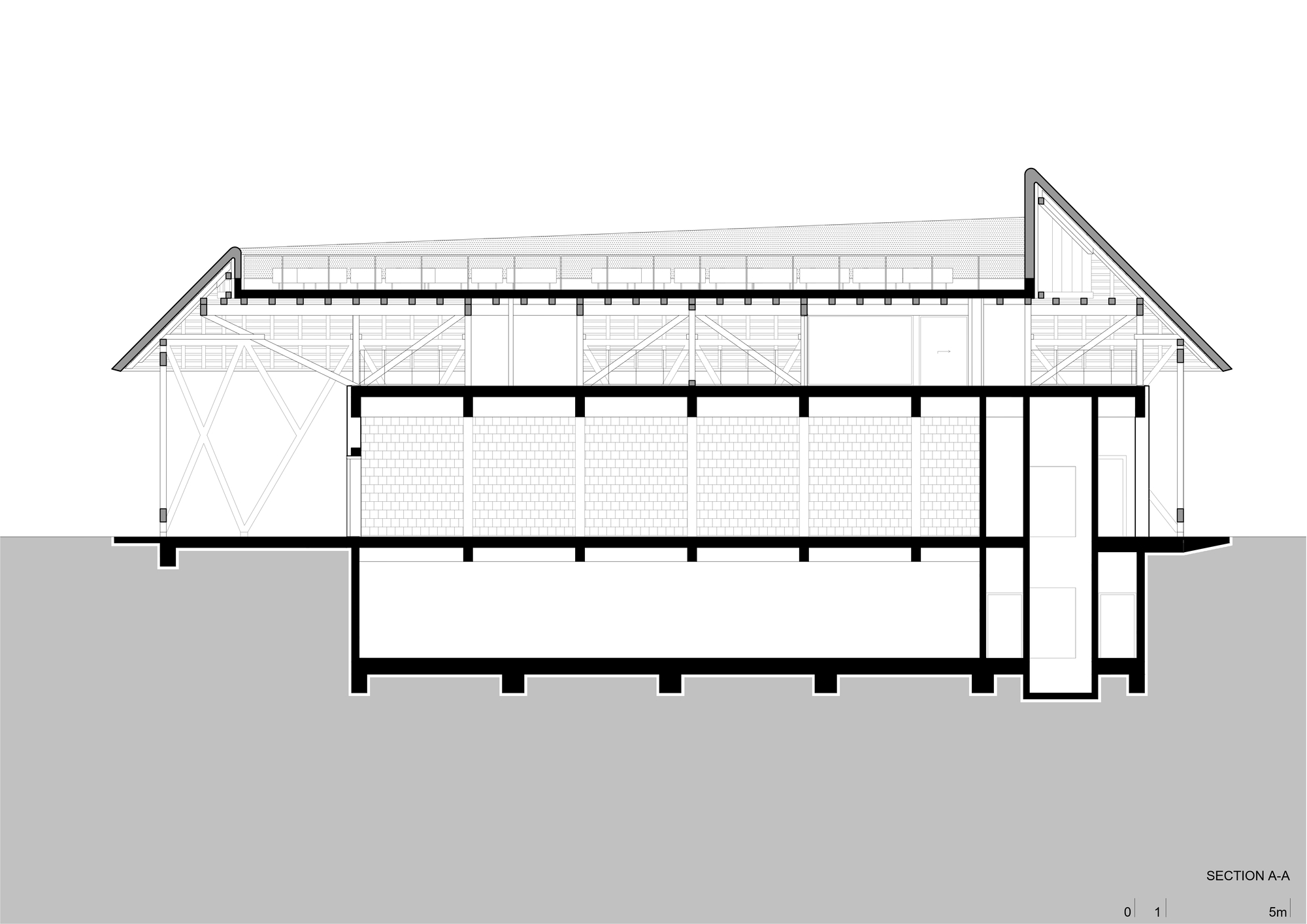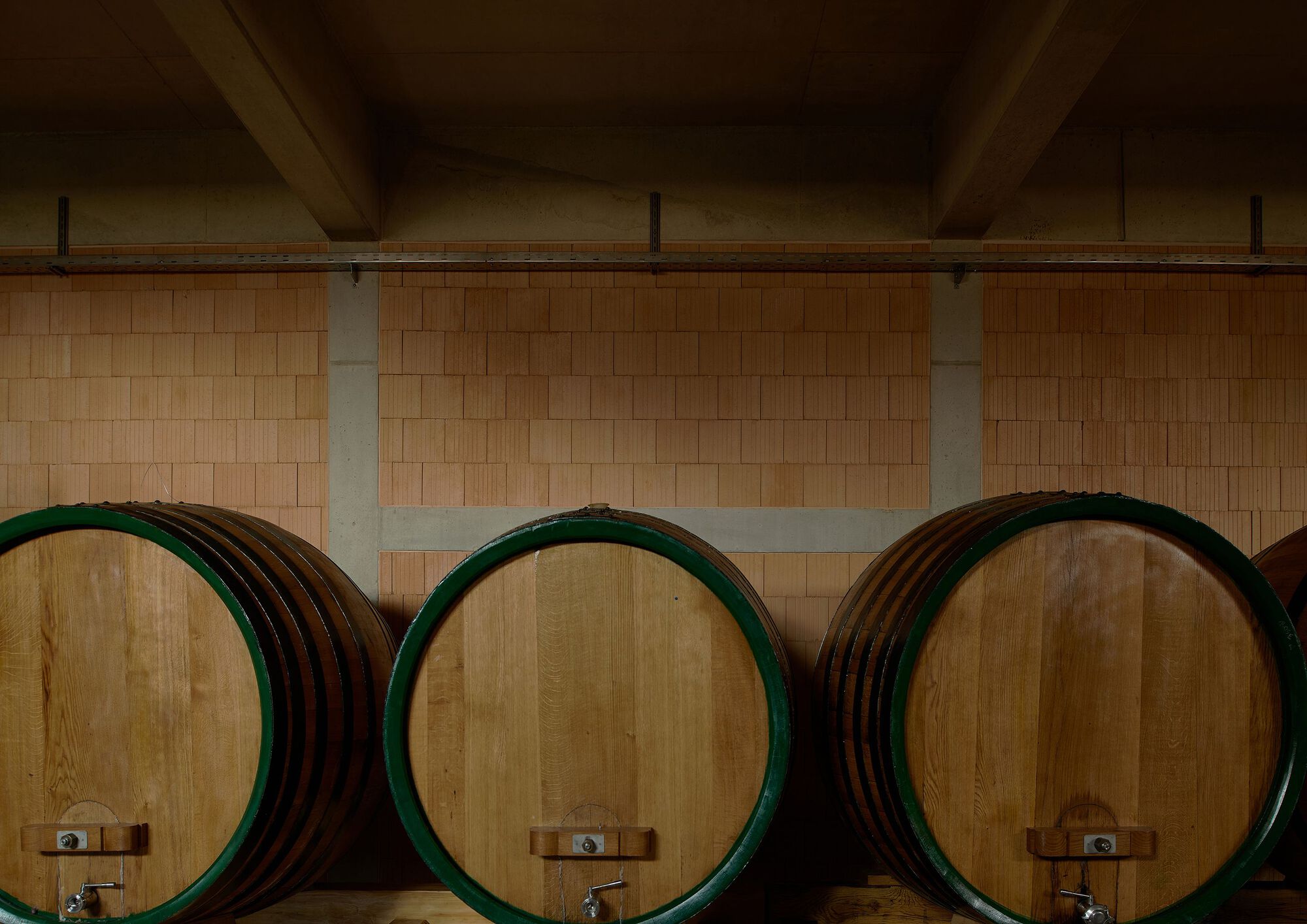 The winery is functionally and spatially organized by the vertical axis: cellar – reinforced concrete, ground floor – brick walls, attic – timber construction, roof – straw. The L shaped layout of the underground floor is completely built out of raw concrete. Large wooden barrels are placed in the simple volume (box) of the ground floor with a rectangular floor plan. The reinforced concrete is visible only in the interior because it is covered with brick walls on the outside, so it becomes a prominent element of the ground floor. Above the box on the ground floor, a wooden structure forms an attic space, which is primarily intended for drying agricultural crops. The elements of the wooden laminated construction and the wooden massif fence are reminiscent of the traditional barn and its authentic ambiance.