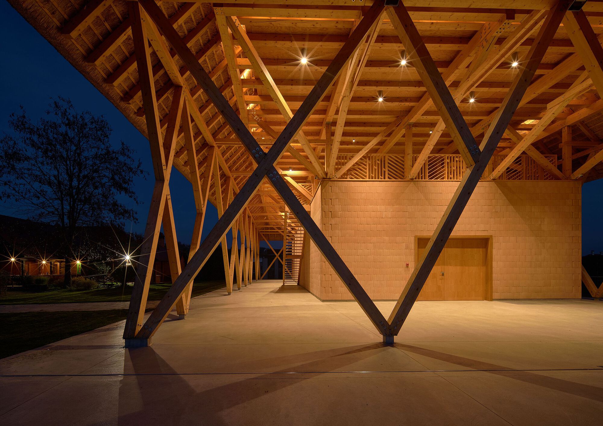 건축물의 비례와 조형미는 전통과 현대를 조화롭게 융합한 디자인으로, 시각적 즐거움을 제공합니다. X자형 트러스와 자연스러운 재료의 조합은 건축물이 주변 환경과 어우러지며 독특한 정체성을 드러냅니다. 내부와 외부의 통일된 미학적 표현은 공간 전체에 일관성과 완성도를 부여합니다.