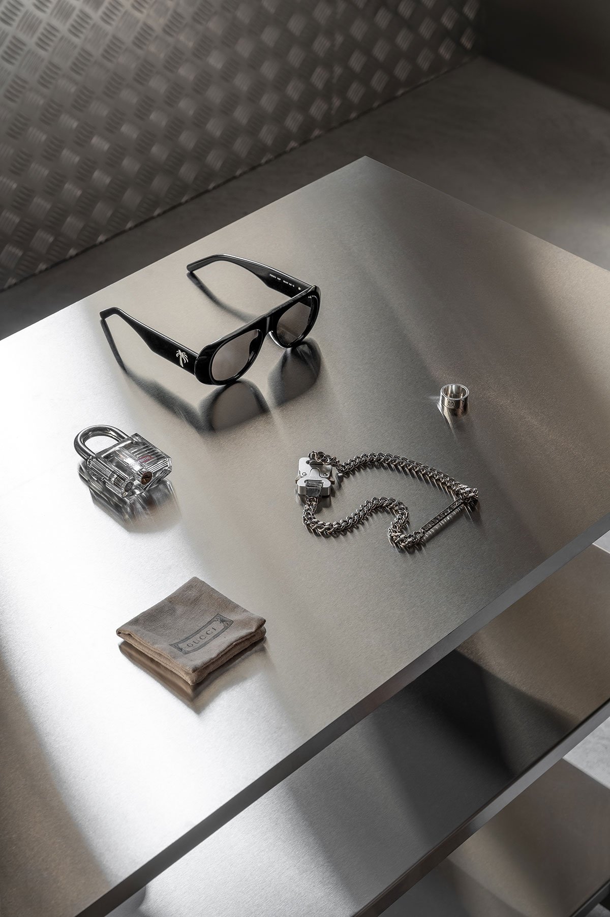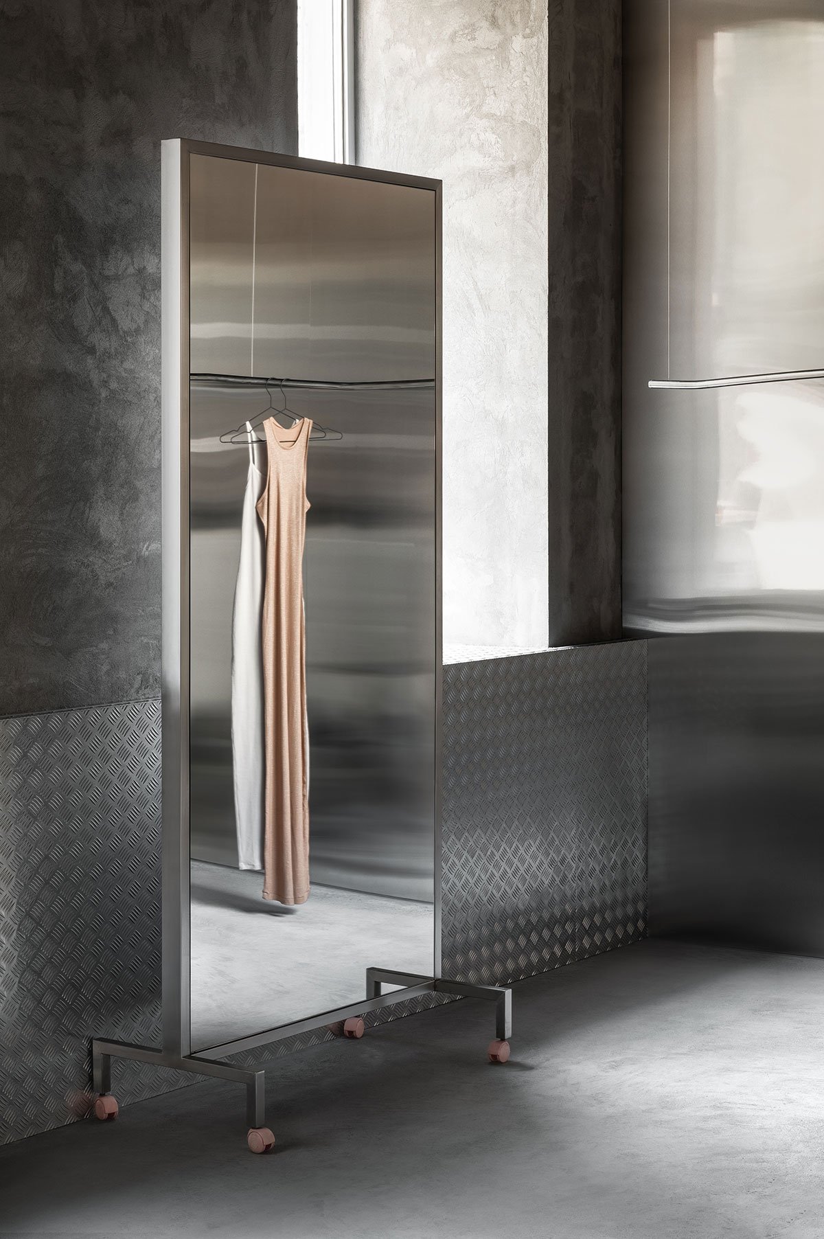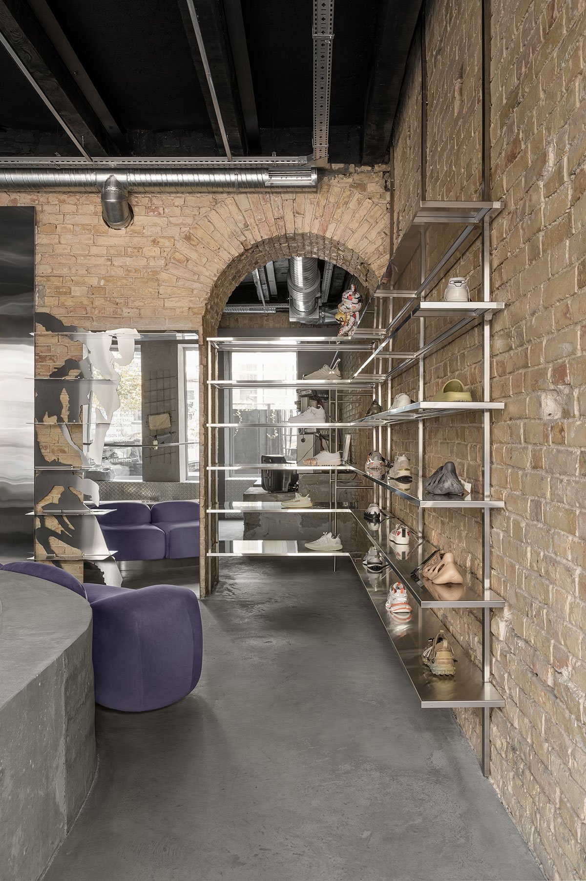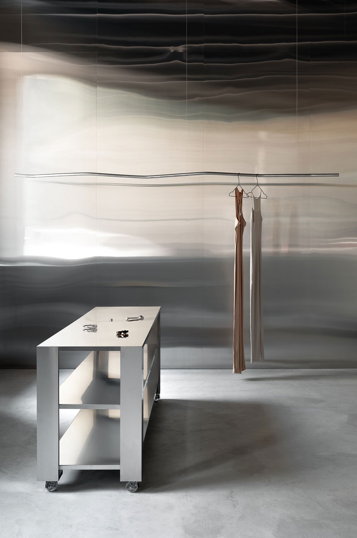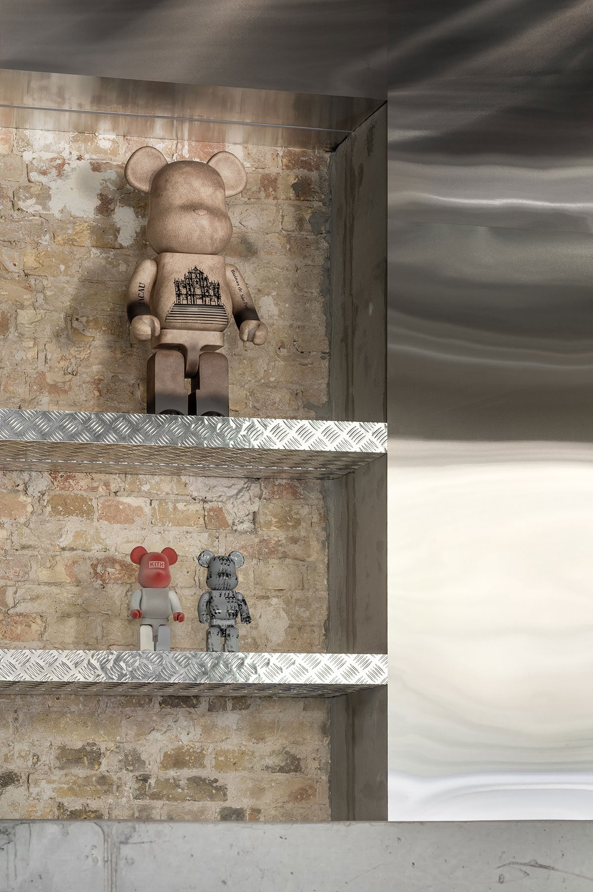 The men's showroom, Storage, introduces a skatepark-inspired edge, utilizing poured concrete elements, which along with exposed brick walls, metallic trade plates, and minimalist stainless-steel shelving and rails, comprise an unyielding yet understated backdrop that amplifies the sleek, modern streetwear collections on display.