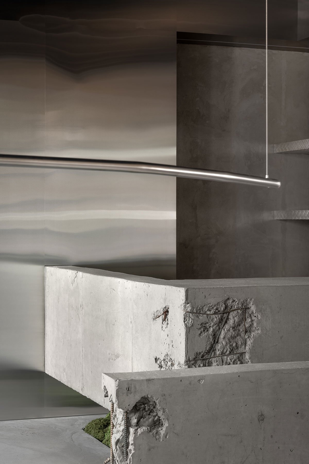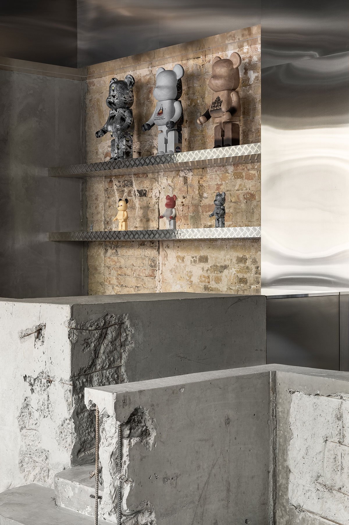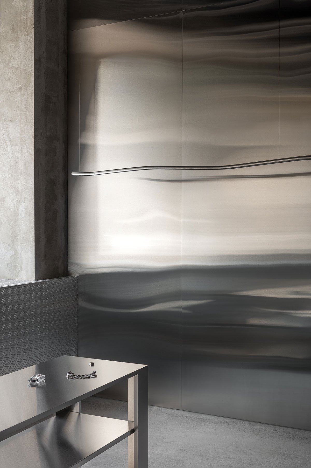 Storage는 스케이트보드 파크에서 영감을 받아 콘크리트, 금속 트레이드 플레이트, 스테인리스 스틸로 구성된 대담한 소재를 사용해 남성적이고 강렬한 공간을 형성합니다. Domaine 17은 주름진 강철 벽과 물결 모양 거울을 통해 부드럽고 여성적인 분위기를 연출합니다. 이러한 질감의 대조는 두 공간의 정체성을 선명히 드러내며, 시각적 흥미를 극대화합니다.