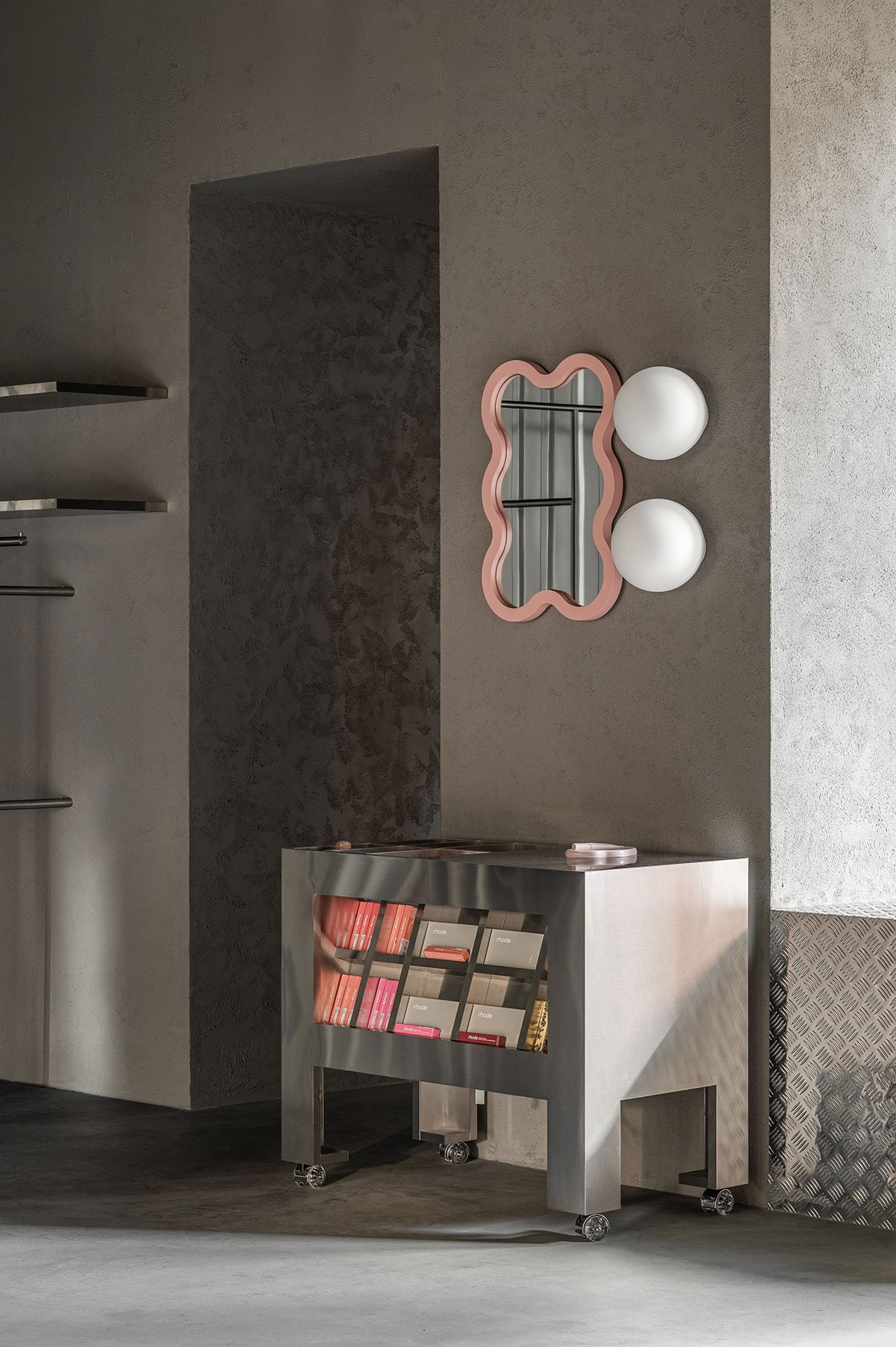 In contrast, Domaine 17 embraces softer lines and pink accents, in a space that mixes the raw and dynamic with a sense of femininity interspersed with movement and fluidity via an interplay of corrugated steel walls and wavy mirror frames by Ukrainian brand Oito. A chaotic pile of vintage TVs further emphasizes the space's playful yet subversive character with hidden cameras projecting visitors' movements onto the screens in glitch-filled effects.