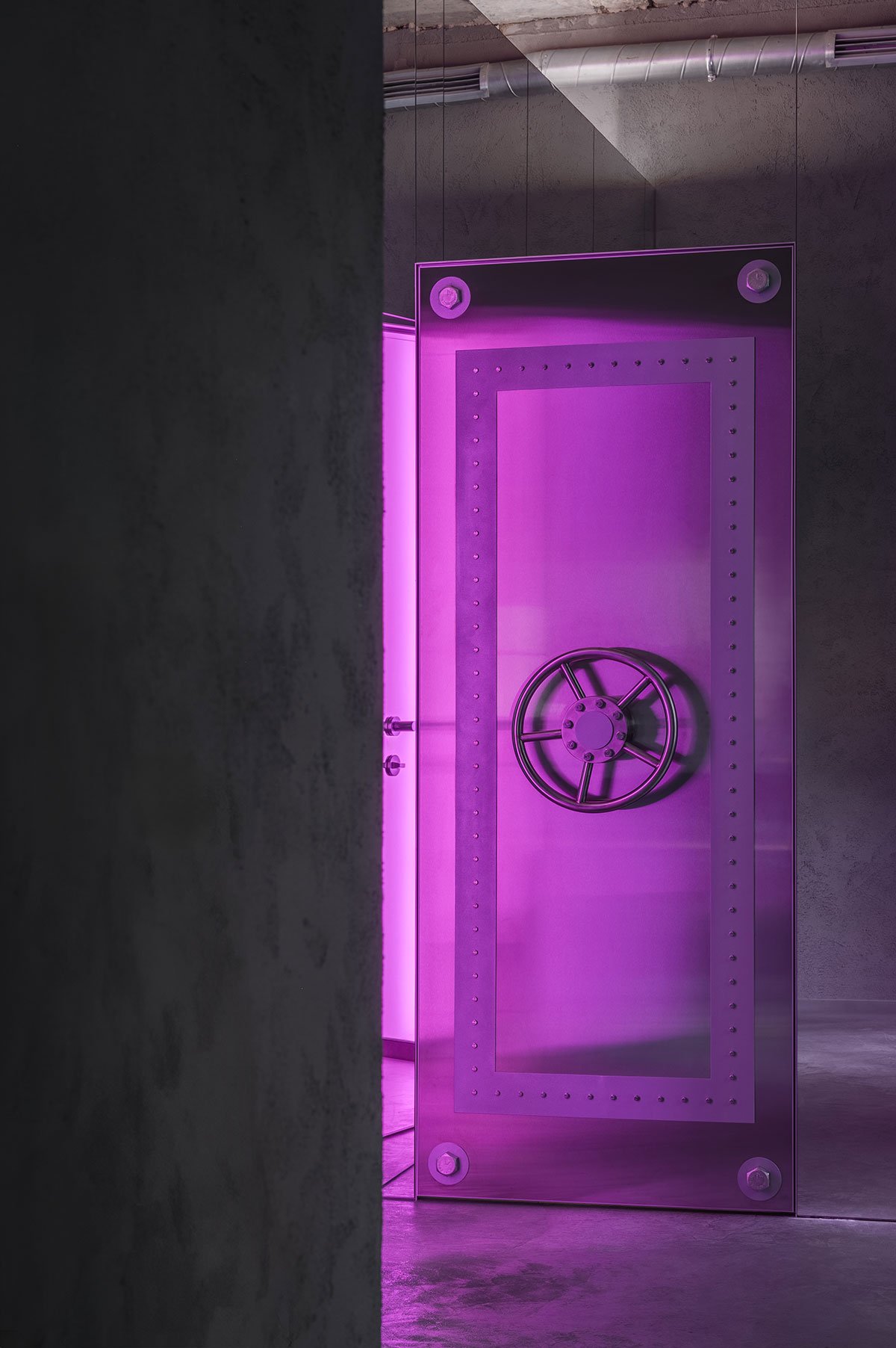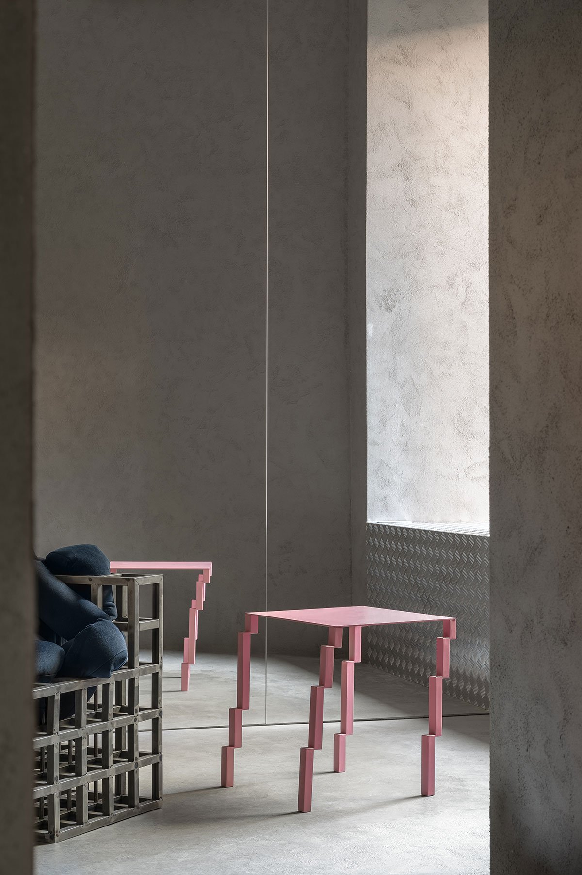 The conceptual third section enhances the showroom's narrative of juxtaposition and surrealism with mirrored walls creating an infinite maze of reflections. Magenta neon lighting in the fitting rooms bathes the space in a dreamlike glow, blurring the line between reality and illusion, while vault-like doors convey a sense of exclusivity as if guarded treasures are waiting to be discovered. An asymmetrical pink Bug table, again by Oito, appears to float, inviting contemplation on form and function.