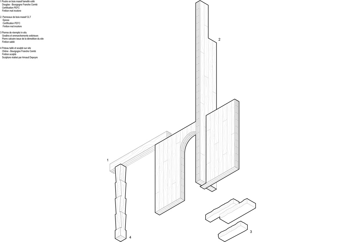 As a corollary to these industrialized forms, wood is also showcased in its more archaic, artisanal forms. The project incorporates hand carved solid oak posts from the nearby forest. As for the forecourt, it makes the most of the reuse of ashlar blocks from the site's former buildings.