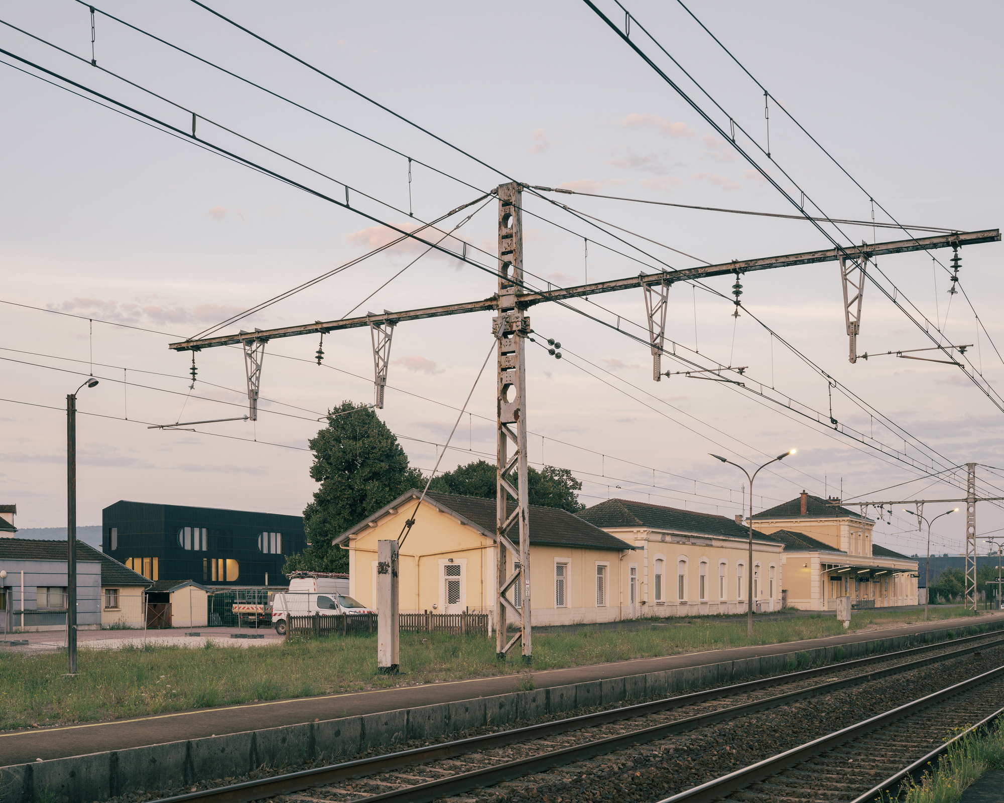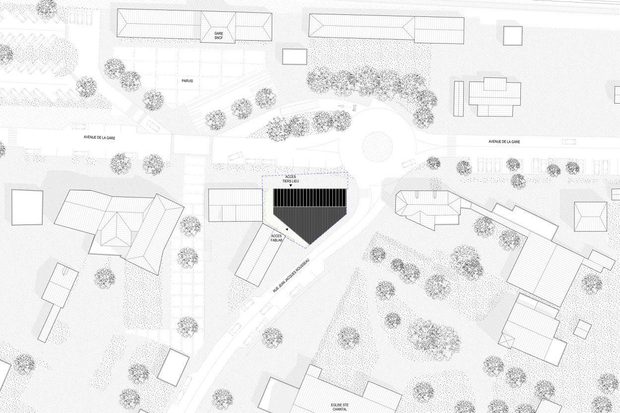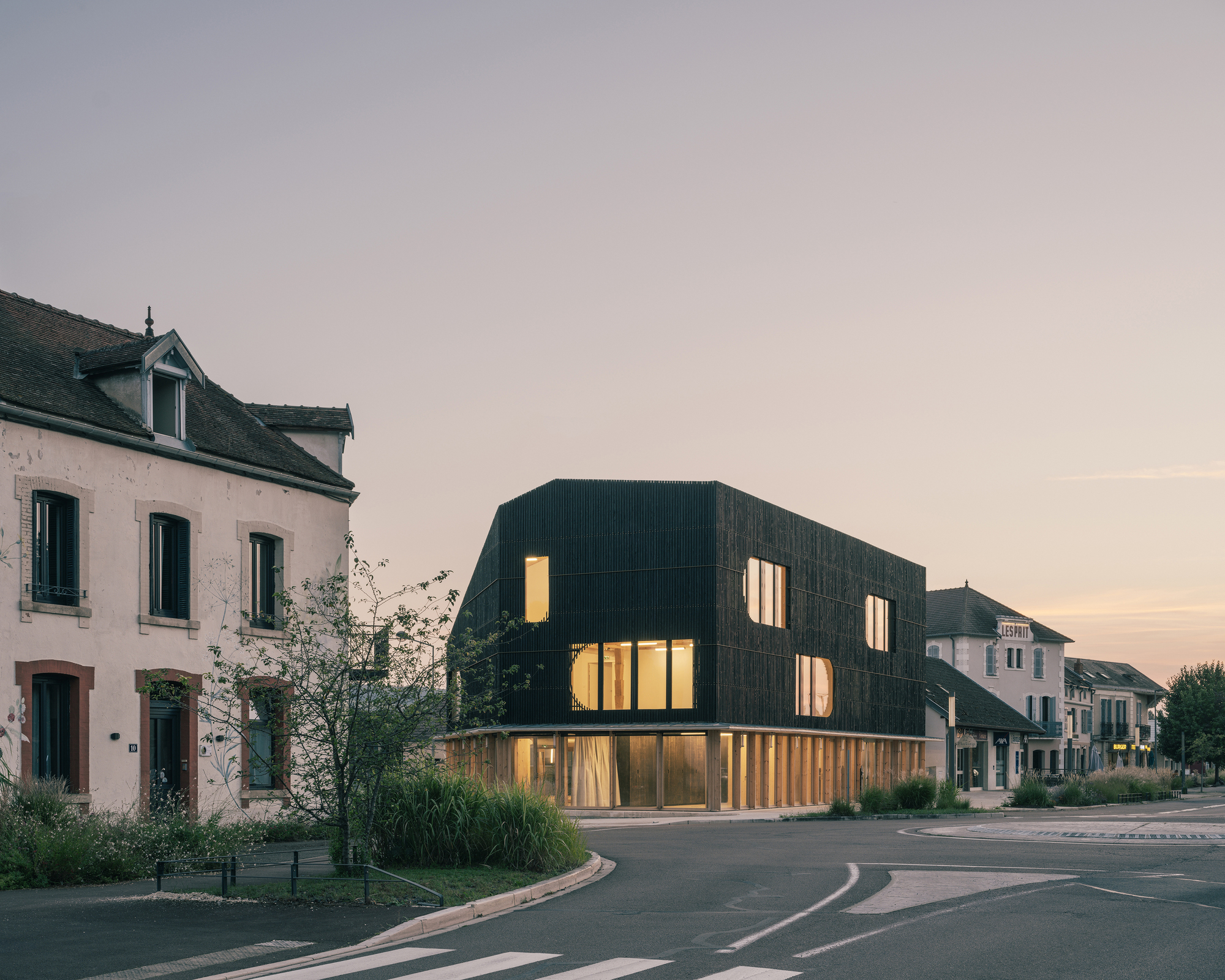 Situated across from the train station, the strange prismatic volume of the M.I.N.E. (Maison de l'Innovation Numérique et Ecologique) houses an inclusive training and creative space dedicated to digital tools and the promotion of local resources and know how. The ground floor is a showcase open to the city. Above, the dark mass of burnt shousugiban wood forms a "cookie-cutter" light filter, with wide openings to the landscape.