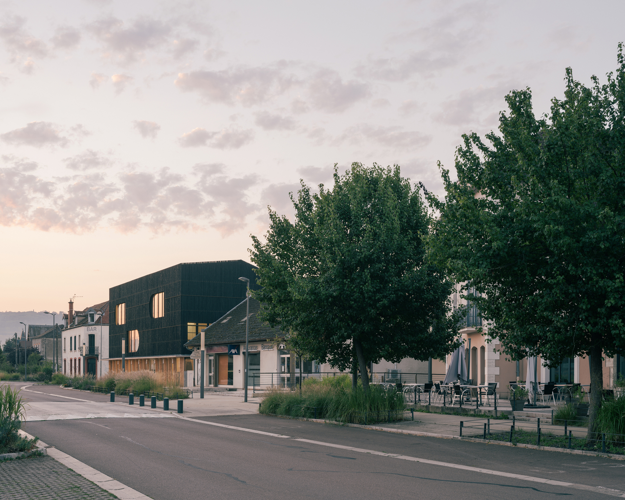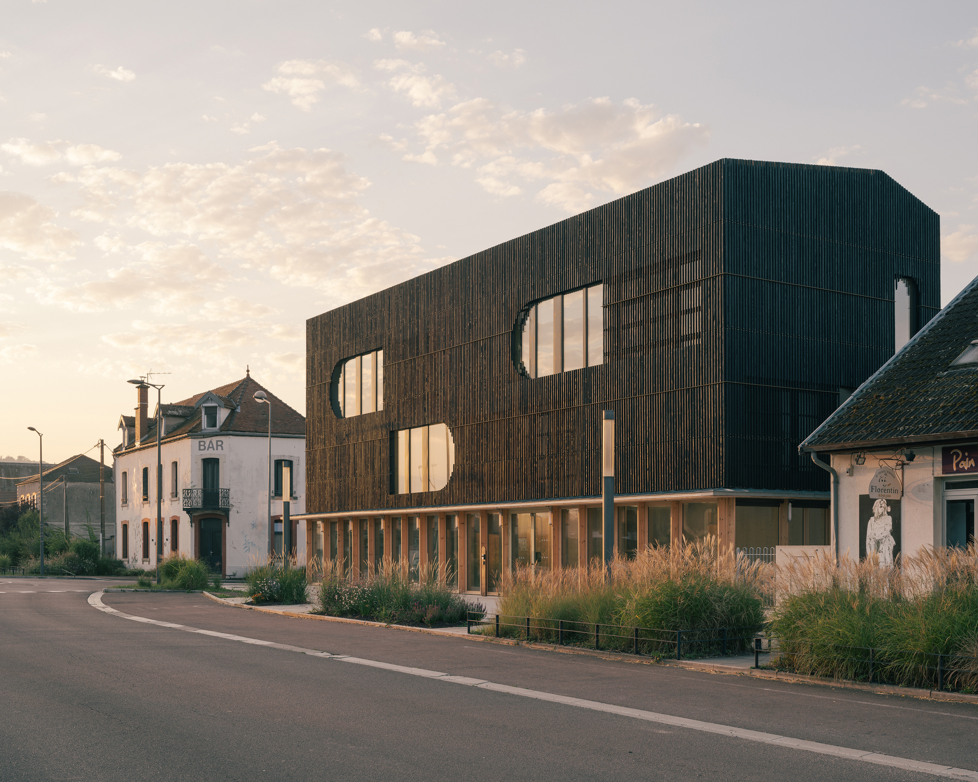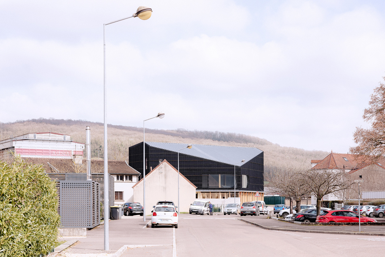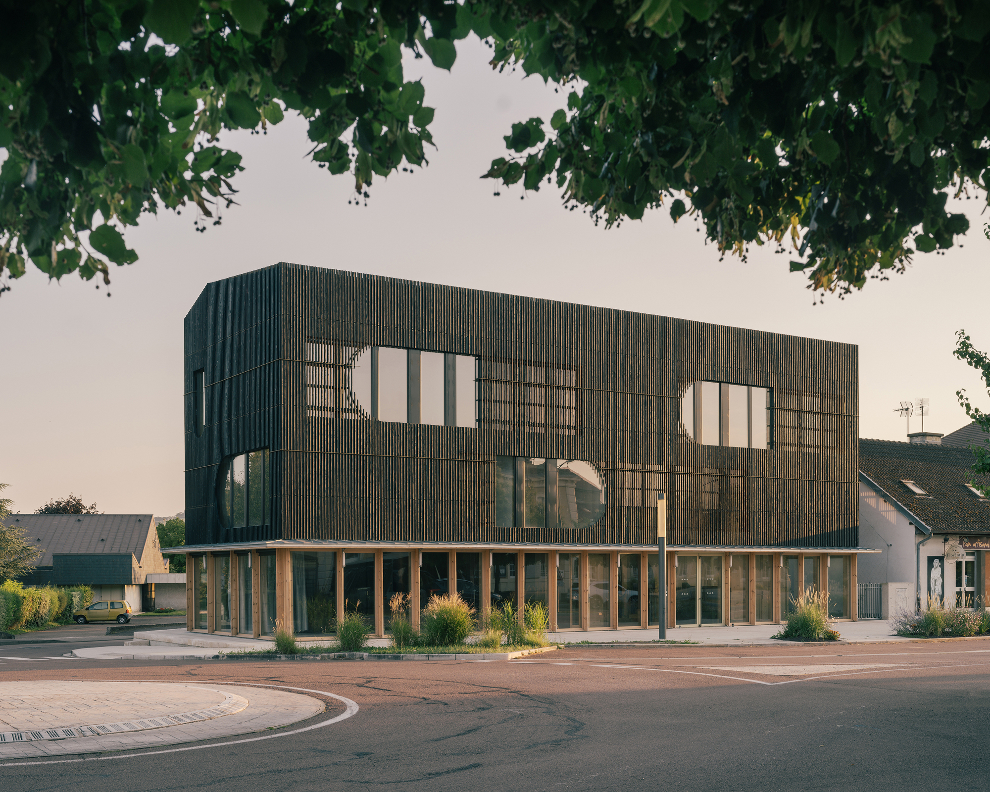 Neighboring the Morvan and Châtillonnais regions, the project uses wood in all its components. The superstructure combines a solid timber post-and beam system with large, monolithic CLT bracing walls. Made using digital prefabrication, they feature semicircular holes echoing those of the façade.