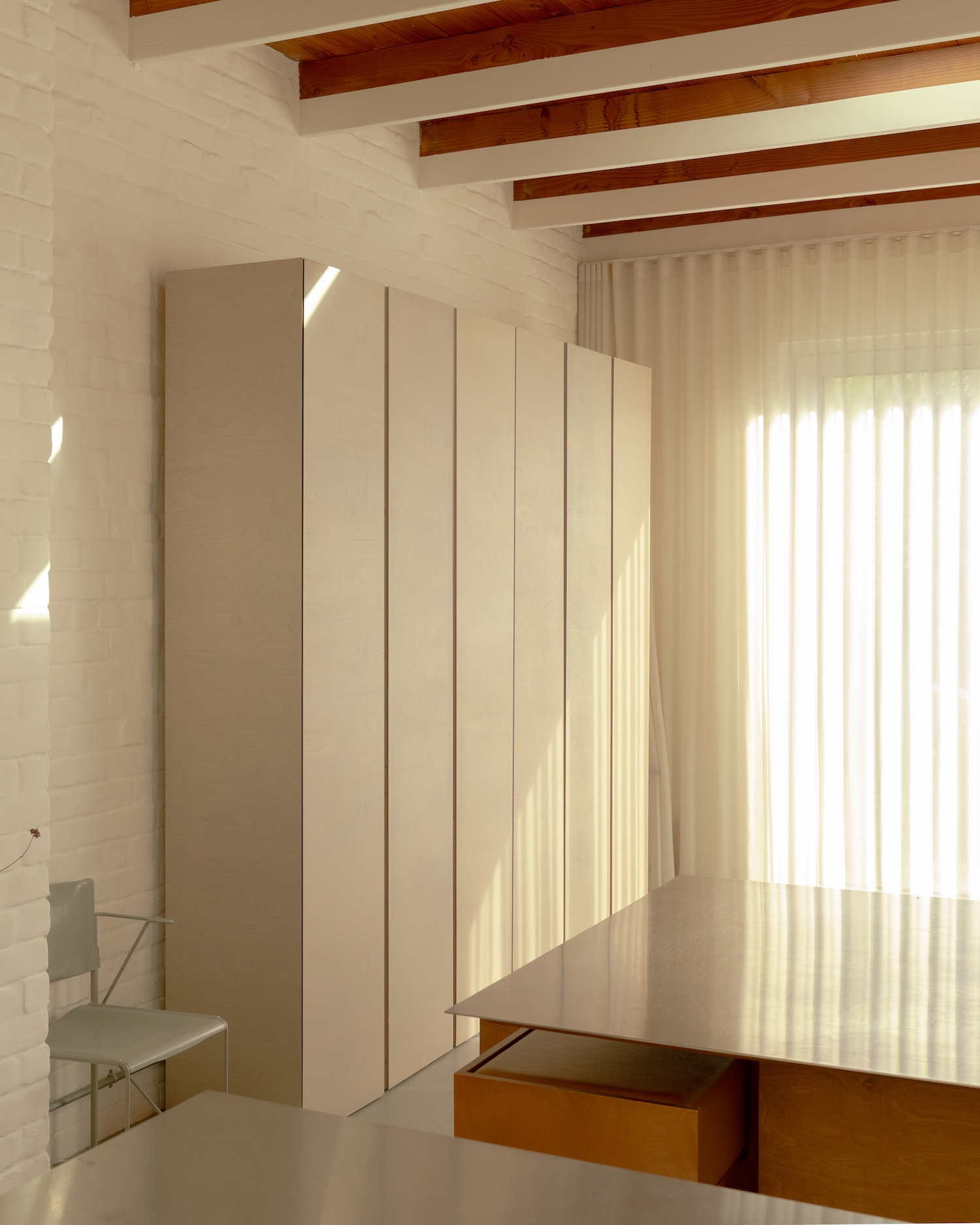 Materials speak in whispers rather than shouts: timber laminated into panels and subtly tinted; stainless steel plate offering quiet reflection; grey ceramic tiles providing visual calm. The palette is deliberately restrained – off white paint, clear anodized aluminum, black and grey silicone – allowing the space’s inherent flexibility to take center stage.