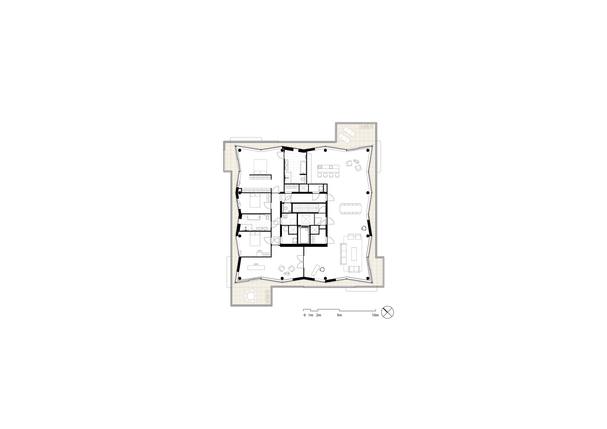 보포르트 타워는 지상 10층으로 구성되며, 각 층에는 두 개의 L자형 아파트가 배치되어 있습니다. 각 층은 90도씩 회전하여 층마다 발코니의 형태와 위치가 다르게 디자인되었습니다.이 회전 패턴은 입면의 시각적 다양성을 제공하며, 숲과의 시각적 연결성을 강화합니다.