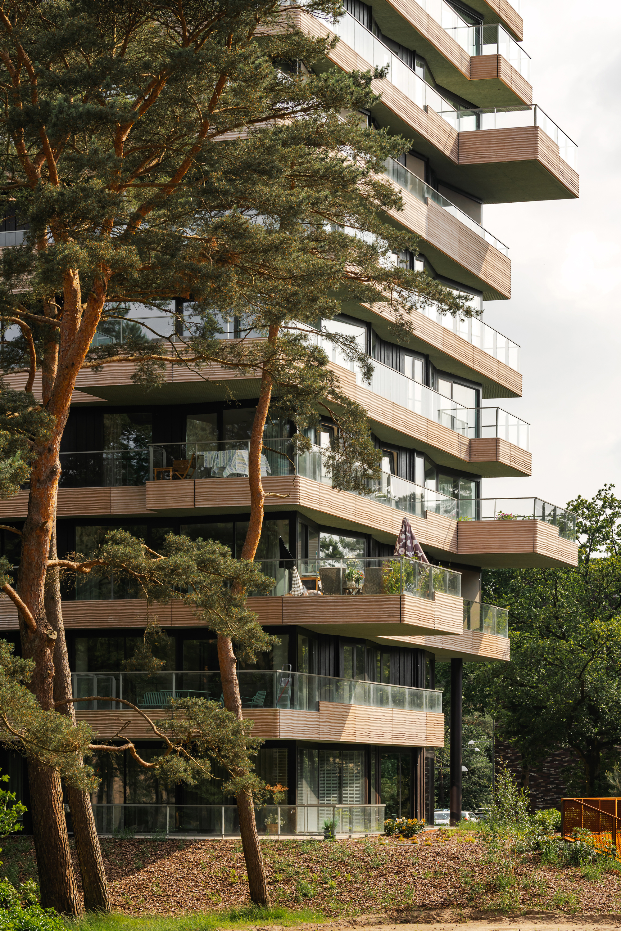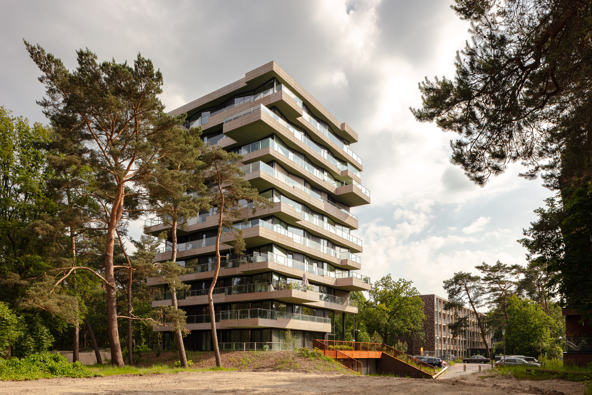 The tower looks sculptural, but it is also composed within a rational grid, with a supporting structure made up of the core and the columns set into the facade. This structure extends into the half sunken car park, where the storage units of the apartments are also located. The building contains 10 floors above ground, with two L-shaped apartments arranged symmetrically on each floor, which are rotated 90 degrees with respect to the floor below. The exception within this configuration is the top floor, containing a penthouse with a 360-degree view of the surroundings. The apartments feature spacious outdoor spaces on all sides. The alternate floor slabs extending outwards create 'outdoor rooms' at strategic points. Here, the border between inside and outside seems to blur, allowing the wooded surroundings to become part of the living experience on this remarkable site. Because the apartments on each floor are mirrored, the outdoor spaces on each level are positioned differently. The theme of 'sand' encompasses the balcony parapets and terraces. Outdoor ceilings are designed as part of the 'leaf' theme, taking the form of an informal green finish on all the lower sides of balconies and cantilevered surfaces. Finally, the supporting columns and Frake timber façade cladding are elaborated as part of the 'tree trunk' theme.