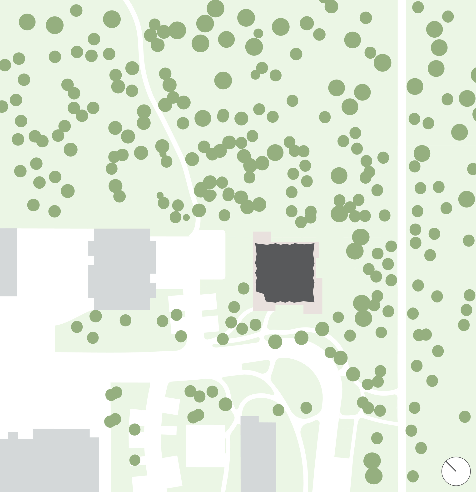 The nature inclusive landscape design surrounding the building aims to preserve and enhance the existing biodiversity and qualities of the natural environment. By planting a rich variety of local vegetation species on the semi-underground parking garage, the forest extends to the facades of the building. Besides the planting, various other design solutions have been implemented to make the parking garage disappear into the landscape; the use of turf bio-blocks for cladding the retaining walls, open paving for the parking spaces, and tree trunks as retaining structures. Rainwater collected from the roof and terraces is directed to the nearby swales.
