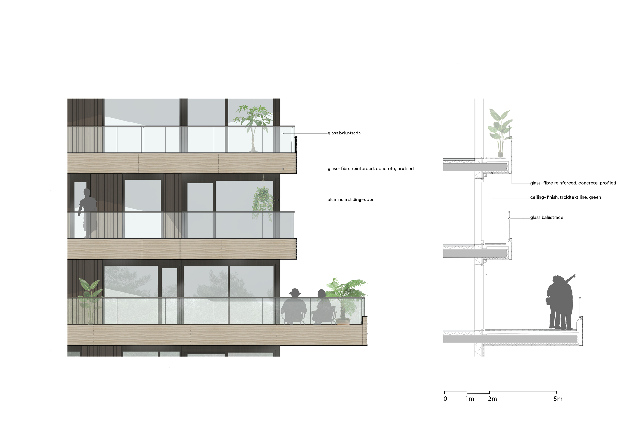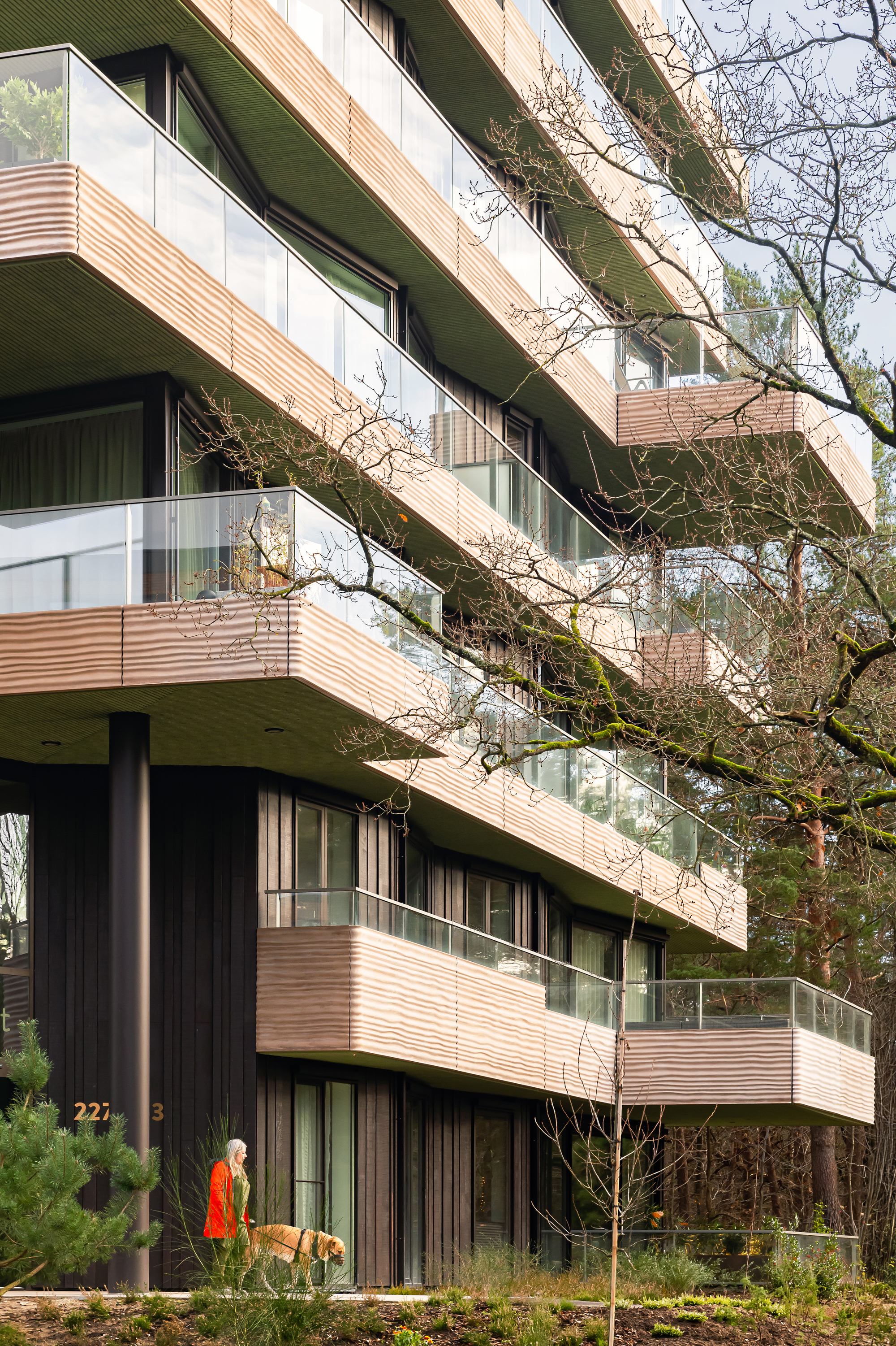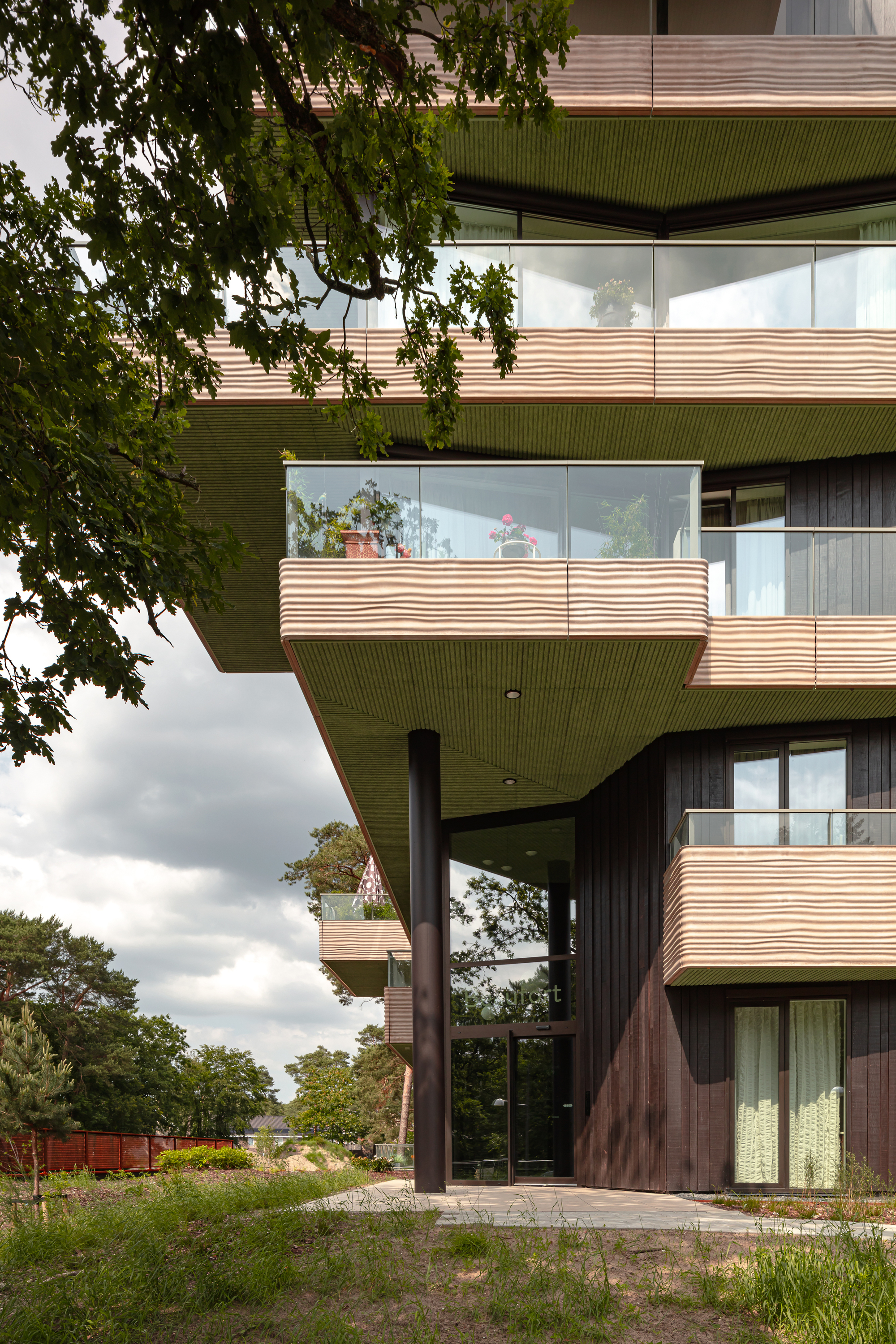 발코니 난간과 테라스는 물결 패턴의 GRC 패널(유리 강화 콘크리트)로 마감되어 있습니다. 이 패턴은 빛의 방향과 강도에 따라 변화하며, 마치 바람에 흔들리는 모래 언덕을 연상시킵니다.건물의 주요 구조는 열처리된 프라케(Fraké) 목재로 마감되어 있습니다. 이 목재는 습기에 강하고 고유의 질감이 살아 있어, 숲의 고유한 분위기를 한층 강화합니다.발코니 하부는 녹색 라인으로 마감되어 있으며, 이는 숲의 나뭇잎을 바라볼 때 느껴지는 자연스러운 색감을 반영하여 건물과 자연의 경계를 모호하게 만듭니다.