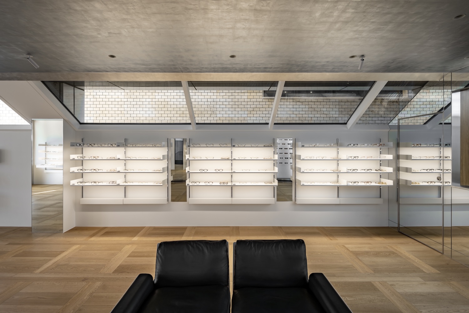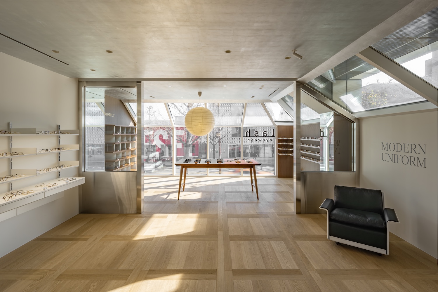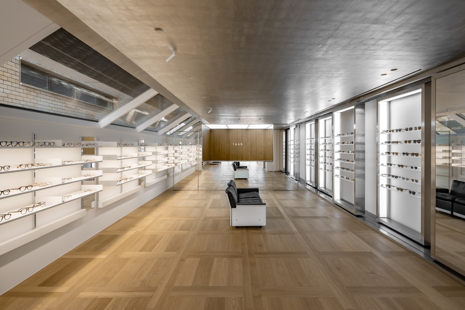 Lash Hannam은 화이트 메탈 선반(안경 디스플레이)과 브라운 우드 선반 및 거울 구역을 대칭적으로 배치해 방문자의 시각적 중심을 명확히 한다. 은박(실버 포일) 처리된 천장은 자연광을 부드럽게 확산하며, 시간대에 따라 변하는 빛의 패턴을 연출한다. 이러한 반사 효과는 시각적 리듬을 부여해 공간에 생명력을 더한다. Dieter Rams 가구와 Bauhaus 디자인 요소는 단순함 속에 기능성과 미학을 조화시킨다.