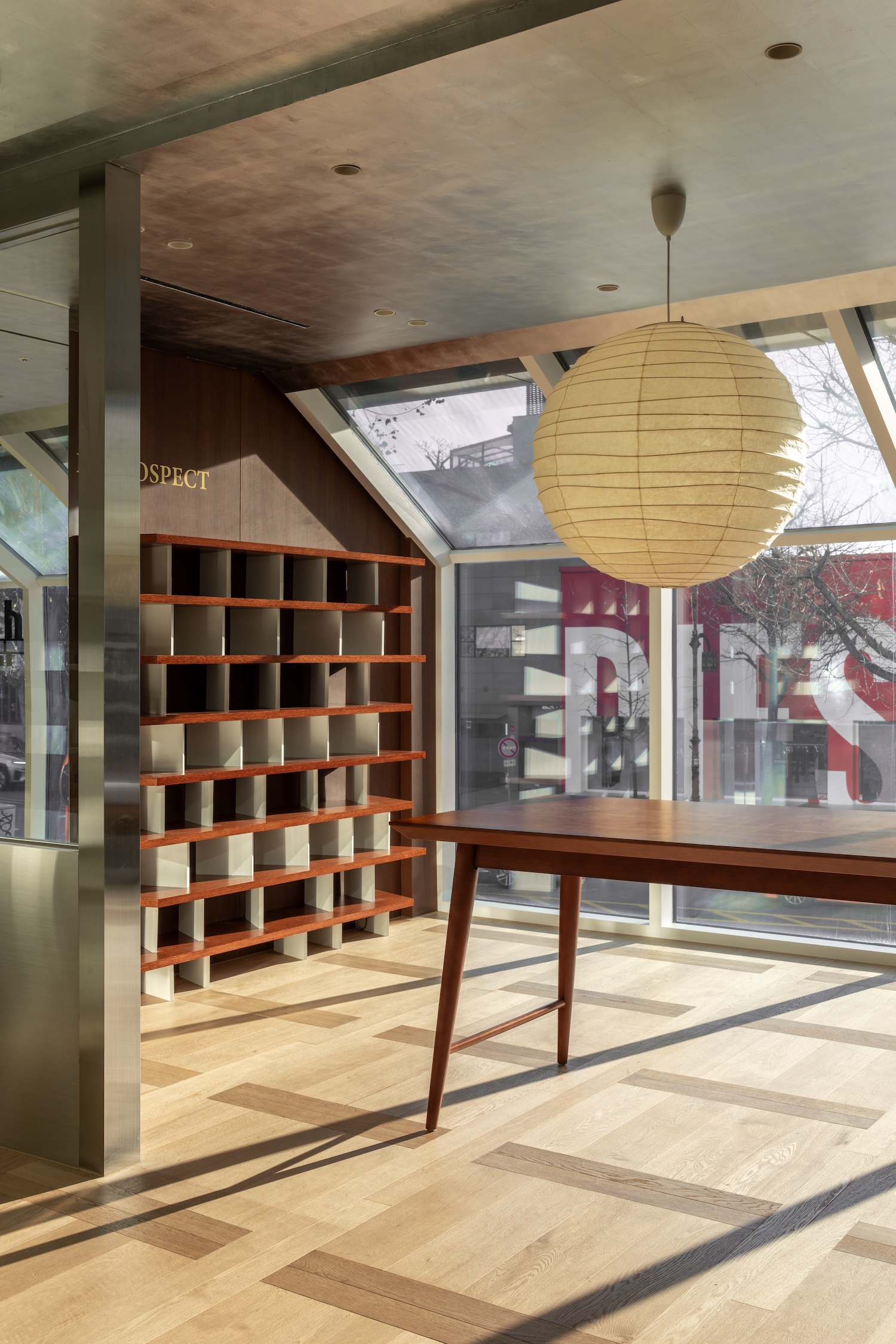 천장의 은박 포일은 낮에는 자연광을 확산해 부드러운 분위기를, 저녁에는 인공조명을 반사해 공간에 입체감을 부여한다. 중앙의 이사무 노구치 스타일의 종이등은 부드러운 확산광을 제공하며, 공간에 온기를 더한다. 긴 설명 뒤에는 간결한 요약으로 리듬을 조절해 독자의 이해를 돕는다.