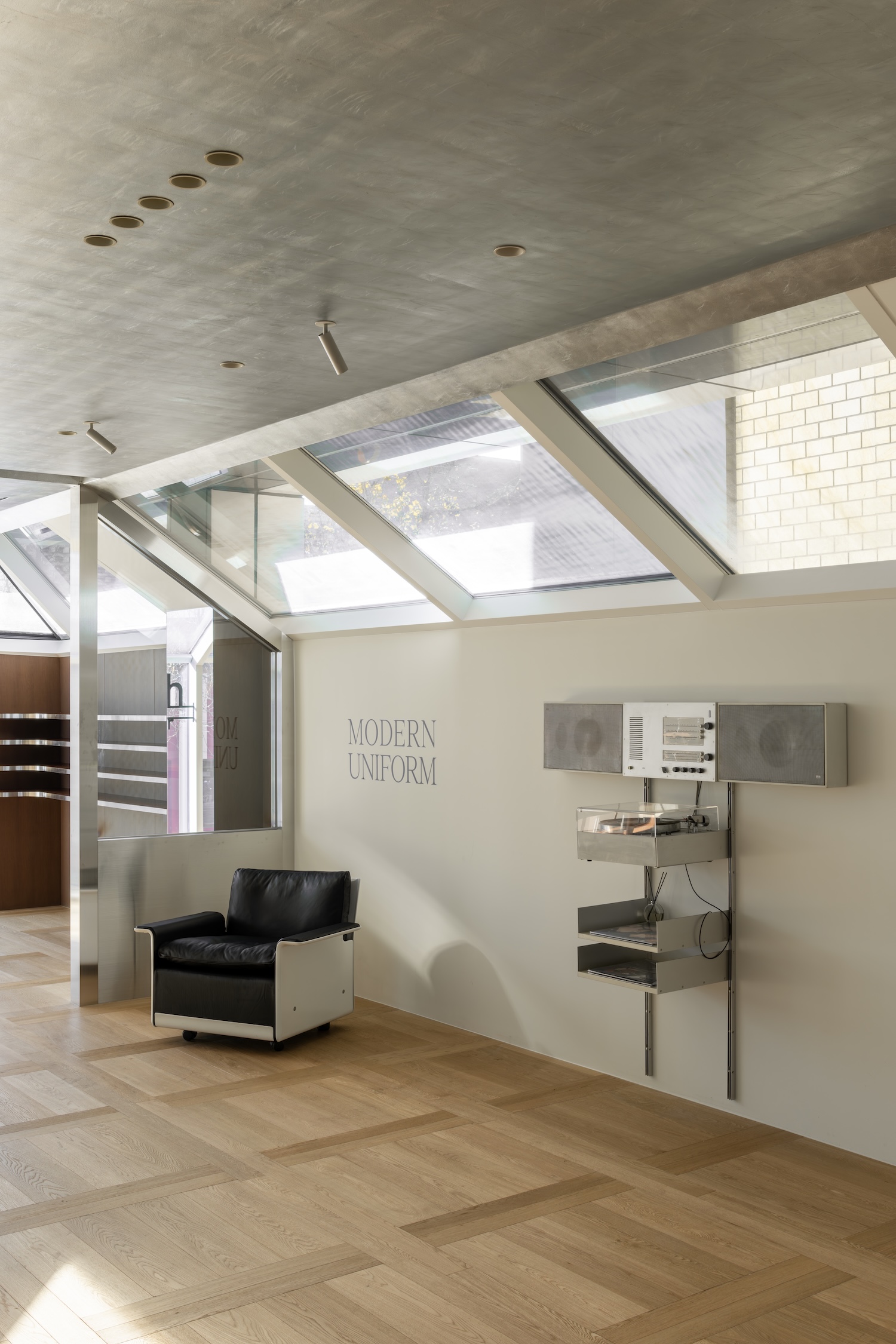 The space draws deep inspiration from modernist principles, particularly evident in its carefully curated furniture selections. The presence of Dieter Rams-designed pieces and iconic Bauhaus-era elements from Vitsoe and Braun Audio speaks to a commitment to functional minimalism. These choices aren’t merely decorative; they establish a dialogue between the eyewear displays and their surrounding environment, creating what might be called a gesamtkunstwerk – a total work of art where each element reinforces the others.