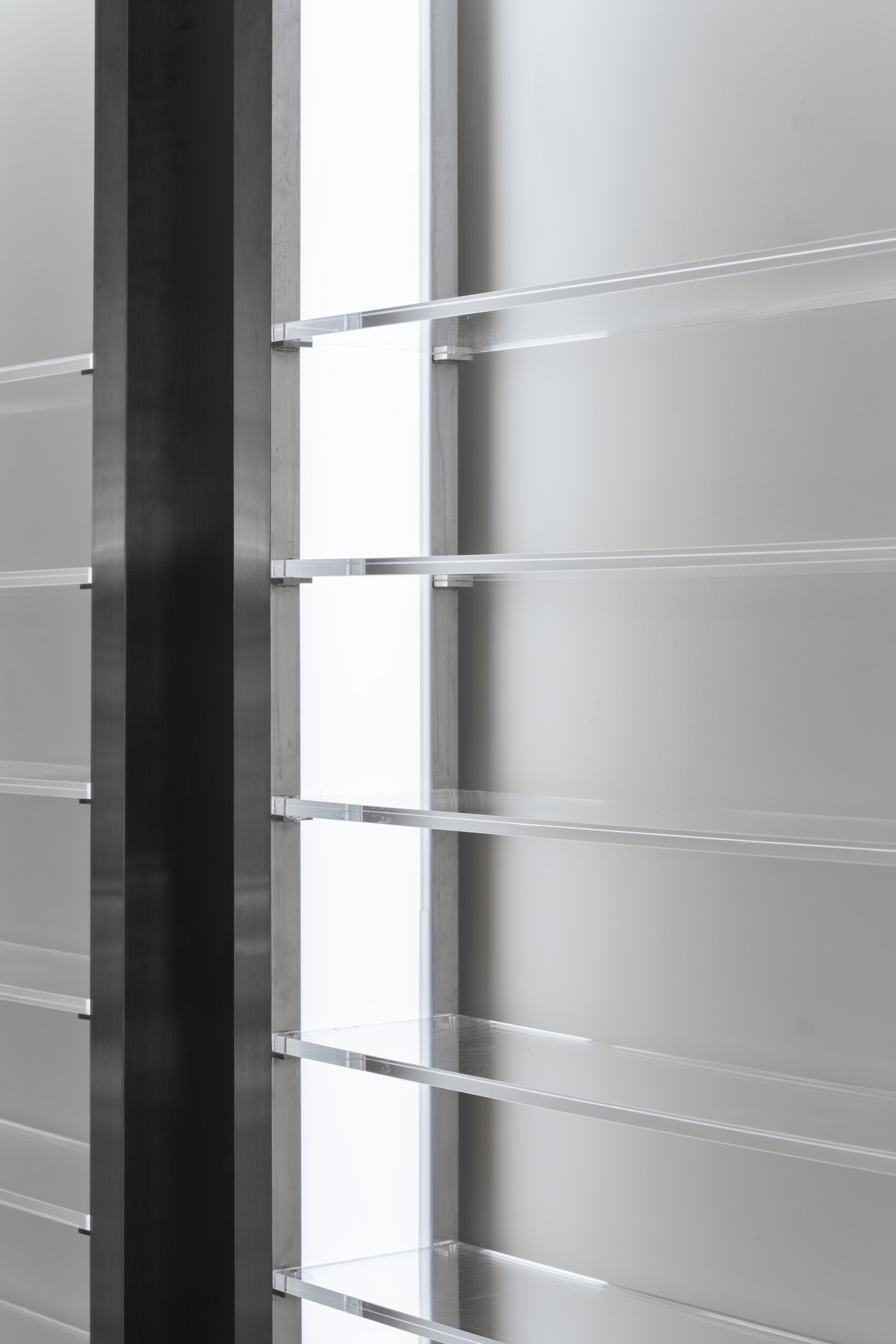 화이트 메탈 선반은 안경 컬렉션을 강조하며, 거울 패널은 자연광을 반사해 공간을 넓게 보이게 한다. 거울은 단순한 반사 도구를 넘어, 공간 전체에 빛을 분산시켜 밝기를 증대시킨다.