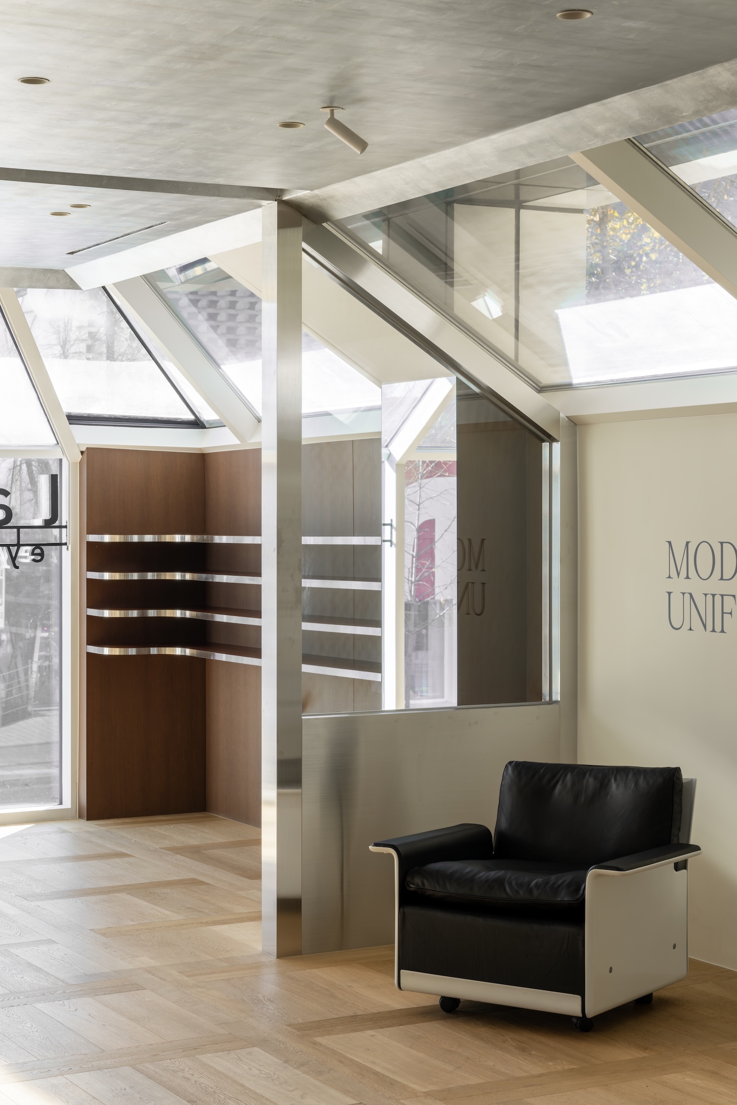 입구에서는 대형 유리창을 통해 외부 풍경이 내부로 자연스럽게 연결되어 방문자의 시선을 이끈다. 쇼룸 중심부에 배치된 원목 테이블은 방문자가 자유롭게 시착하며 컬렉션을 탐색할 수 있도록 한다. 거울 구역은 자연광을 반사해 공간을 확장하며, 고객이 다양한 각도에서 시착 모습을 확인할 수 있게 한다.