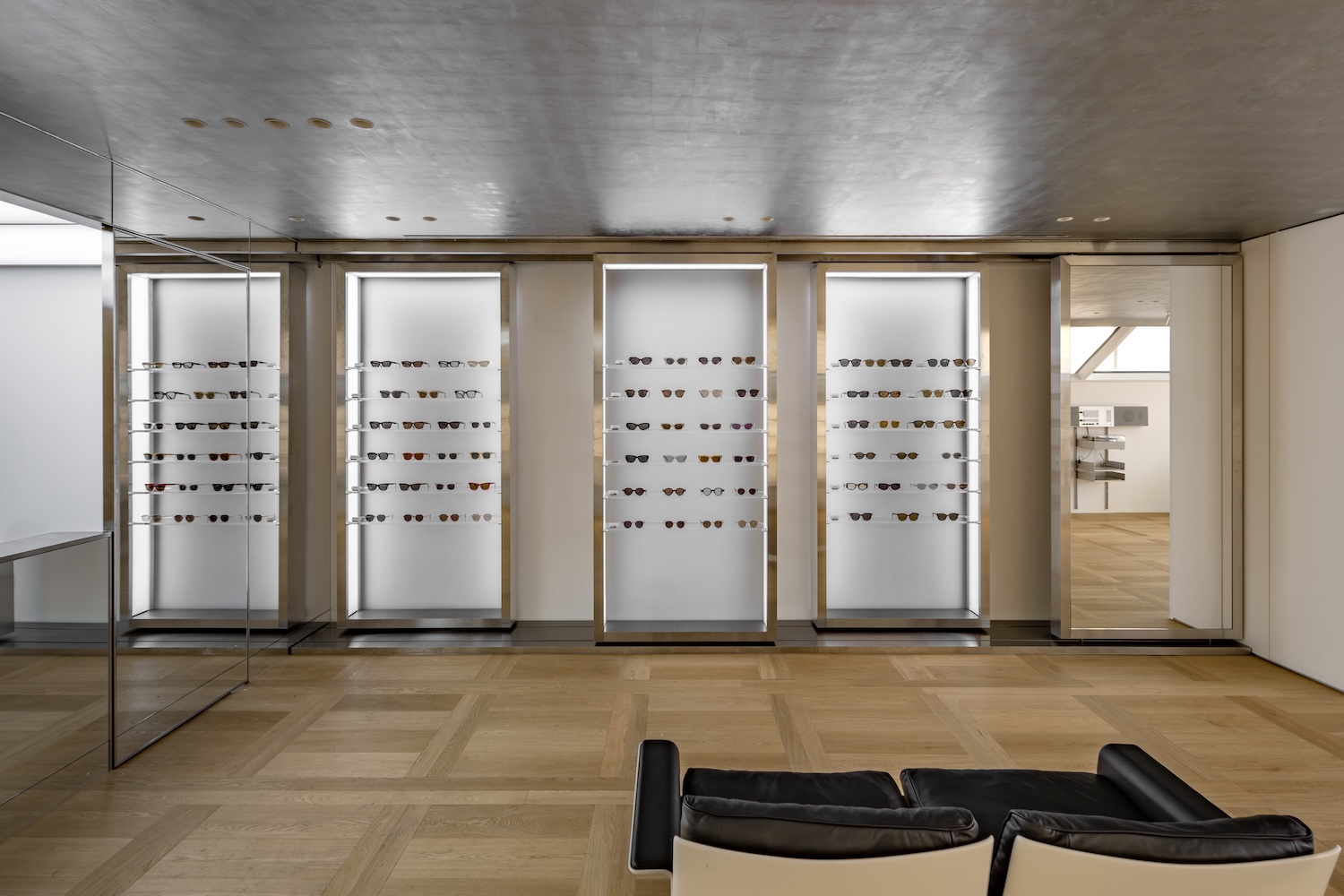 The lighting design works in concert with the metallic ceiling to create varying atmospheric conditions throughout the day. As natural light shifts and moves across the silver foil surface, it produces a subtle choreography of reflections that transforms the customer experience. This sophisticated approach to illumination demonstrates an understanding that the presentation of eyewear requires more than just good task lighting – it demands an environment that celebrates the interplay between light, surface, and vision.