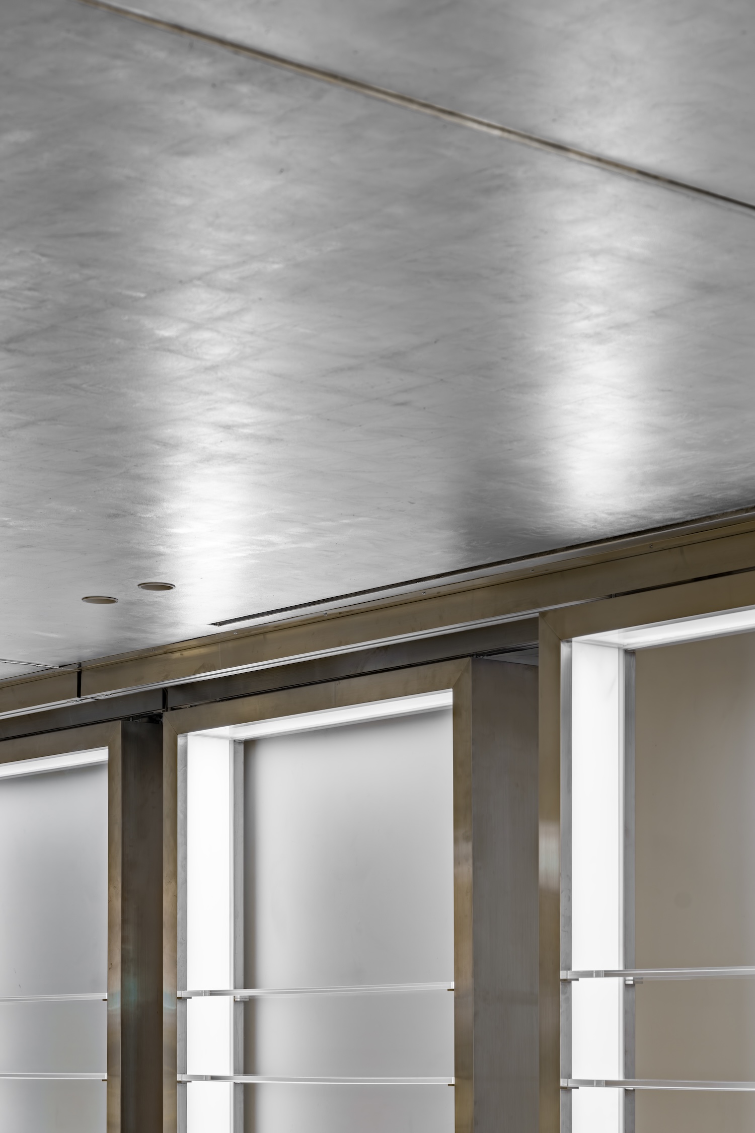 은박 포일 처리된 천장은 자연광과 인공조명을 부드럽게 확산시키며, 시간대에 따라 공간의 표정을 변화시킨다. 이 반사 효과는 공간에 움직임과 리듬을 부여하며, 방문자에게 끊임없이 새로움을 제공한다.