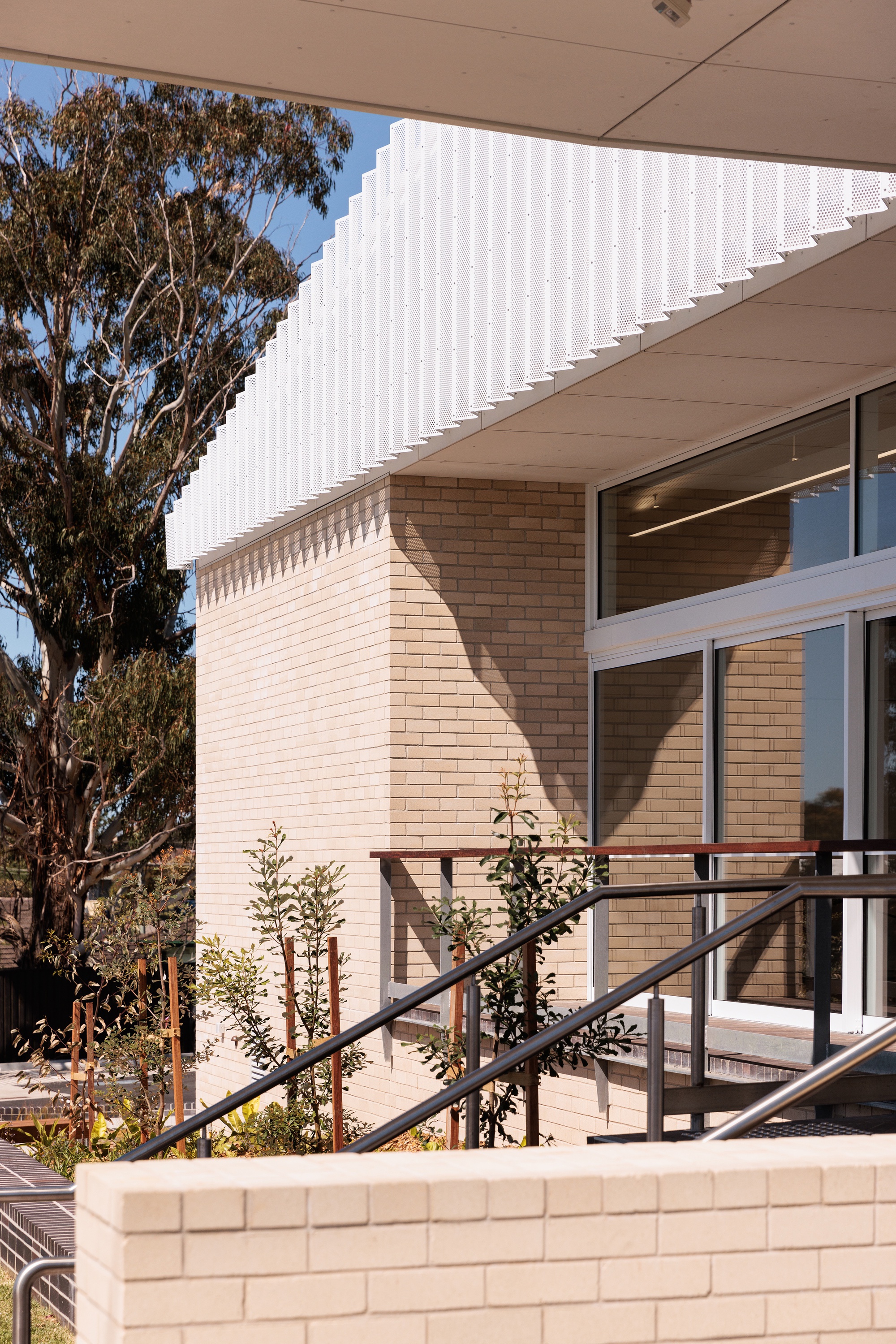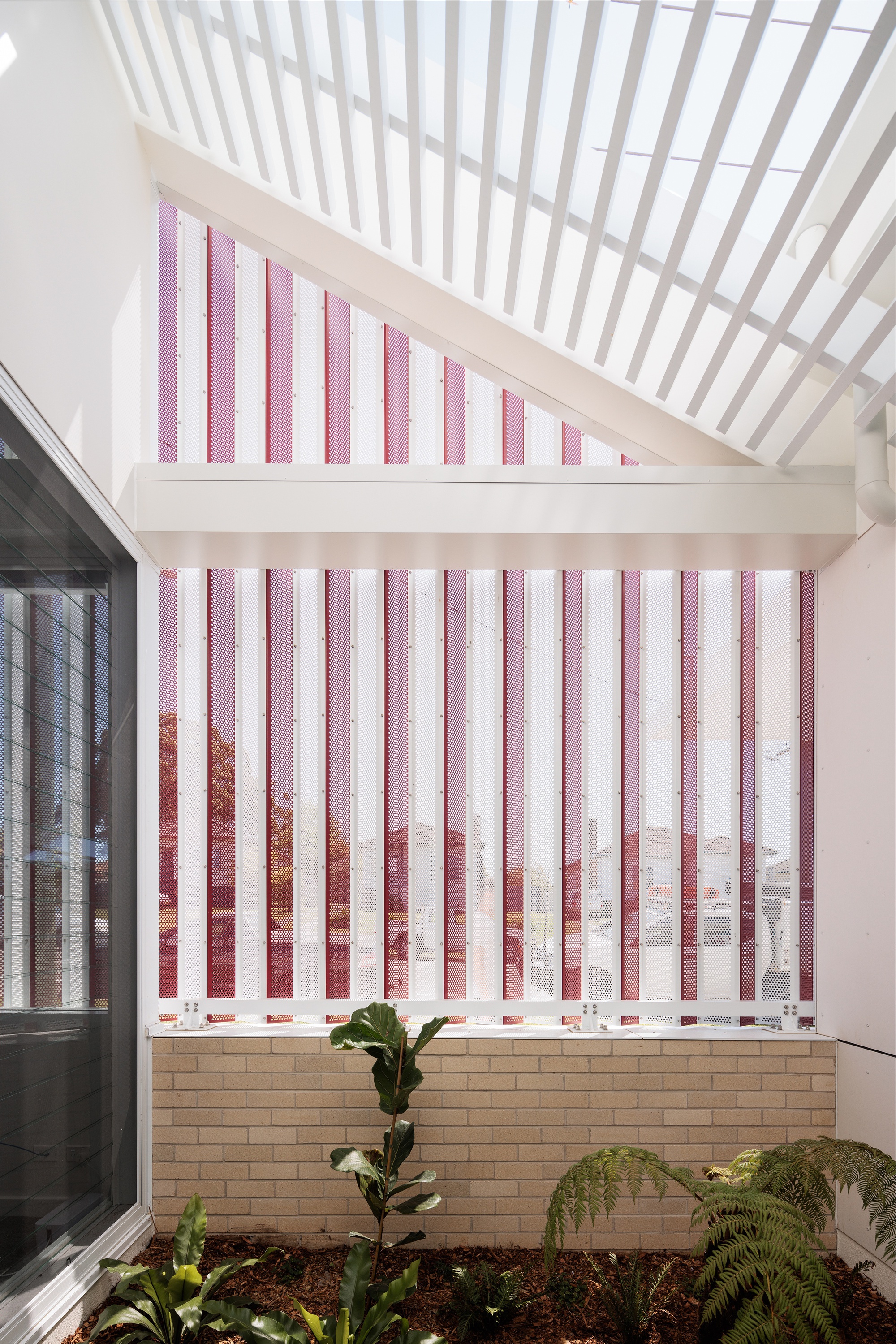 A folded screen made of perforated metal serves to shade the facade and enliven the streetscape, the vivid colors of local wildflowers revealing themselves as you move around the building, creating a sense of surprise and delight for everyday passers-by. The double gable forms are a nod to the post-war community hall that previously occupied the site.