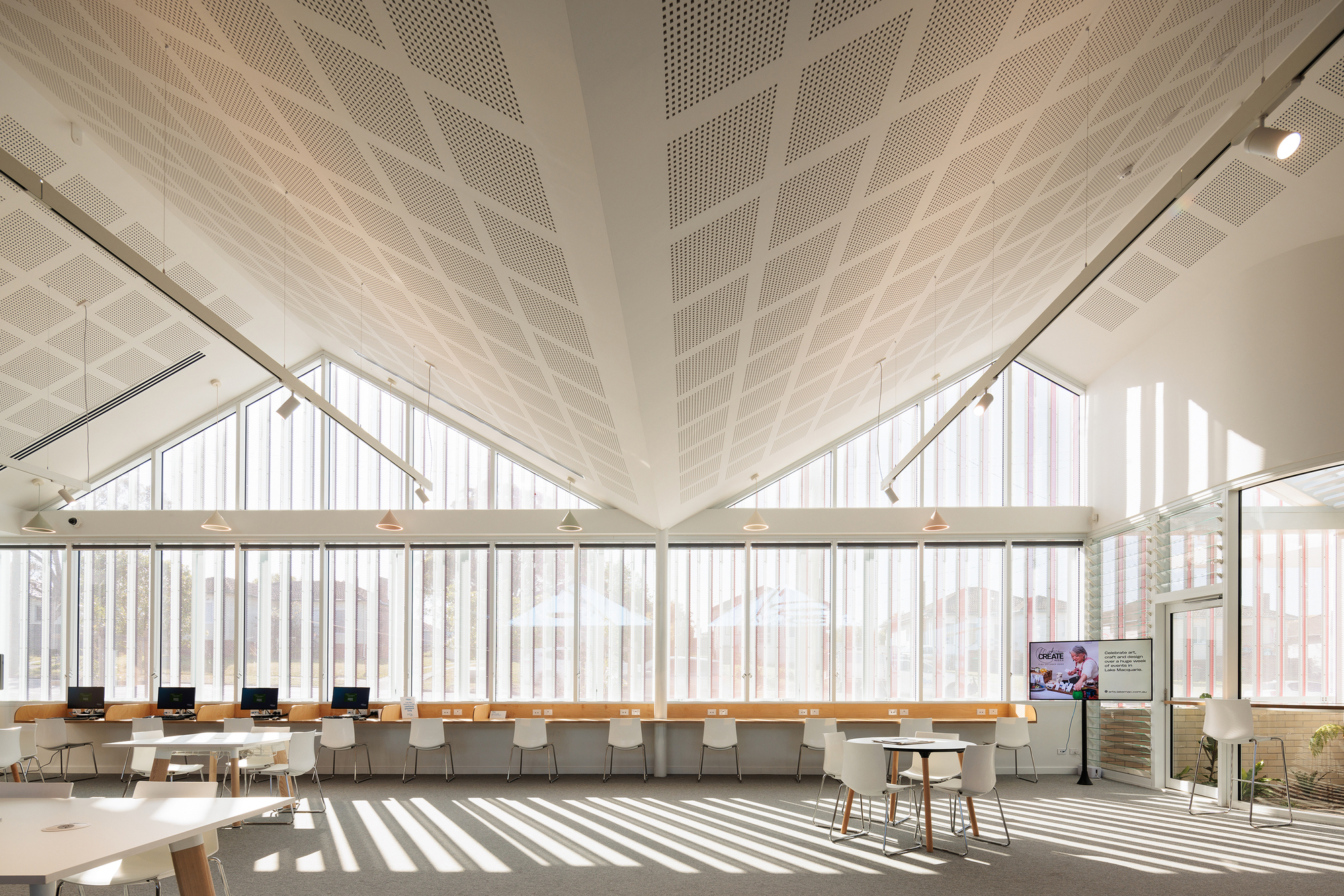 Part civic building, part community living room, the building is split into four main areas linked by an internal 'street'; a Community Hall, Public Library, Community Offices and Meeting Rooms, and a Youth Maker Space. This required a large floor plate on a sloping site. We utilize a sloping walkway to link the levels as well as for the library collection. Vaulted ceilings and internal courtyards draw in natural light and ventilation.