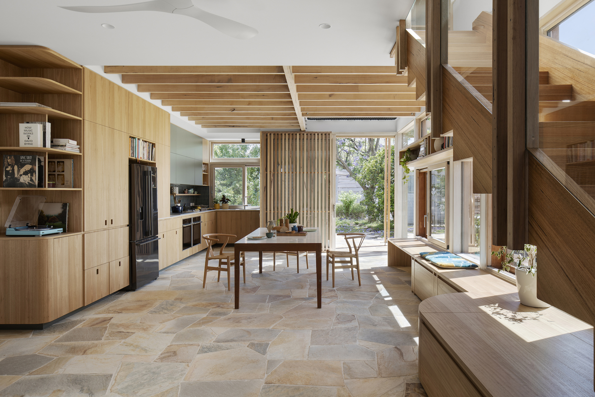 Above the dining area, a netted void functions as a thermal chimney. The pergolas provide shade, the planters near the windows offer easy access to edible gardens and reduce radiant heat, and the low embodied carbon stone flooring optimizes thermal comfort. Collectively, these measures reduce the building's global warming potential by 79% against the Australian average. Homes should have an identity and this home forms its identity from drawing in and giving back to the neighborhood.