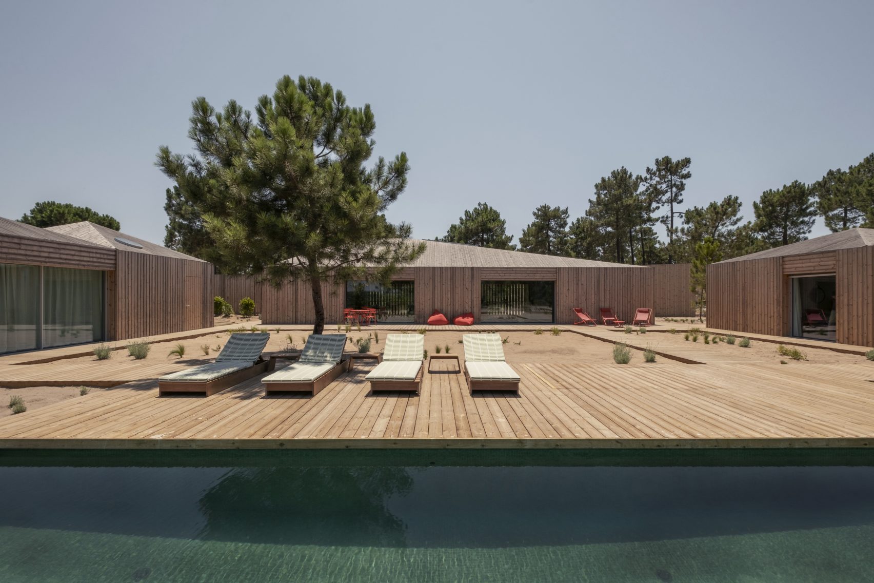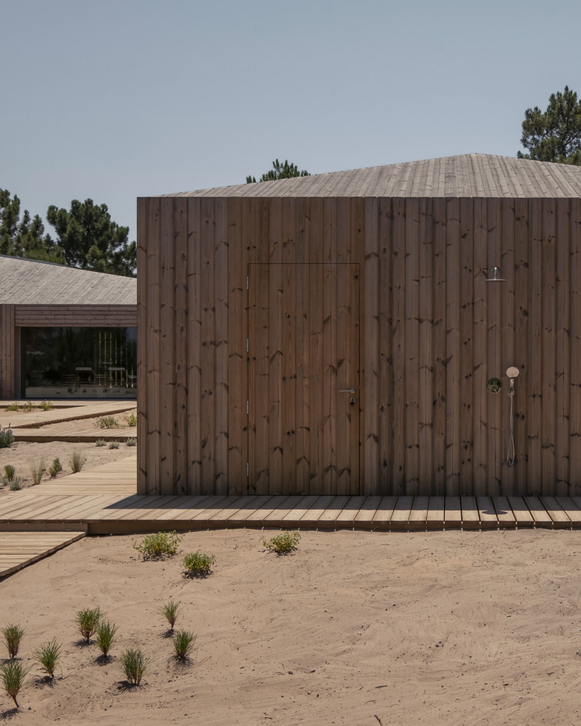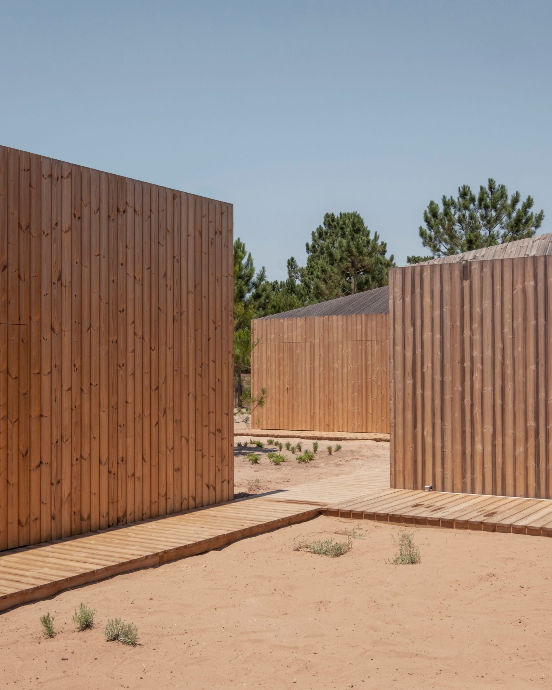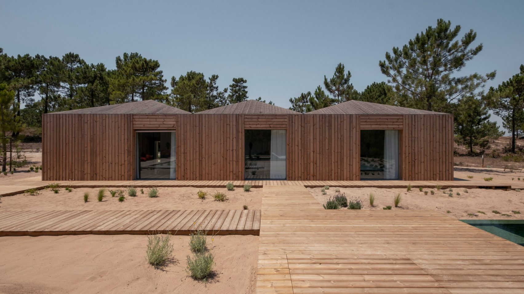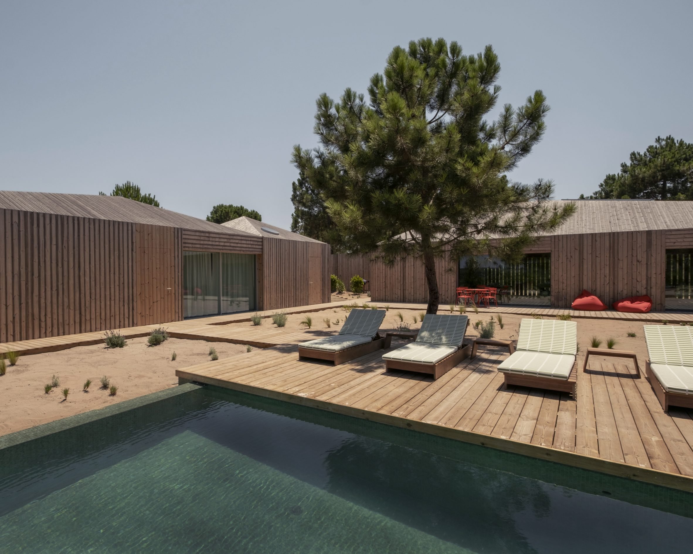 A cluster of wooden cabins modelled on fishing huts surround a patio and swimming pool at Casa Donovan, completed by Portuguese studio PIMAA Architects in the coastal village of Comporta.