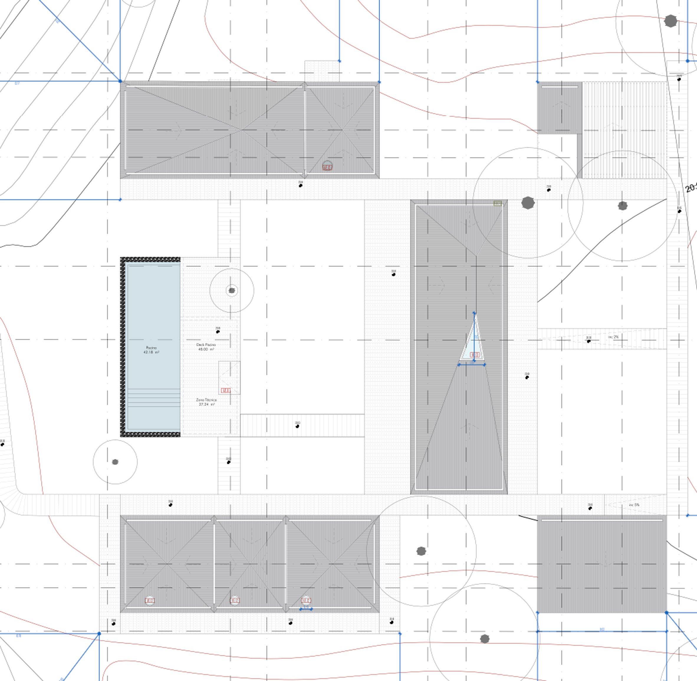 At the centre of the site is Casa Donavan's "day volume", which combines the living, dining and kitchen spaces beneath a sloping roof with a triangular skylight.