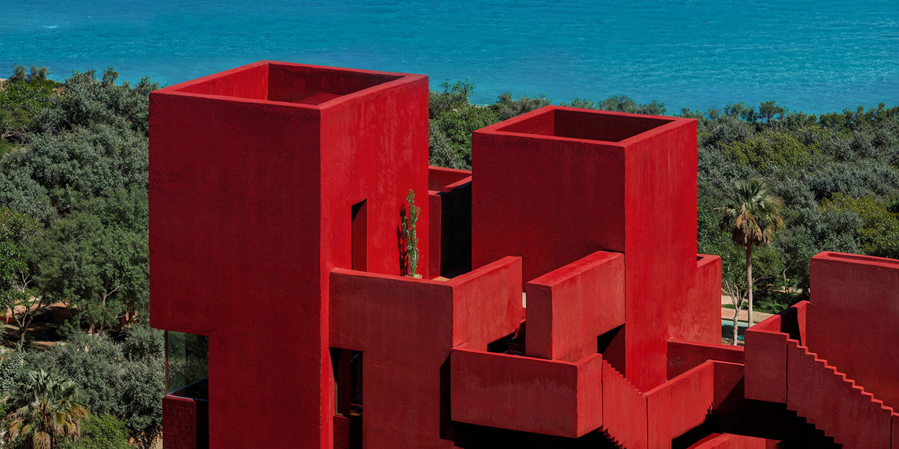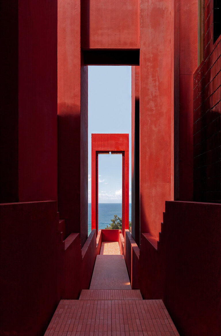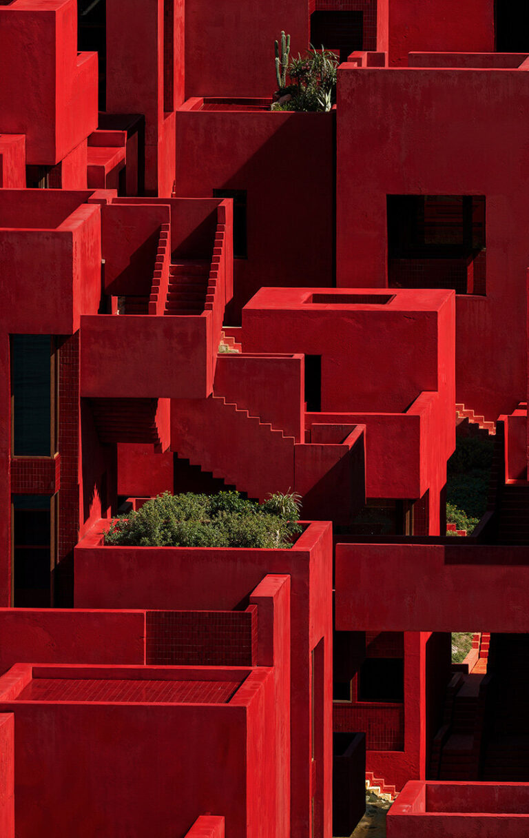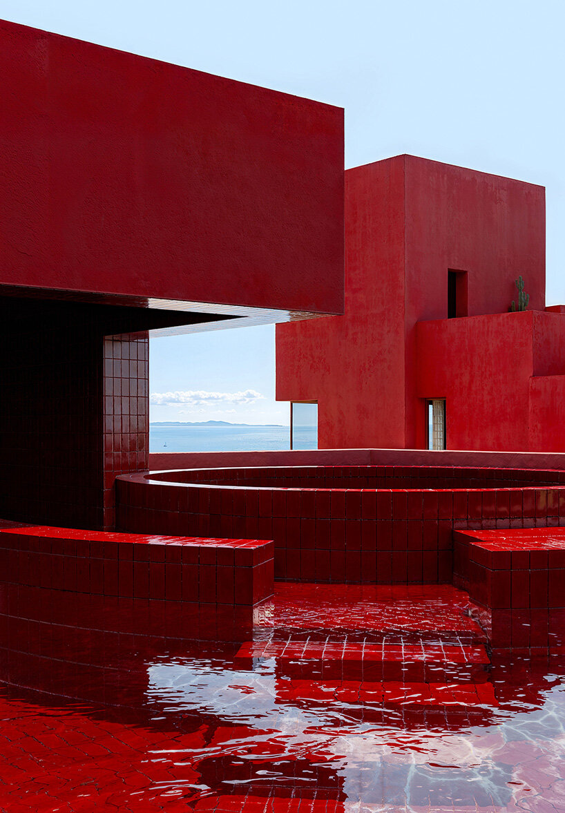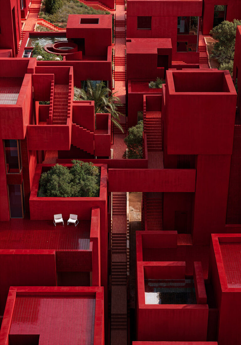 Rising from the verdant mountainside of Dhërmi, Albania, Bofill Taller de Arquitectura’s Red Sol Resort commands attention with its bold hue and fortress like silhouette. From afar, the striking geometric massing appears to float above the lush terrain. Winding exterior stairways, rooftop terraces, and dramatic walkways carve out a labyrinthine journey through the cascading volumes of the resort, offering guests a variety of vantage points overlooking the shimmering Ionian Sea.