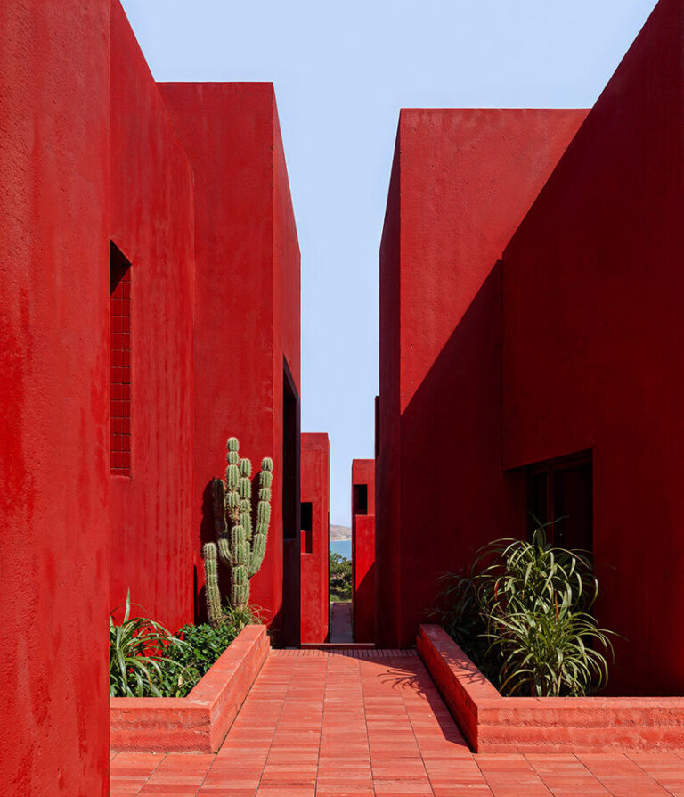 As the architecture zigzags down toward the water, its vertical movement mirrors the rhythm of the surrounding mountains. Painted in a vivid earthy red, the resort with its fortress like presence contrasts with the green and blue around. Interconnected by a network of exterior stairs, bridges, and pathways, the various blocks include pools, patios, and secluded lookouts.