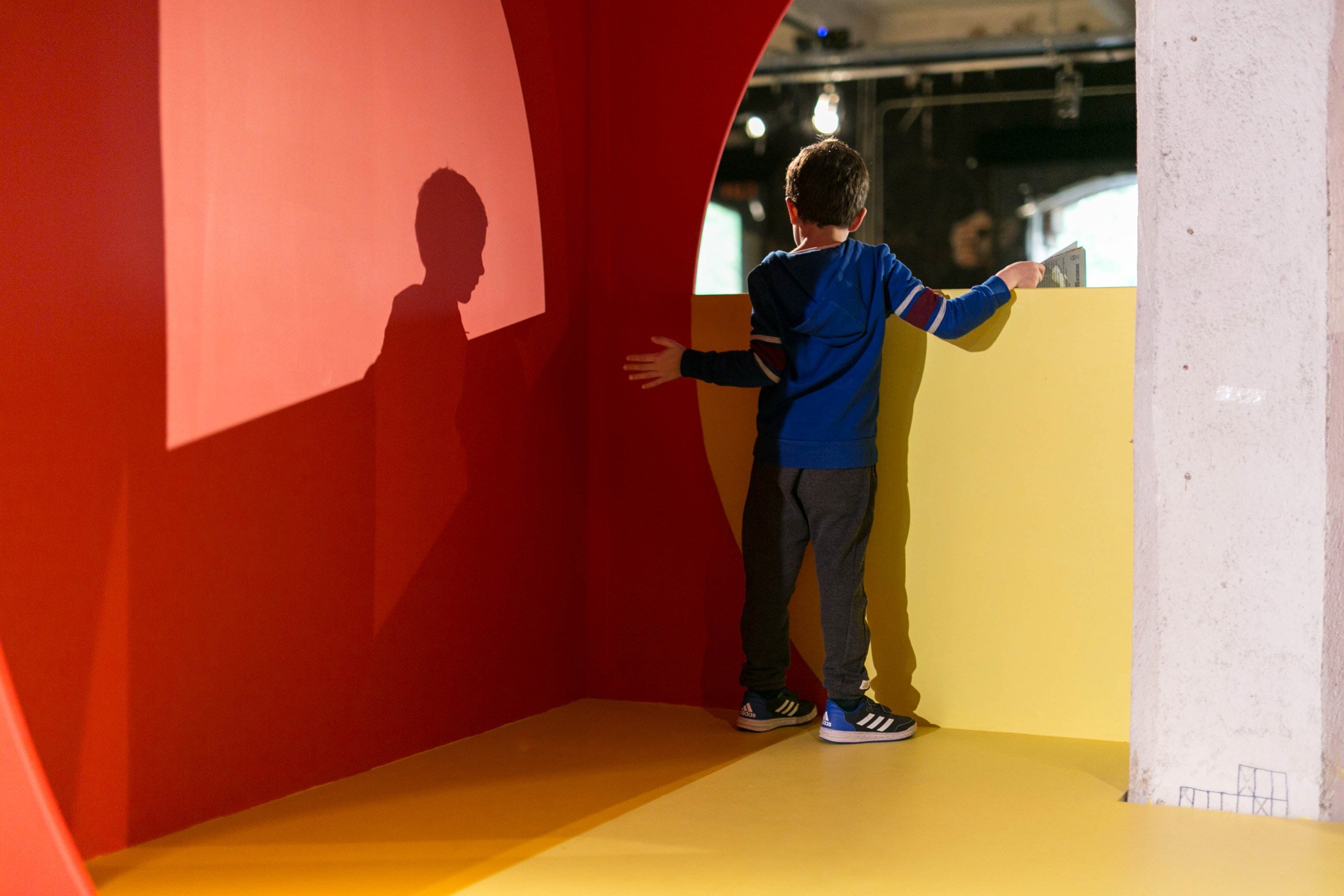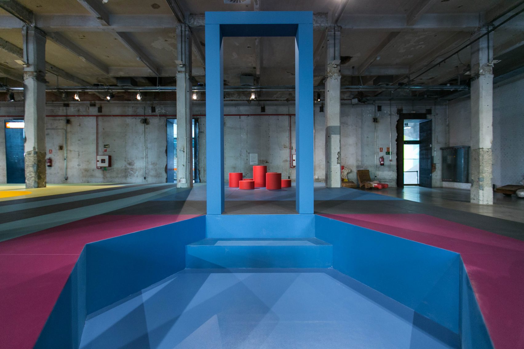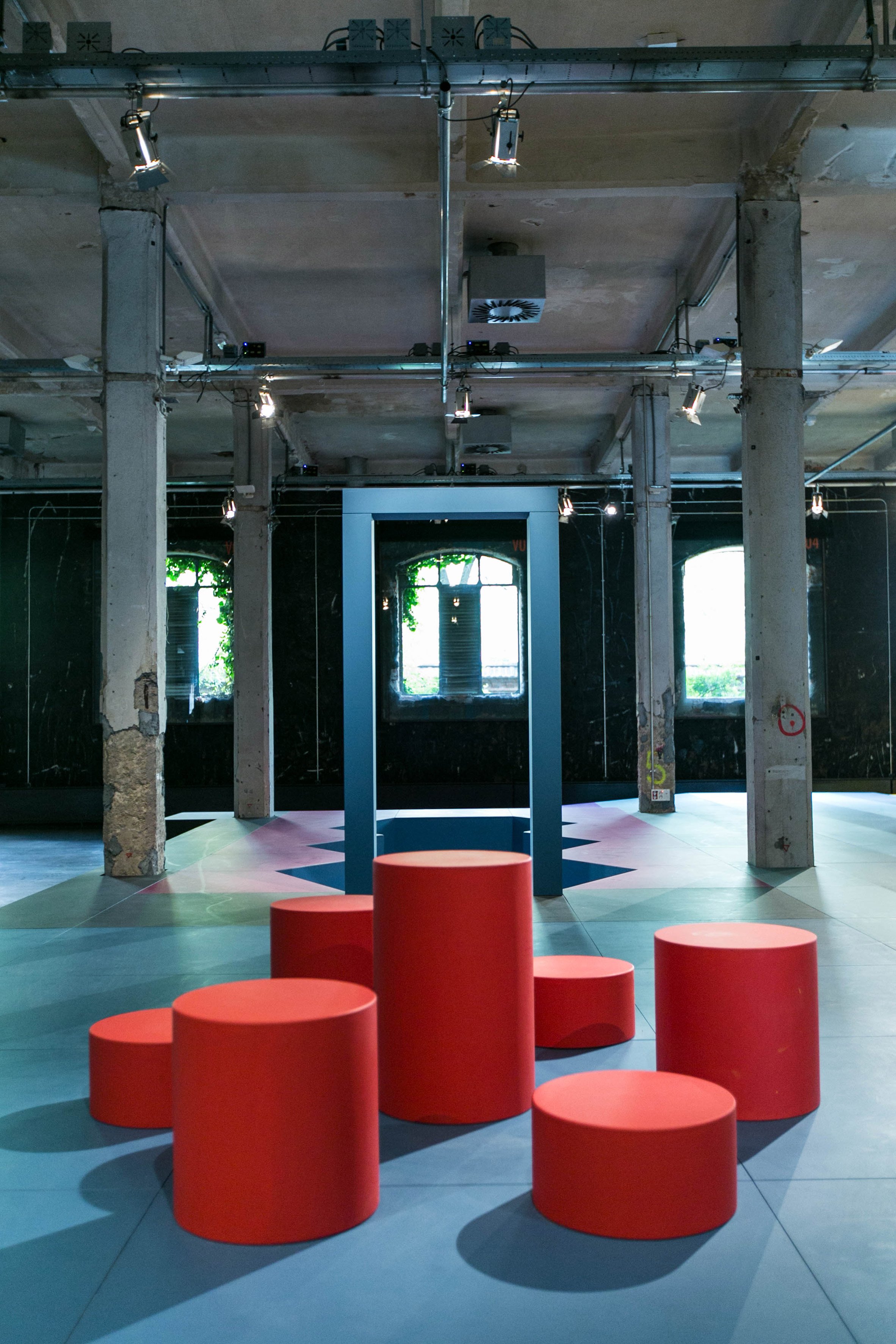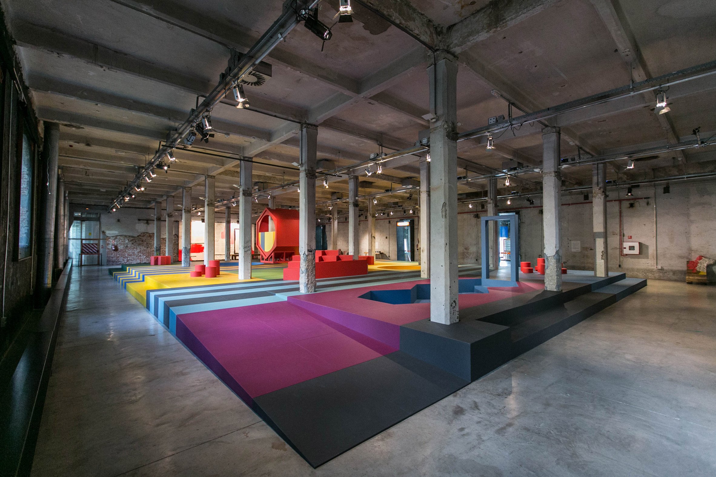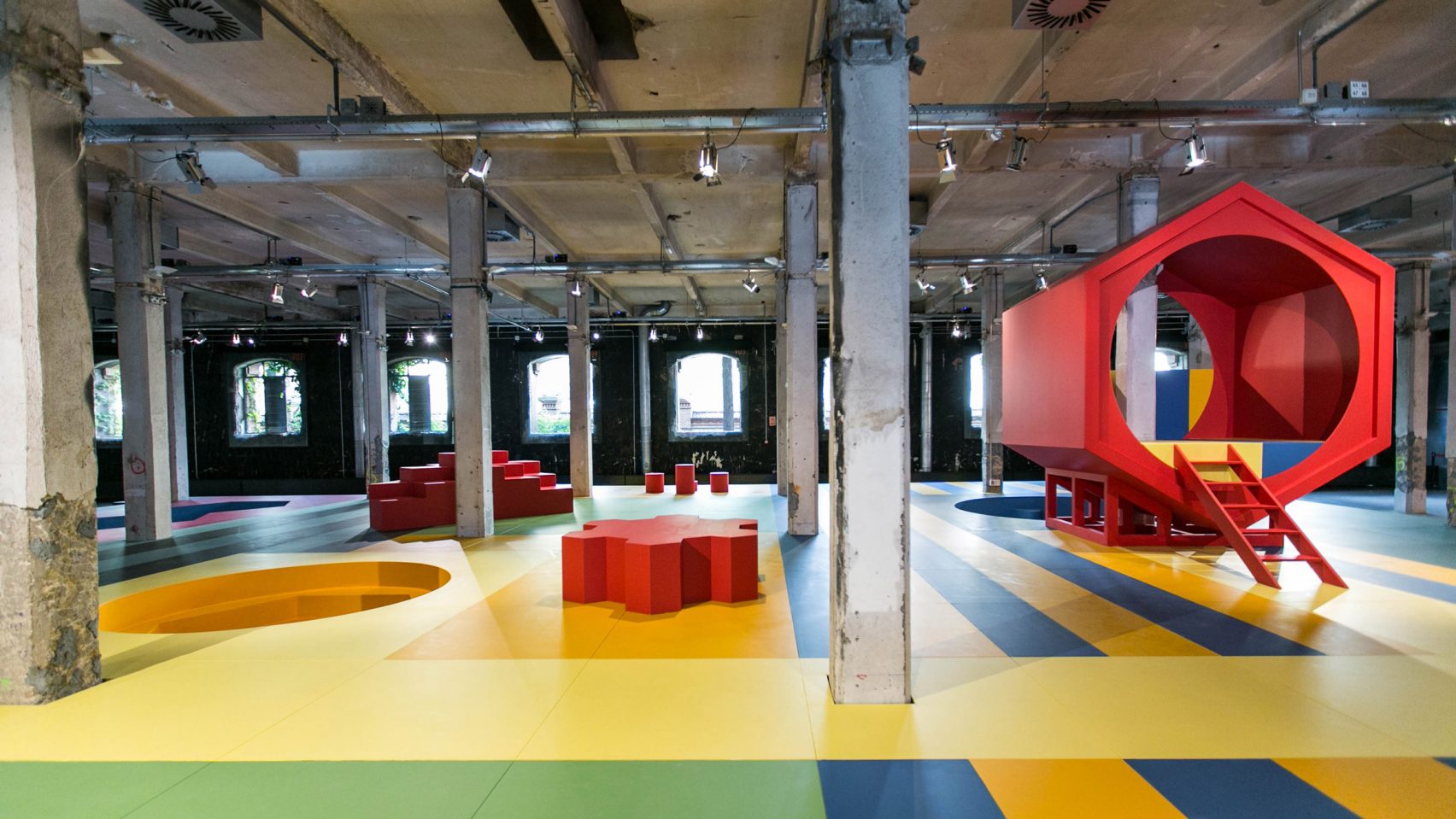 Colourful graphics decorate the forms, offering a striking contrast with the industrial architecture of the old slaughterhouse building. The colour palette, with its bold shades of red, yellow, green, blue and black, references postwar graphic design.