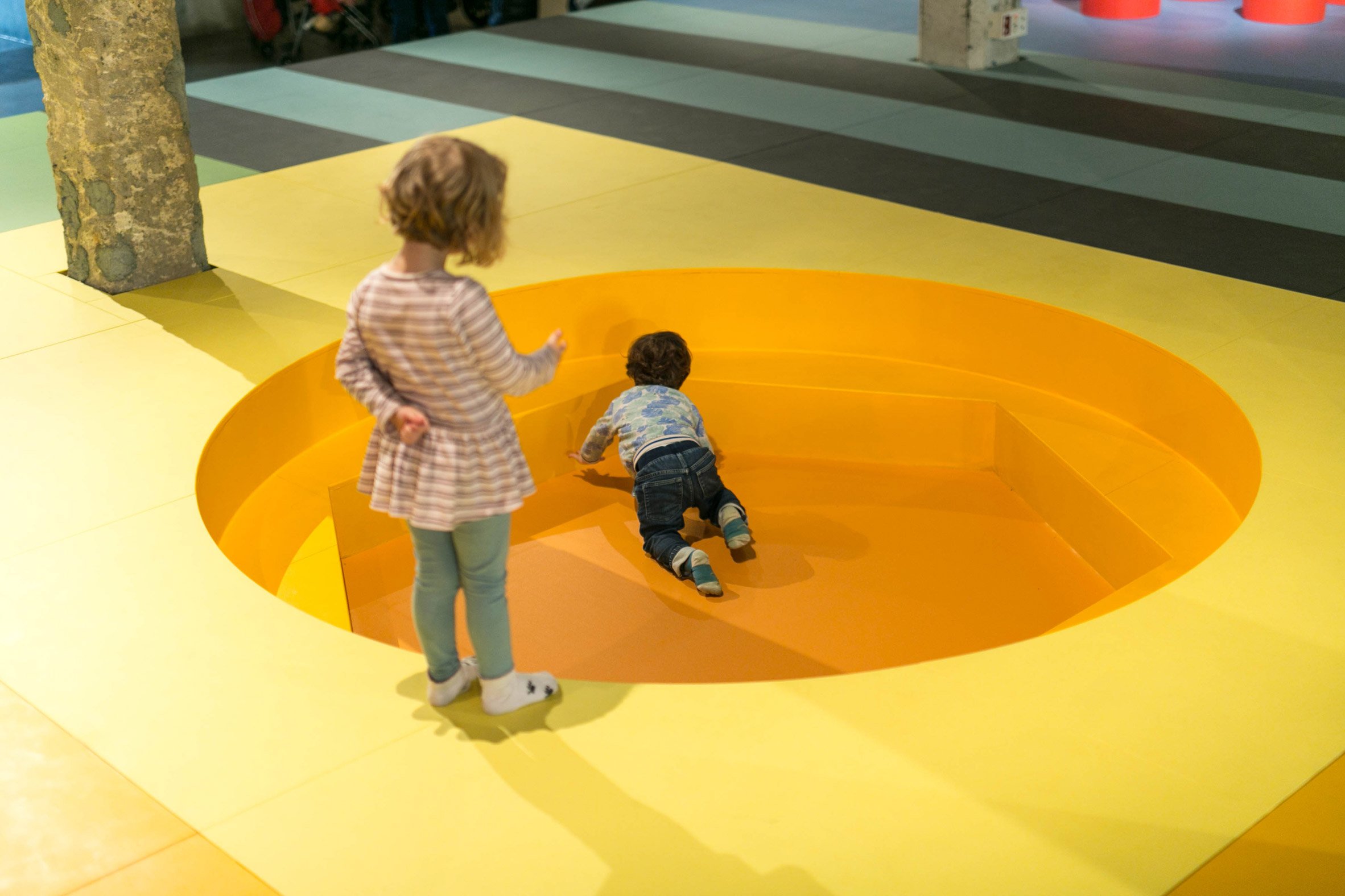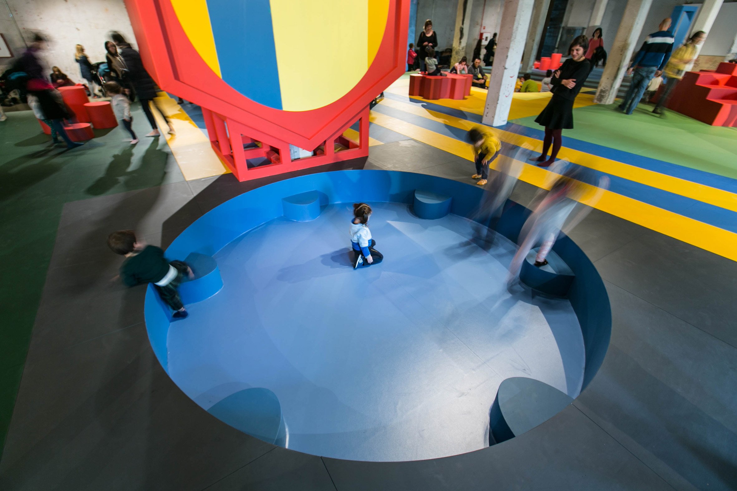 The design comprises a large colourful patterned floor dotted with objects and openings that invite children to run, jump, hide and climb.