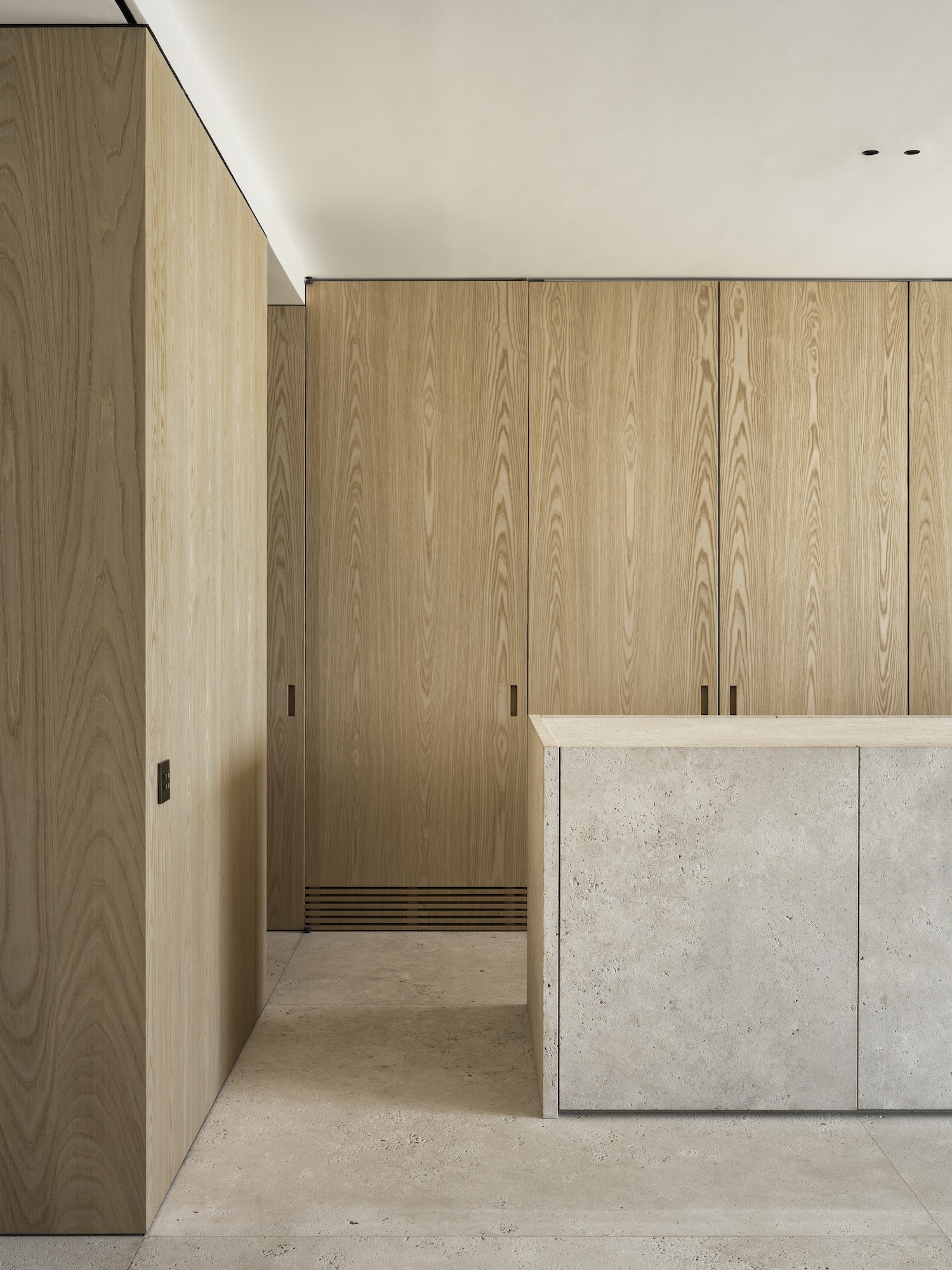텍스처드 플라스터 벽면은 마치 바다가 시간에 따라 다른 색을 띠듯이, 내부에서도 빛의 흐름에 따라 다양한 표정을 만들어낸다. 밤나무 마감은 강한 햇빛을 부드럽게 흡수하고 반사하며, 실내 분위기에 따뜻한 균형감을 더한다.