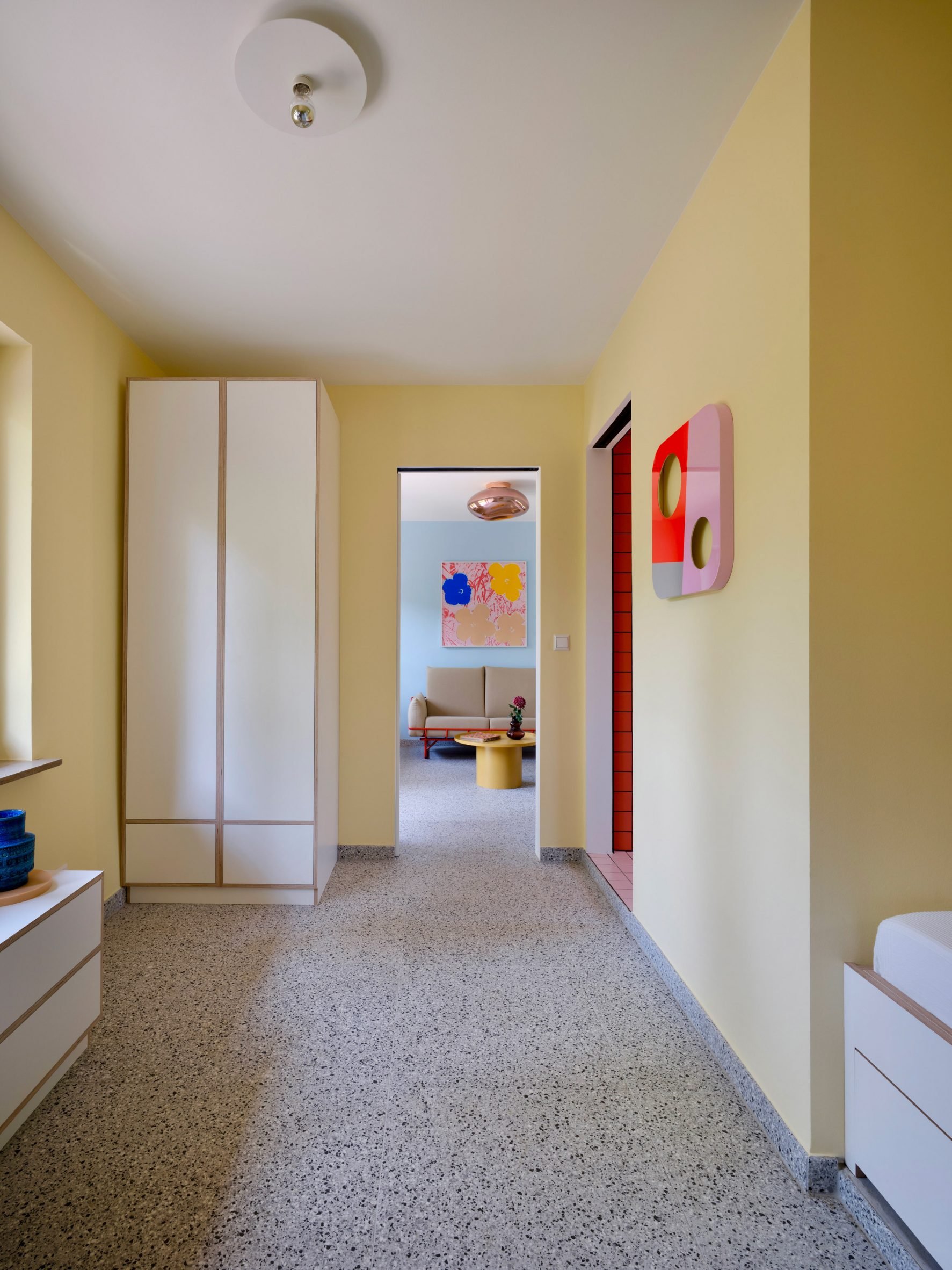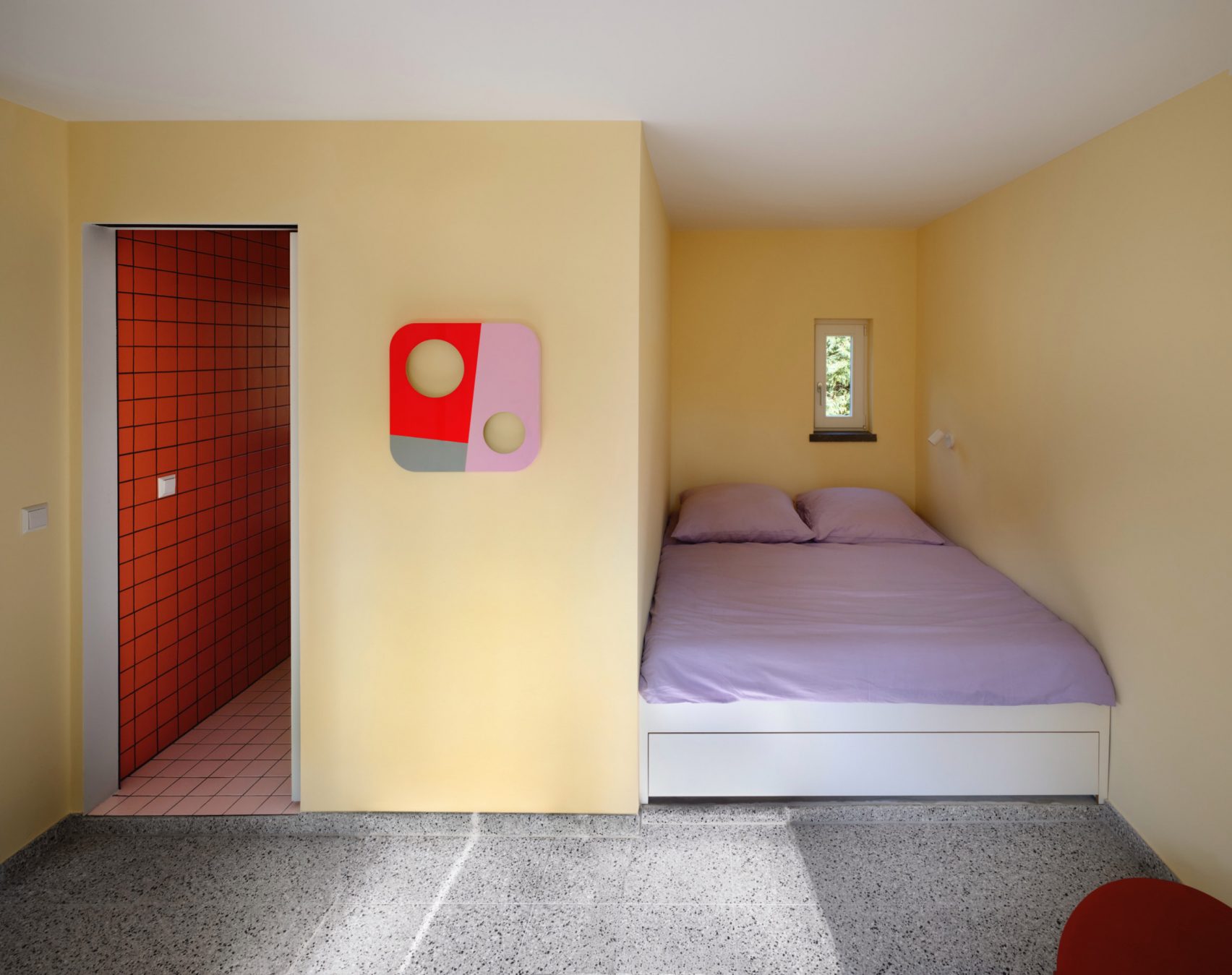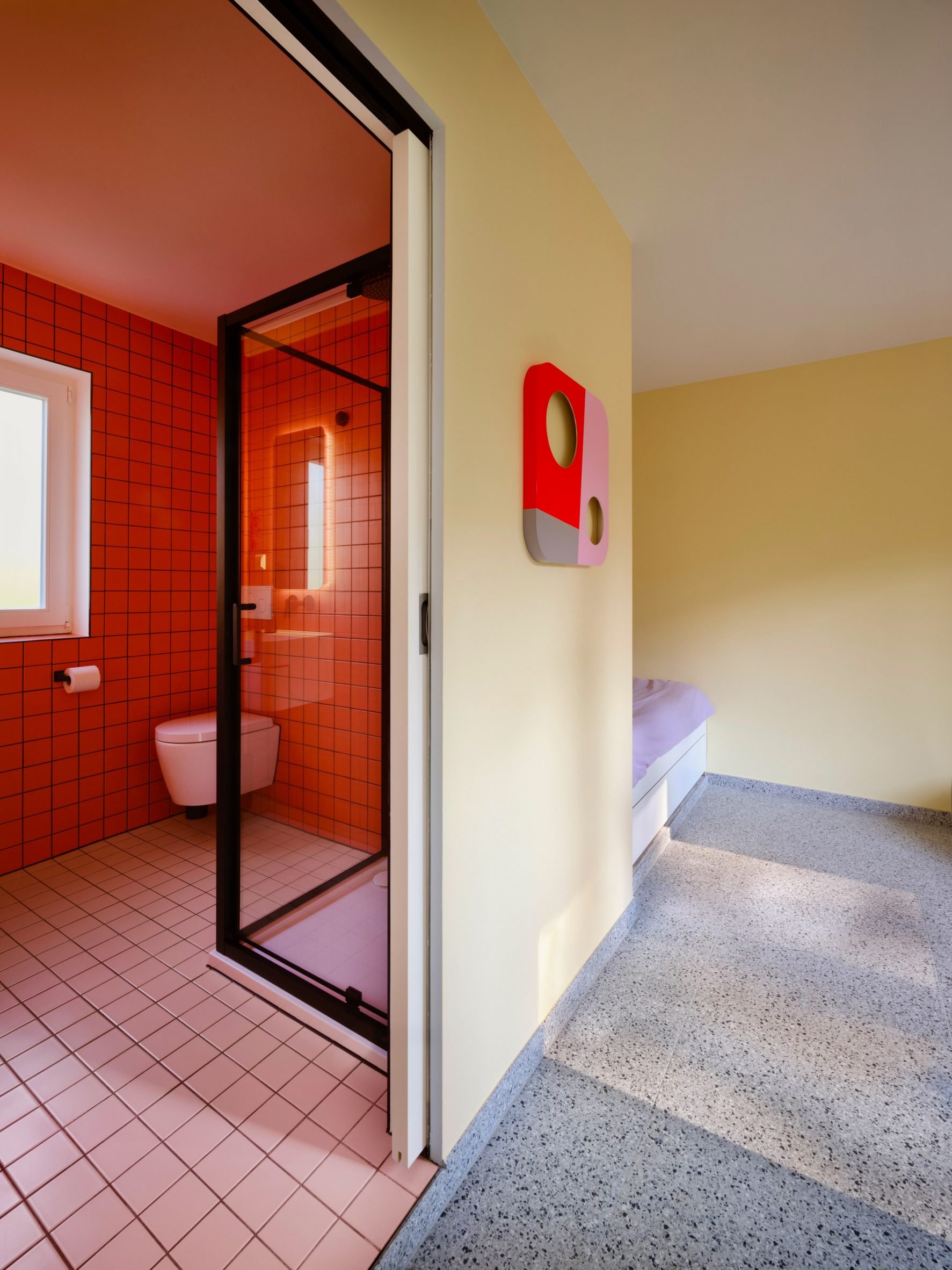 욕실은 강렬한 오렌지색 타일과 블랙 메탈 프레임의 샤워부스로 구성되었으며, 침실은 부드러운 옐로우 톤과 보라색 침구를 조합해 편안한 분위기를 연출했다. 색상의 대비를 통해 공간의 개성이 뚜렷하게 드러나며, 시각적으로도 흥미로운 요소를 제공한다.